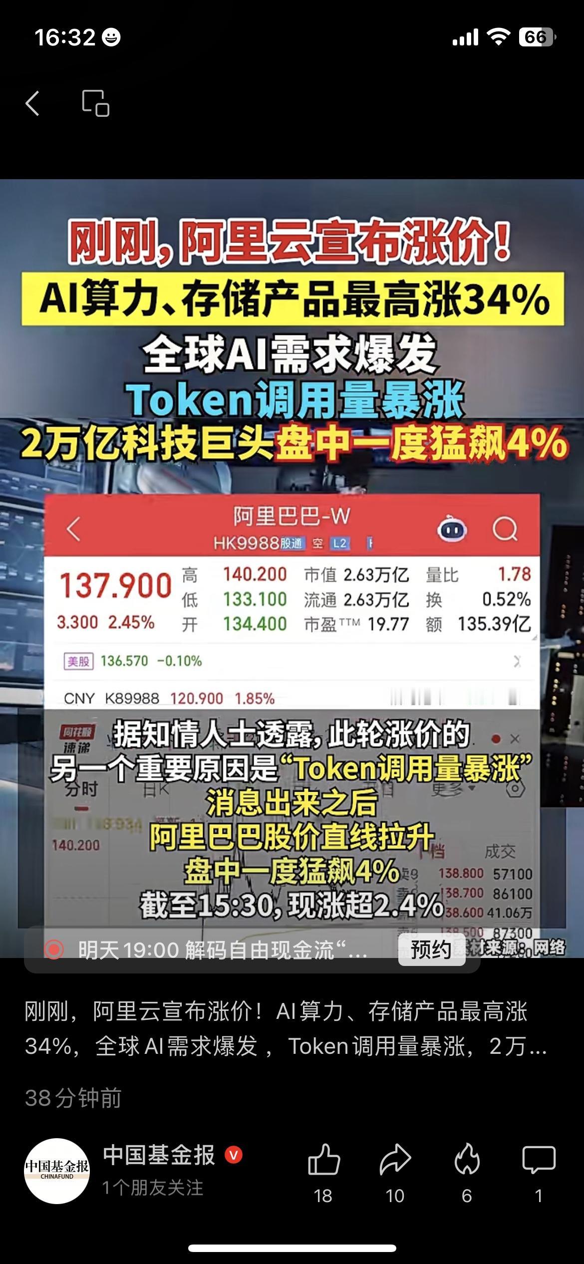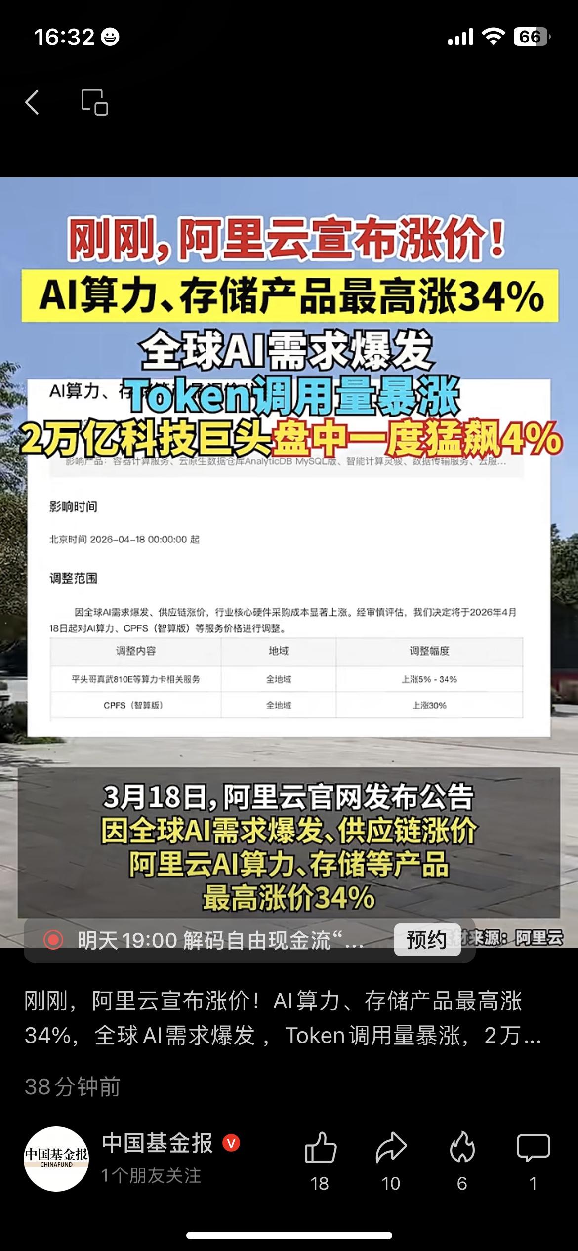 突发!阿里云宣布涨价,AI算力最高涨34%,2万亿科技巨头股价应声拉升! 市场有风险,投资需谨慎;不构成任何投资建议。 3月18日阿里云官网发布公告,自2026年4月18日起,对AI算力、存储等产品进行价格调整。 其中平头哥真武810E等算力卡产品上涨5%-34%,文件存储产品CPFS(智算版)上涨30%,原因是全球AI需求爆发、供应链涨价、Token调用量暴涨。 消息传出后,阿里巴巴股价盘中一度猛飙4%,截至收盘涨超2.4%。 AI算力涨价会传导到我们日常使用的AI产品吗? 阿里云涨价 AI算力 科技财经 存储芯片AI算力行情