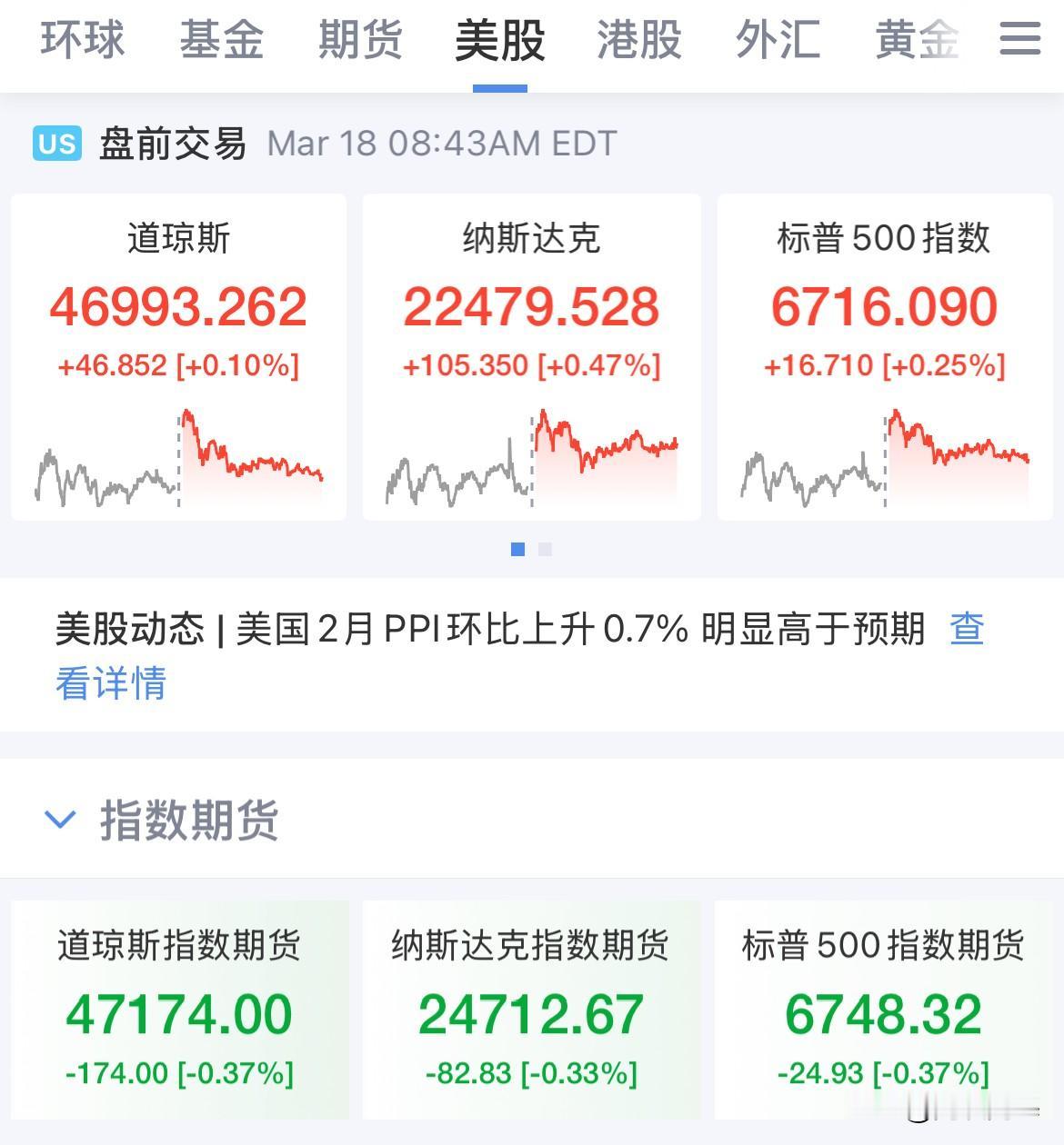 美联储凌晨怎么干!不降息!美国2月PPI数据全线超预期,叠加原油期货全线拉升,美国通胀抬头,会陷入滞胀吗?美元直线拉升,现货黄金重挫,美股盘前三大指数全线走低 美国2月生产者价格指数全线飙升,高于预期,市场预期2.9%,实际飙升至3.4%,美以袭击伊朗,原油价格暴涨,通胀抬头已经是既定的事实了, 交易员在数据发布之后减少了对美联储在2026年降息的押注,美联储降息预期回落,美元指数走强,资金避险冲进美元资产、美债, 美股盘前三大指数全线走低,道指期货、纳指期货、标普500指数期货全线跌幅超0.3%,难搞了!