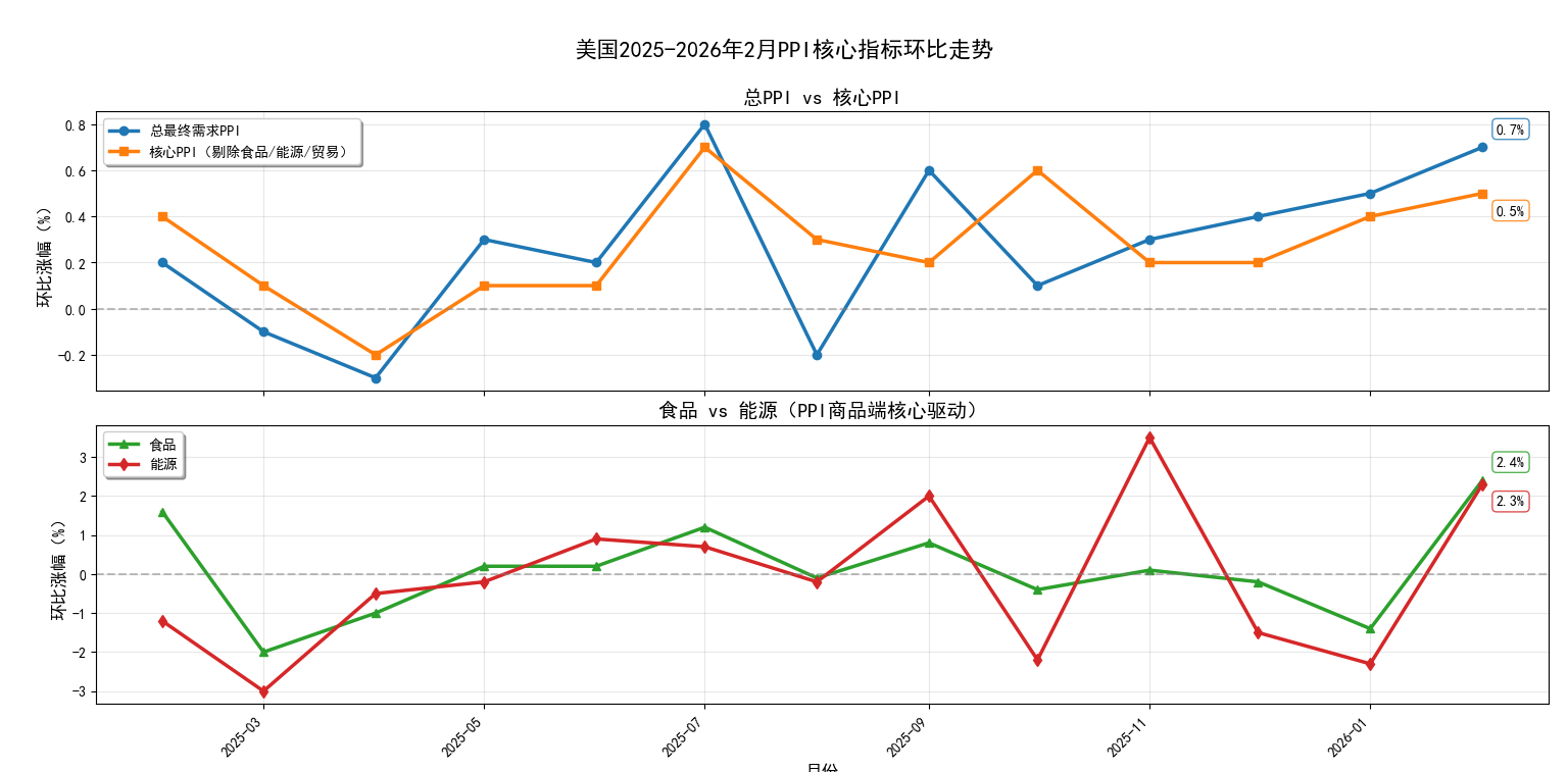 核心通胀指标同样表现强劲。剔除食品、能源的核心PPI环比上涨0.5%,同比上涨3.9%。剔除食品、能源及贸易服务的核心PPI环比上涨0.5%,连续10个月上行,同比上涨3.5%。