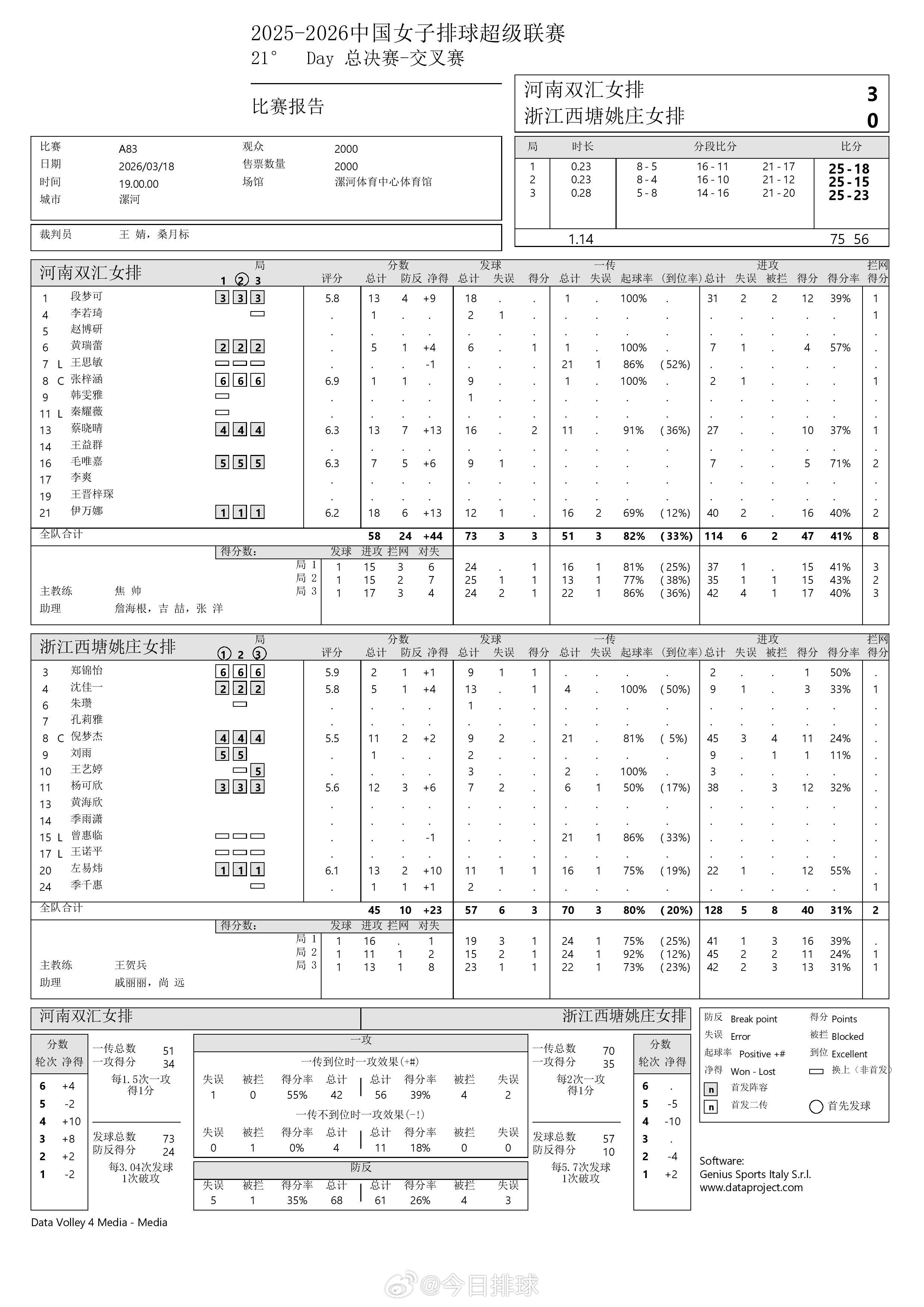 2025-2026中国女排超级联赛 A级5~8名排位赛之交叉赛首回合 河南3-0浙江 得分统计。