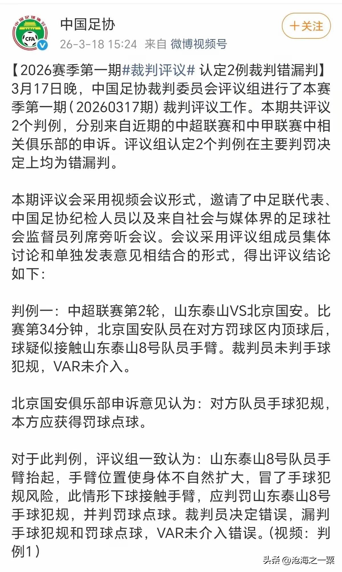 马德鲁加的手球,怎么看都是打在高准翼的头上。买买提江看不见手球情有可原,但视频裁判唐顺齐也没有任何表示,这就有点奇怪了,如果是手球,不管是有意或者无意,唐顺齐起码要有提示吧,难道两个人都被泰山队收买了?不管怎么说,裁判委员会值得表扬,不再给模棱两可的答案。