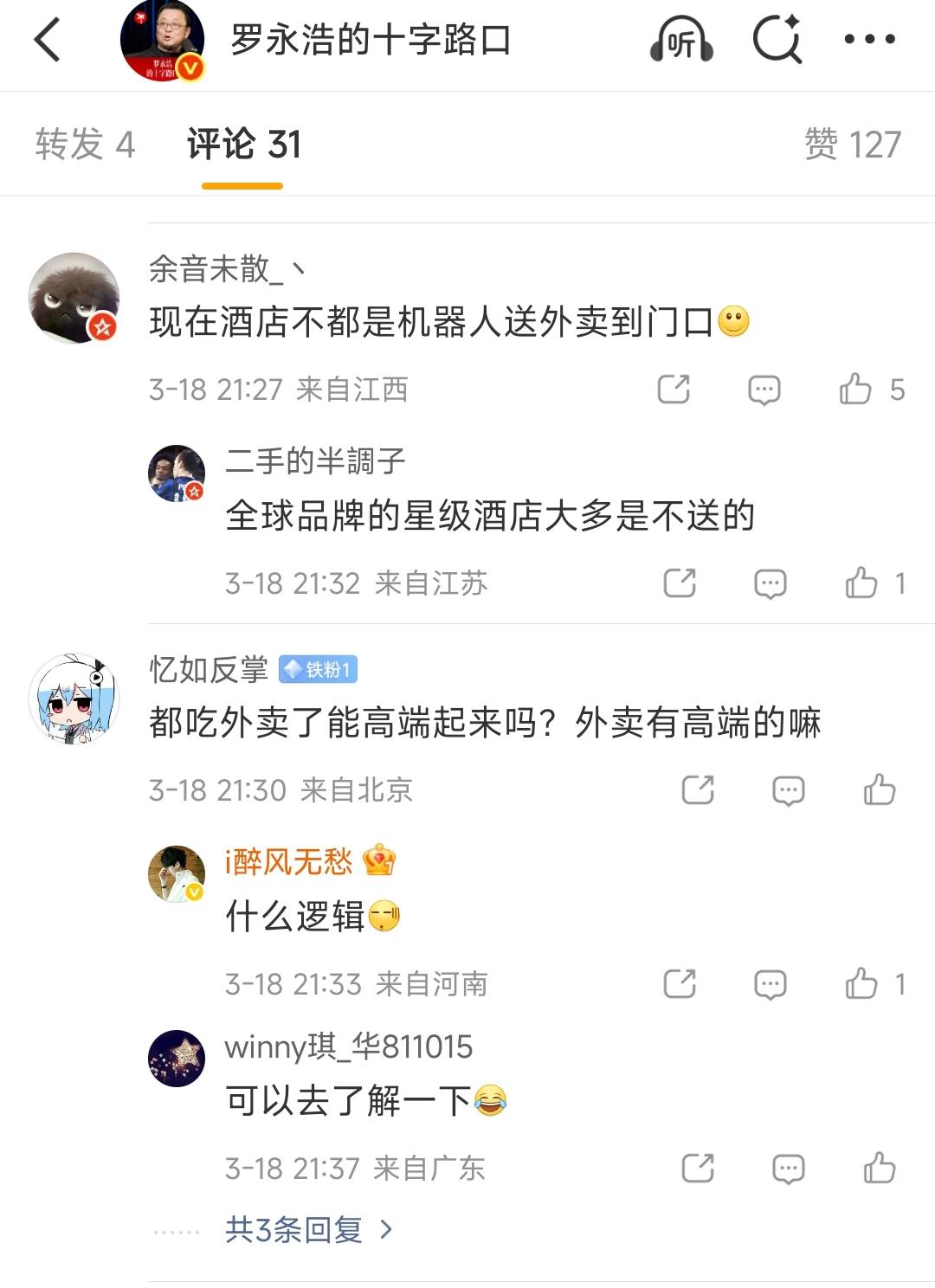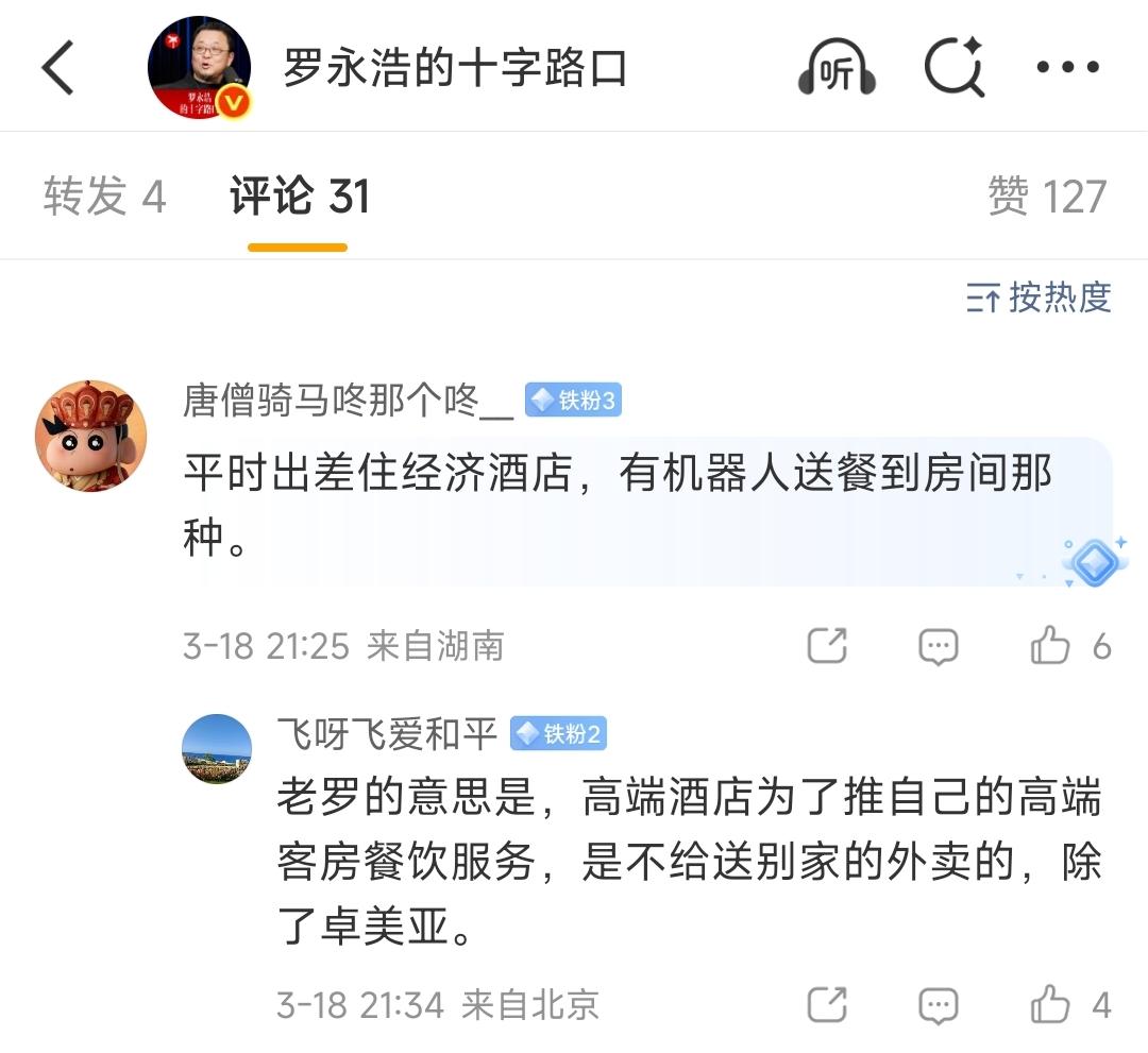 是我见识短了。 看老罗罗永浩,发了个住酒店送快递的消息。 罗永浩好像是惊叹于自己去广州住酒店,酒店居然派人把外卖送上楼,让老罗开心得不得了。 我心想,现在外面住酒店不都有机器人把外卖送过来吗? 后来看评论区才知道,高端的酒店都不送外卖的,只有平价和经济型的酒店才让外边的外卖进来。 人家带星级的酒店好像都不允许外卖。 难怪老罗这么开心呢,有钱人也不容易啊。