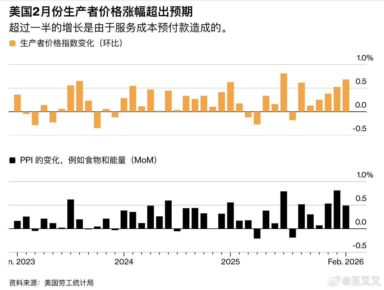 美国最新公布的生产者物价指数PPI显示,企业层面的通胀压力在2月意外加速。美国劳工统计局公布的数据表明,2月PPI环比上涨0.7%,明显高于市场预期的0.3%,也高于前一个月的0.5%。剔除食品和能源后的核心PPI环比上涨0.5%,同样高于预期。同比来看,整体PPI上涨3.4%,核心PPI上涨3.9%。这表明在伊朗战争引发能源价格大幅上涨之前,供应链和企业成本端的通胀压力就已经开始抬头。