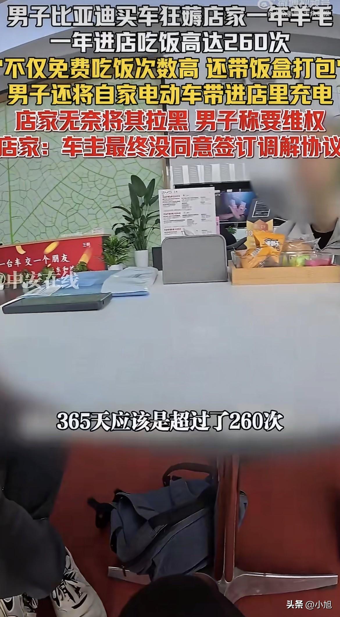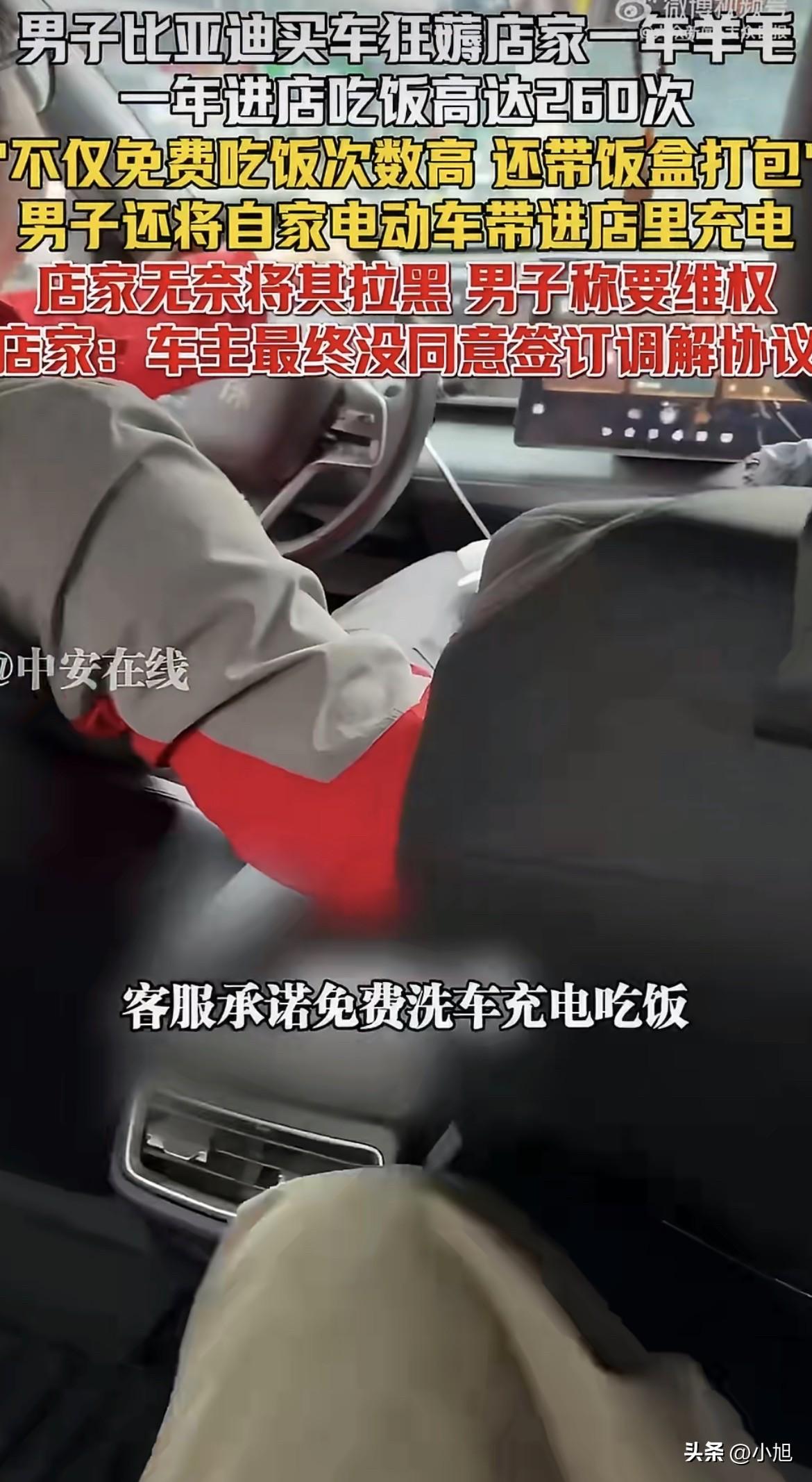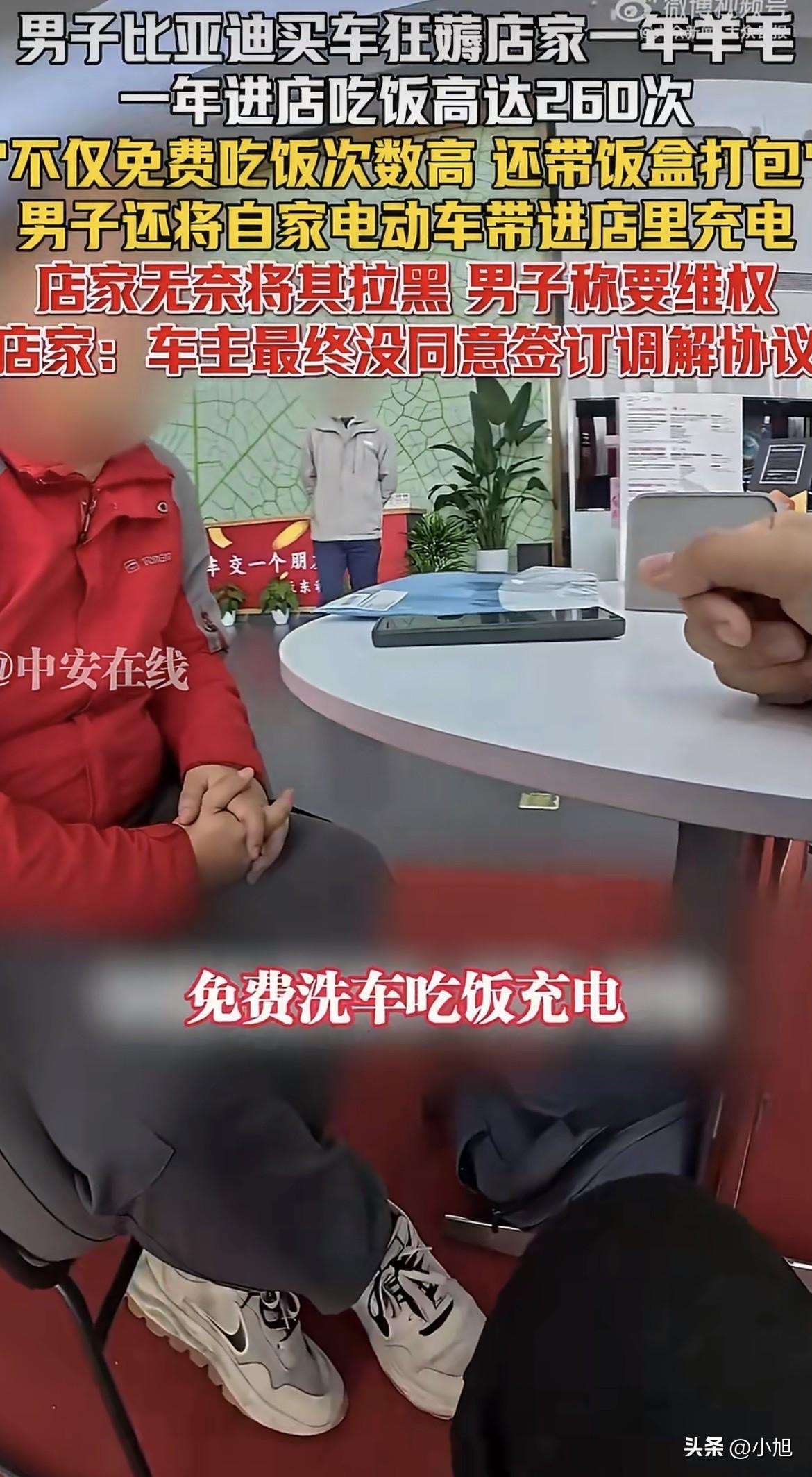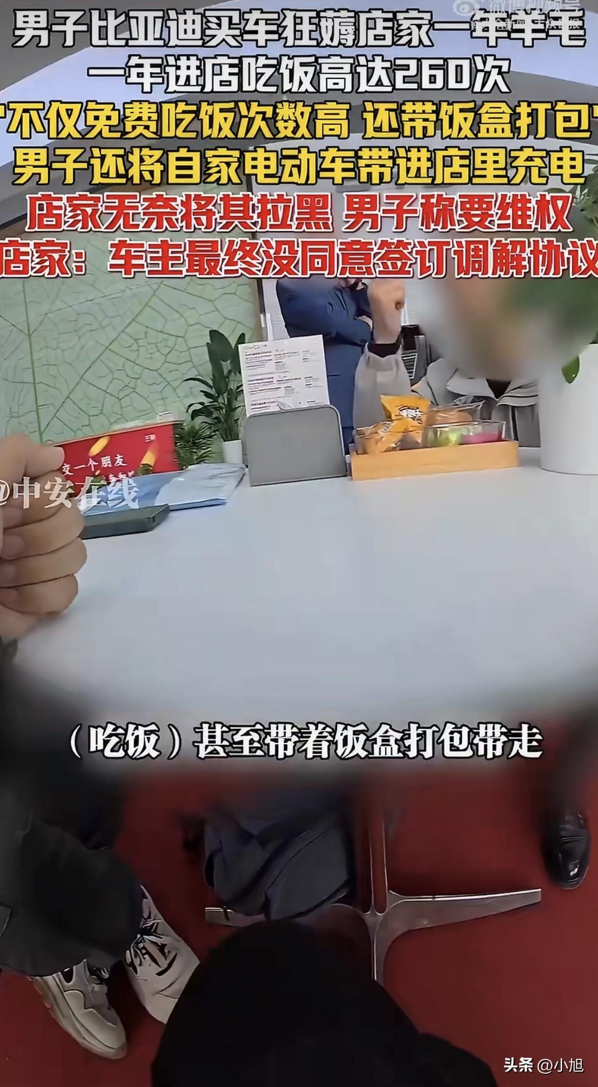 庞先生是跑滴滴的,去年在合肥一家比亚迪4S店买了台车。交车那天销售随口说了一句“以后常来,免费吃饭免费充电”,他听进去了,听得特别认真。 从那以后,这家4S店就成了他的第二个家。每天中午饭点儿准时出现,食堂阿姨都认识他了。吃完不算,他从兜里掏出提前准备好的饭盒,打包一份,晚上那顿也齐了。一年365天,他来了260多次。 4S店的工作人员私下给他起了个外号,叫“打卡王”。2025年一共248个工作日,他跑得比上班的都勤。有人给他算过一笔账,一顿午饭算15,洗车20,充电50,一天下来85,260天就是22100块钱。一台车的首付,硬是让他吃回来了。 光蹭饭也就算了,他连家里的电动自行车都不放过。把那辆两轮电动车塞进汽车后备箱,拉到4S店,充的是店里的电,用的还是员工专属充电区。员工私下提醒过他好几回,他全当耳旁风。 店里的人私下说,其实刚开始也没想计较,毕竟开4S店的,谁还在乎那几顿饭几个电。但问题是,这人来得太勤了,说话还特别冲。 今年3月3号,事情闹大了。那天庞先生又来了,这回直接把车停在新车交付区充电。那是人家卖新车的地方,新车进进出出,他车往那一杵,销售顾问让他挪一下,他不挪,张嘴就是一句“狗拿耗子多管闲事”。 话赶话的,两个人从门口一直吵到办公室,推推搡搡动了手。警察来了,调解,赔了500块钱。 第二天,庞先生拿着和解协议,站到4S店门口,举着纸喊“维权”。来看车的人都懵了,不知道的还以为店家欺负人。 店里的人这才翻了翻记录,发现光是报警,这老哥就报了不下6回。充电断电,报警。店员拍他视频,报警。但凡有点不如意,他就打110。 店家实在扛不住了,把他拉黑,门都不让进。 庞先生委屈坏了,找了个粉丝几百万的汽车博主,想让博主帮他出头。博主一开始也同情他,跟着去了店里。 结果店里的销售总监把记录一翻:去年到店就餐260多次,自带饭盒打包,电动自行车带进来充电,报警报了十几回,新车交付区占着不走,骂员工骂得很难听。博主听完,扭头就走,说这事儿我管不了。 警察也来了,问庞先生到底想干啥。他说他手里还有4张纸质保养券,要求店家恢复服务,或者折现。 店家也松了口,说行,保养券折成2000块钱,再帮你对接另一家4S店,以后你去那儿保养,别再来了。庞先生当场点头。 结果到了签协议的时候,他突然反悔了,死活不签字。警察懵了,博主也懵了,问他到底要什么,他支支吾吾说不出来。 后来有人扒出他的正脸照,开的确实是比亚迪秦,跑滴滴用的。有网友评论说,这老哥是把4S店当成滴滴司机的免费食堂了。 其实这件事最让人琢磨不透的,不是他蹭了一年饭,也不是店家把他拉黑。而是最后那一刻,明明店家已经让步了,折现、换店、啥条件都答应了,他为什么突然反悔? 有人说他是想多要一点,有人说他是咽不下那口气。但还有一种可能——他可能真的觉得,自己没错。 在他的认知里,销售说了免费,那就是免费的。他去吃饭、去充电、去洗车,都是理所应当的。至于一年去260次,那叫“离得近,图个方便”。至于打包带走,那叫“不浪费”。至于把电动车带进去充电,那叫“顺便”。 他不是在薅羊毛,他是在行使自己的权利。 4S店的销售总监后来说了一句话,挺有意思的。他说:“我们提供免费服务,是为了让客户感受到温暖,不是为了让客户把这儿当食堂。” 这句话点破了这件事最核心的矛盾——在店家眼里,免费是情分,是附加值,是维系关系的一种方式。但在庞先生眼里,免费是本分,是承诺过的,是必须兑现的。 两边对“免费”这两个字的理解,从一开始就不在一个频道上。 现在这事儿还在僵着。店家说不再调解了,法庭上见。庞先生说一定要维权到底。 你说这事儿,到底是谁不讲理? (信息来源:中安在线、南昌晚报、汽车节目《汽车315》车评人“暴走老常”、红星新闻)