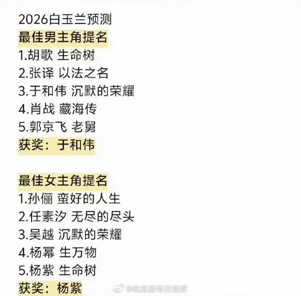 新一轮白玉兰获奖预测名单,如何评价?最佳男主角:于和伟《沉默的荣耀》最佳女主角:杨紫《生命树》最佳男配角:刘佩琦《老舅》最佳女配角:迟蓬《生万物》