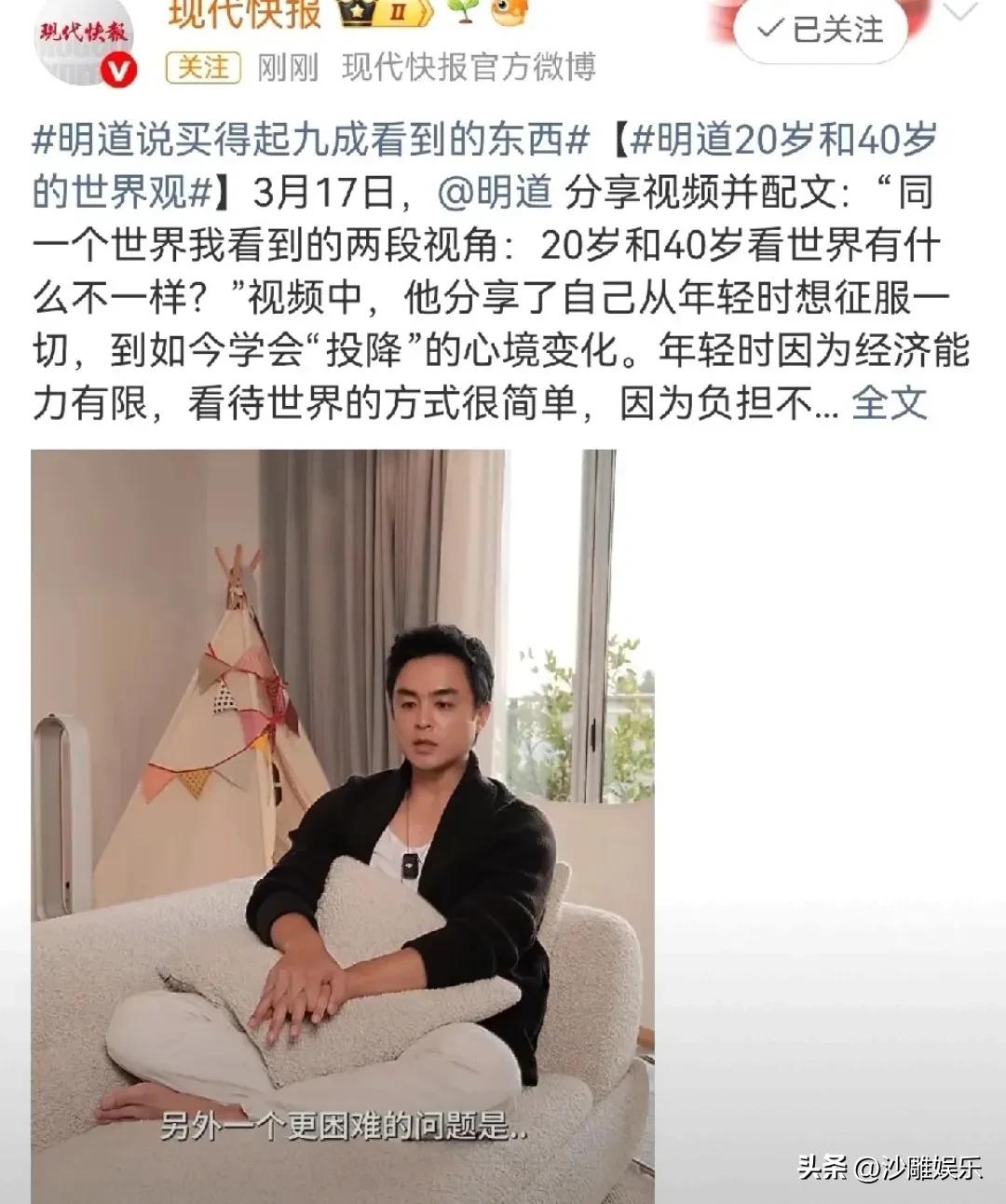 明道,有钱人的清醒! 3月18日深夜,“初代霸总”明道突然冲上热搜。 不是因为新剧,也不是因为绯闻,而是一段堪称“人间清醒”的采访被扒出——他直言现在看上的东西90%都能买回家,按理说这种“钞能力”得让人酸掉牙,但听完他20岁时的故事,网友们却沉默了:原来霸总也不是一开始就豪横的 。 20岁时的明道,揣着一肚子征服世界的野心,却被现实狠狠绊了一跤。那时候打国际长途,一分钟一美金,折合人民币八块钱。对于兜里没几个钢镚儿的年轻人来说,每次拨号前都得做半天心理建设:“这钱花出去,值不值?” 那时候看世界,完全是“观察者视角”——喜欢?那就多看两眼;买不起?拉倒,干脆不纠结。那种生活状态,被网友戏称为 “贫困式清爽”:欲望极简,烦恼归零。 可转眼到了46岁,钱包确实鼓了,烦恼却升级了。满大街100多件喜欢的东西,总不能全扛回家吧?他开始琢磨“买什么”比“能不能买”复杂多了。这种凡尔赛式的烦恼,换谁不得羡慕一句? 但明道的可爱之处在于,他有钱,却不被钱带着跑 。 如果你以为明道的家是那种金碧辉煌的“霸总样板间”,那就大错特错了。 最近他在上海的家曝光,直接把网友看懵了——一家四口租住在徐汇区一套90年代的老公房里,面积200平米左右,估值4000万,按理说也不便宜,但装修风格堪称“叙利亚战后风” 。 可仔细一看,这哪是毛坯房,简直是“低调的奢华”!客厅里那张通体雪白的沙发,看着像宜家爆款?错了,那是意大利定制的,15万;旁边那个像工厂货架的不锈钢电视柜,4万,还得从瑞士排队等半年 。 最搞笑的是,花了15万买回来的传世沙发,明道两口子根本不坐!俩人窝在旁边几十块钱的露营椅里,画面喜感拉满。网友辣评:“这就是传说中的‘沙发是买来看的,折叠椅才是灵魂’?” 更绝的是,为了买那个4万块的电视柜,老婆一开始死活不同意。明道居然拿了一个全世界罕见的限量款爱马仕包包做“等价交换”,才换来老婆点头——而这个包的尾号,正好是老婆的生日。这哪里是消费?这是用魔法打败魔法! 但真正让网友们破防的,不是他多有钱,而是他对生活的通透。 生了孩子之后,明道把 “投降” 挂在了嘴边。先向自然规律投降——太阳东升西落,四季轮回,谁也控制不了;再向他人意志投降——哪怕是最亲近的人,你也没法完全掌控对方的想法 。 他甚至放出狠话:不会留一毛钱财产给儿子! 理由很奇葩:“如果留5个亿给他,他染上赌瘾一晚上就输光了;如果一分不留,他也不见得会穷困潦倒。我当年最快乐的时光,就是没钱但快有钱的时候。直接给钱等于剥夺他‘闯关’的快乐。 ” 回看明道这20年:20岁想征服世界,30岁觉得自己蛮获胜,40多岁开始琢磨什么值得“投降”。 他学会了不为低频需求花钱——家里餐桌只配四张椅子,因为“没准备让别人来”;也学会了为高频享受买单——沙发要最舒服的,因为天天坐 。 有网友偶遇他在公园陪妈妈,轮椅旁的明道笑得像个普通中年男人,眼里有光 。那一刻你会发现,真正的“钞能力”,不是买下全世界,而是终于能按自己的节奏生活。 所以,当明道说出“9成看上的东西都能买回家”时,我们羡慕的不是他有钱,而是他 “有钱之后,依然清醒”。