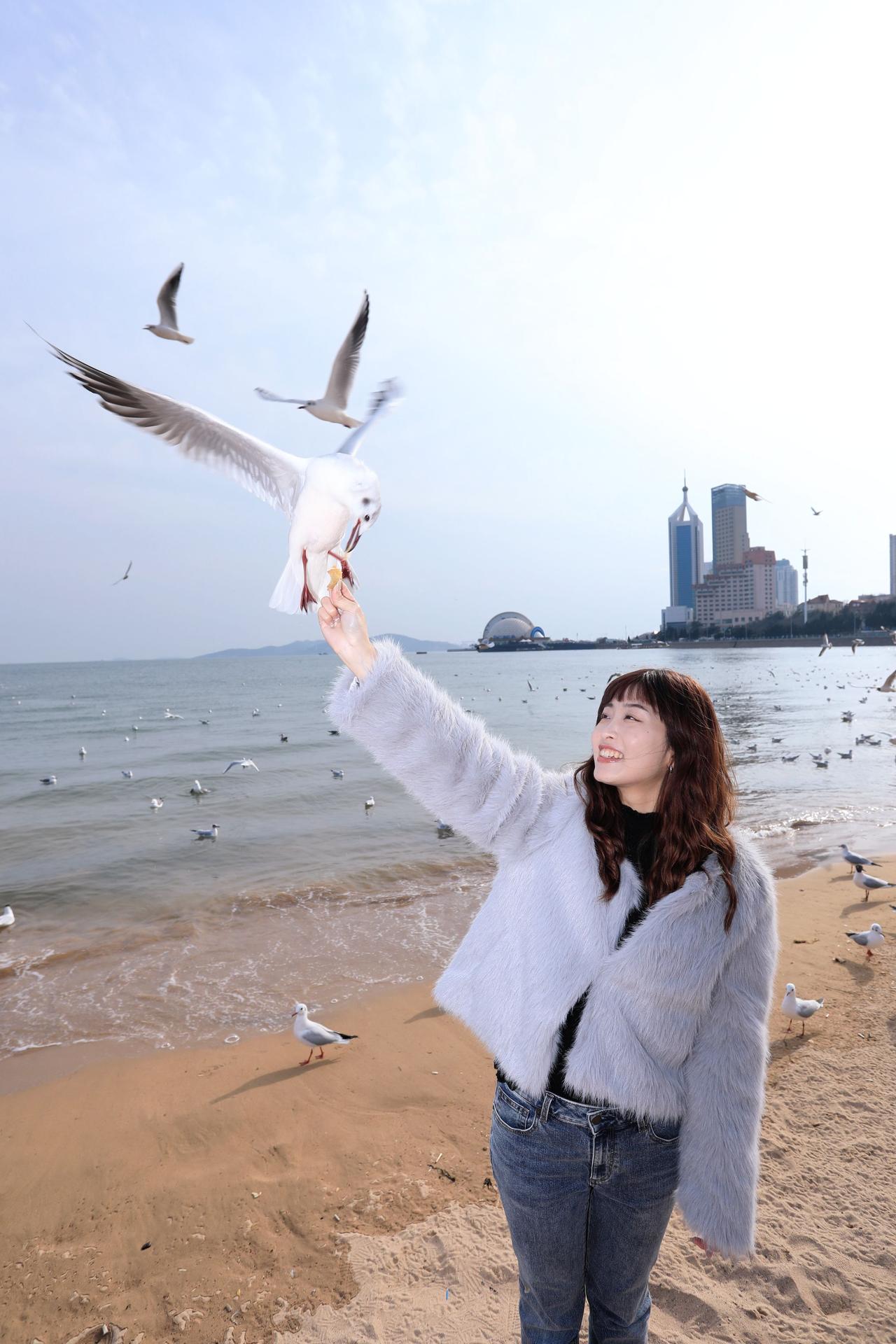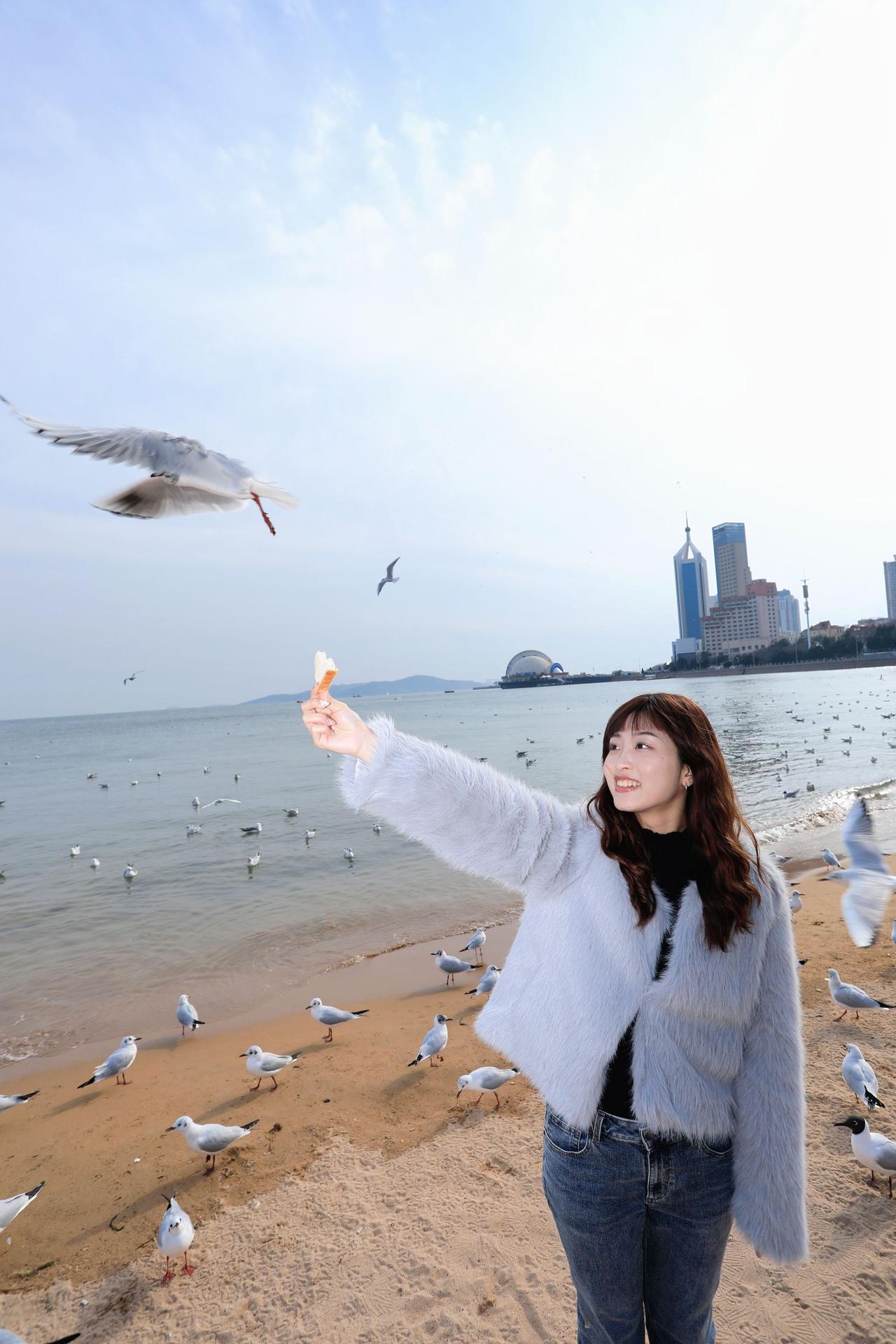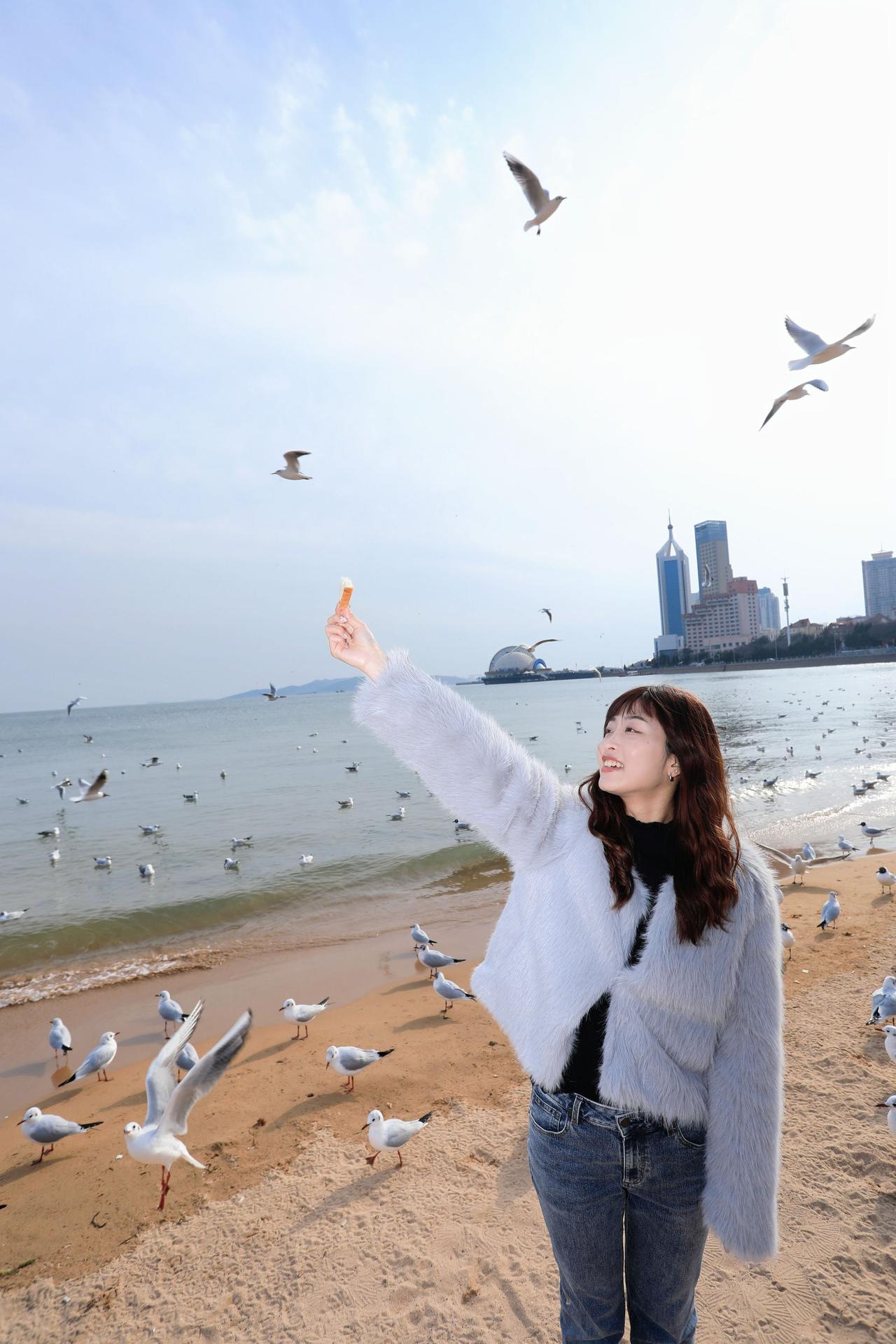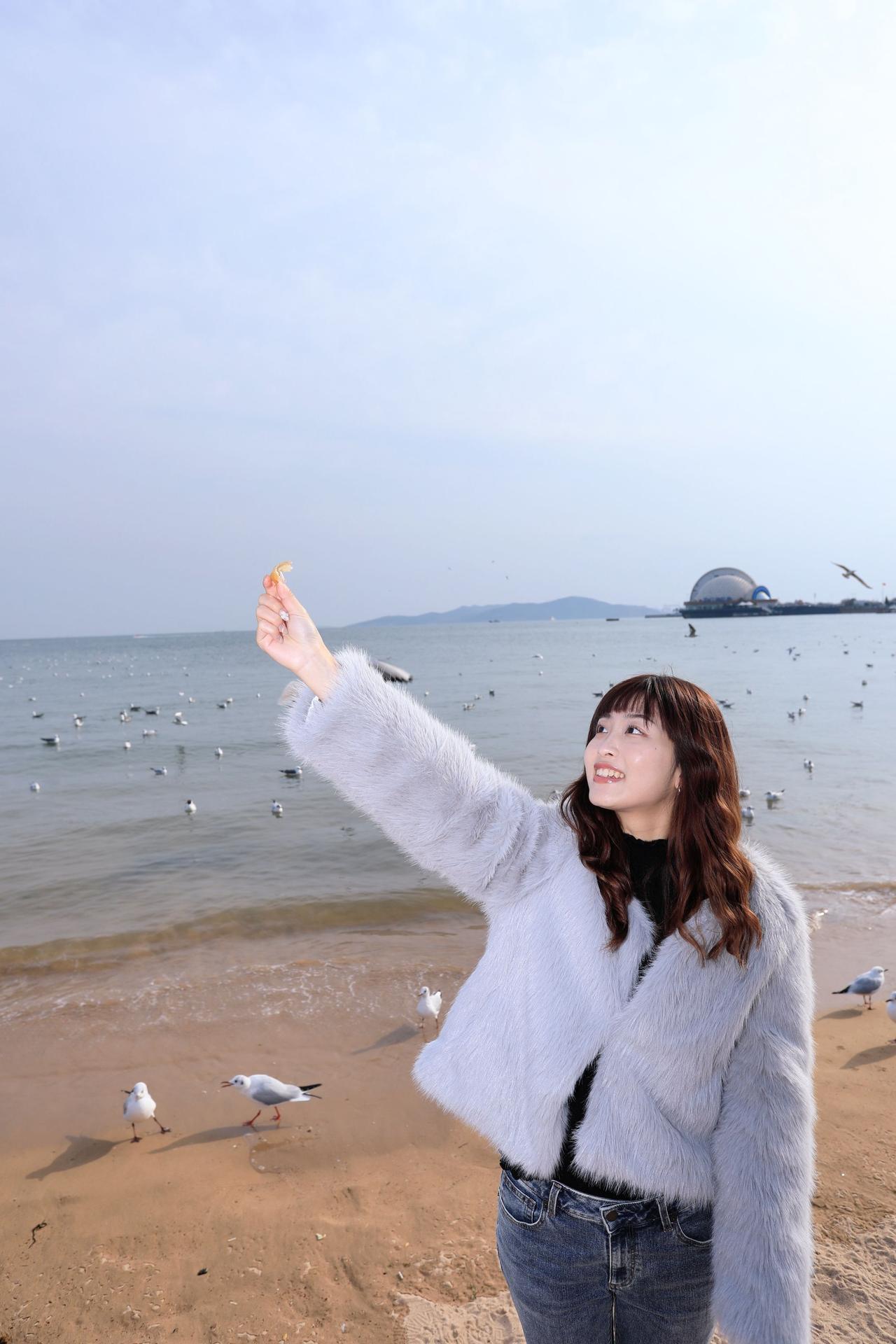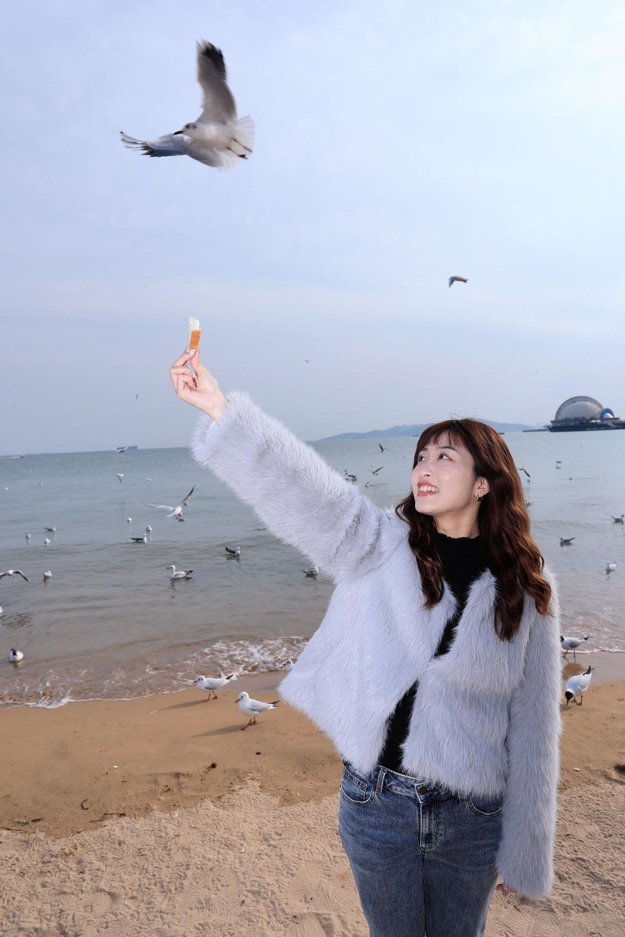 人像摄影约拍跟拍青岛海边 栈桥海鸥 台湾女孩在大陆 台湾女孩在青岛喂海鸥原创原图直出照片