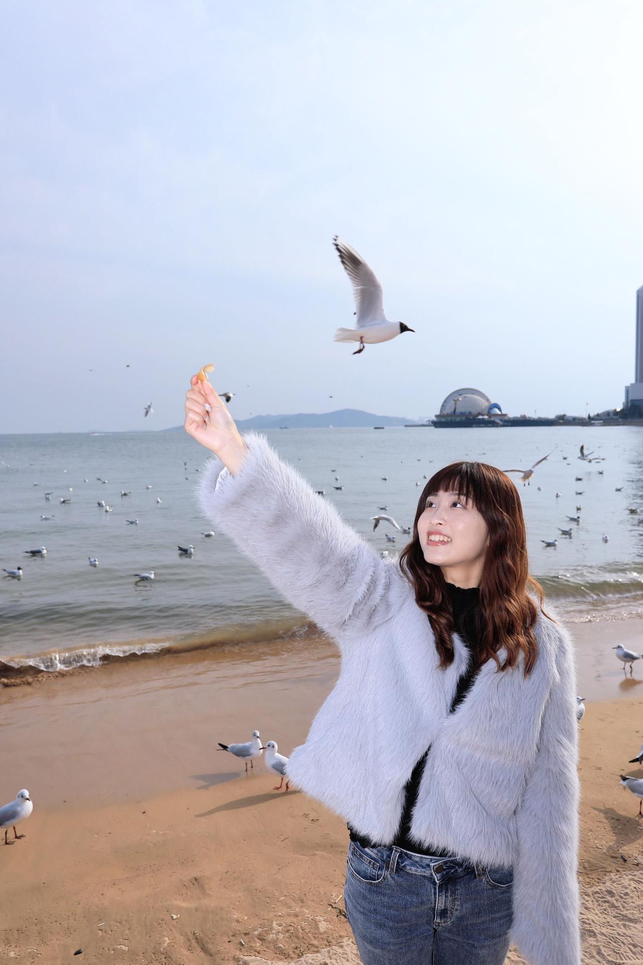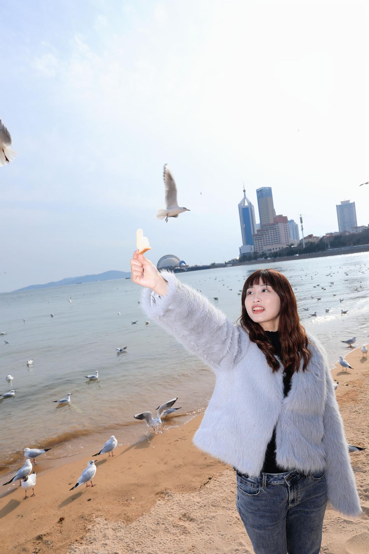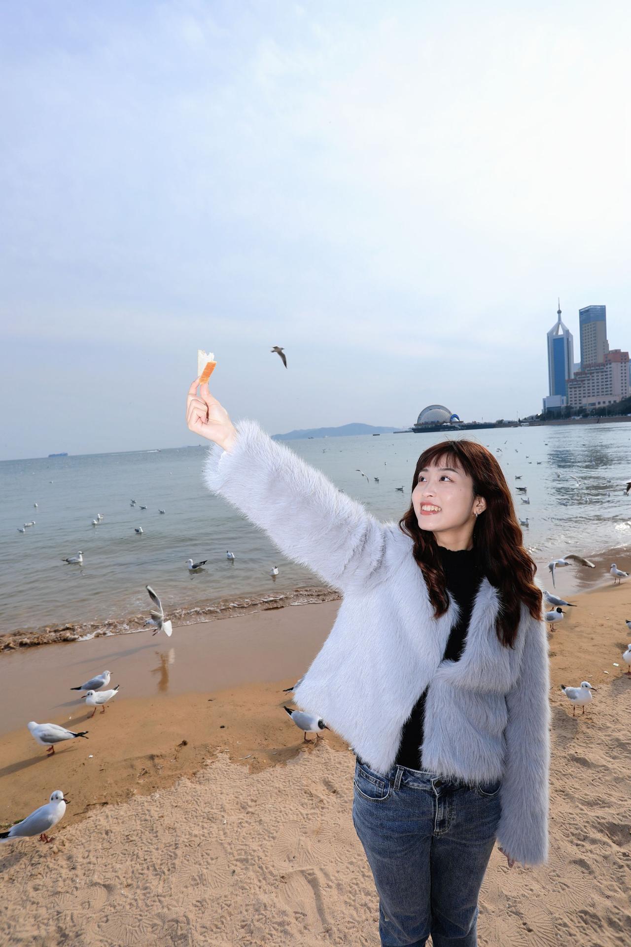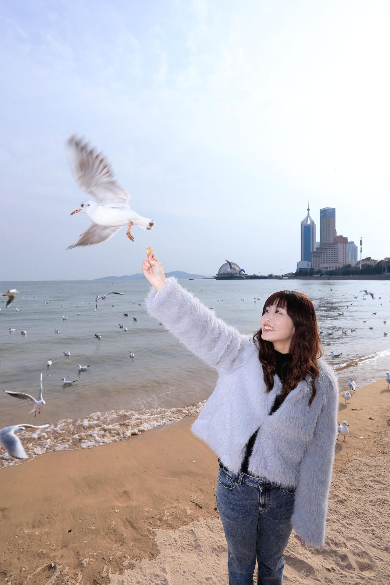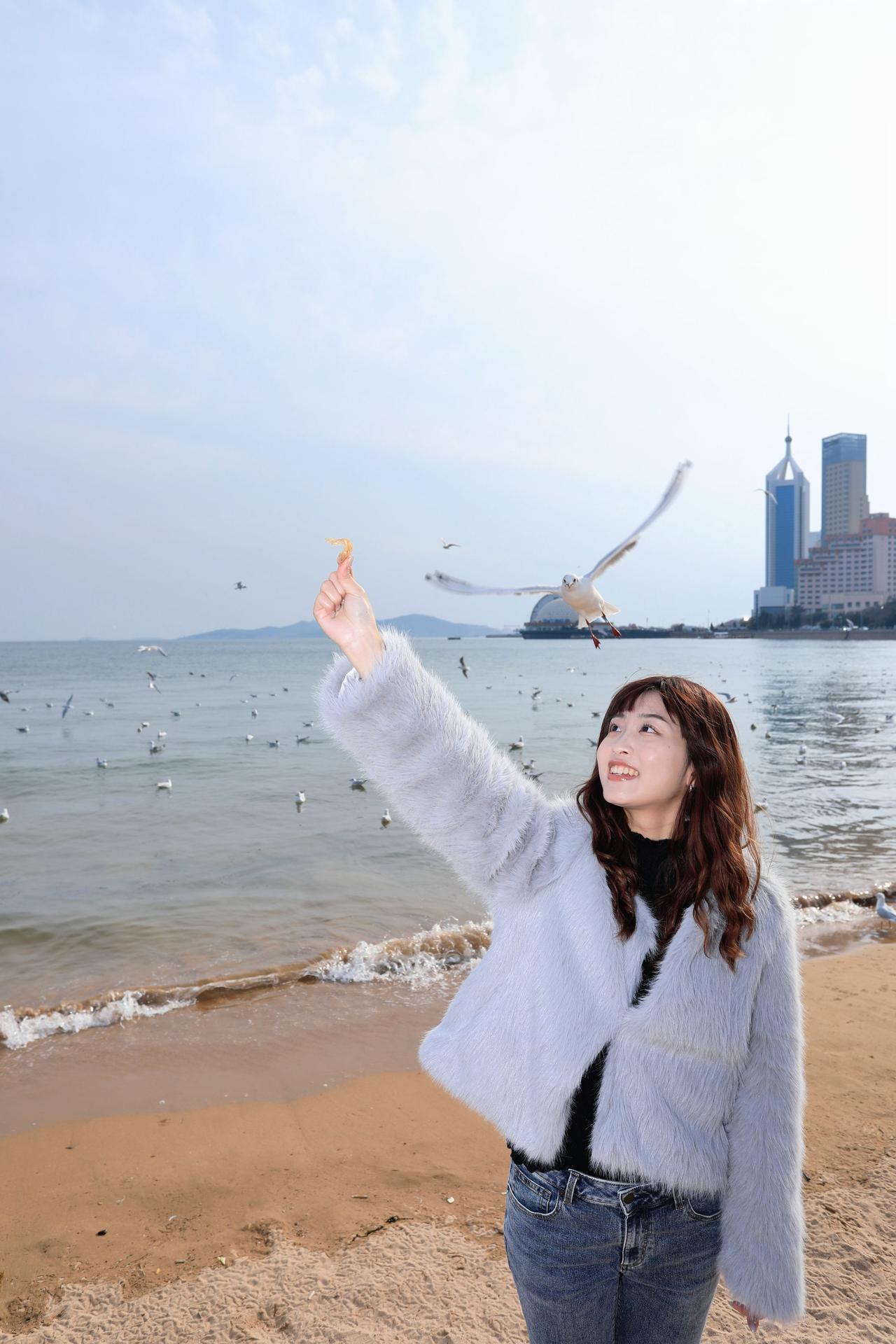 人像摄影约拍跟拍青岛海边 栈桥海鸥 台湾女孩在大陆 台湾女孩在青岛喂海鸥原创原图直出照片