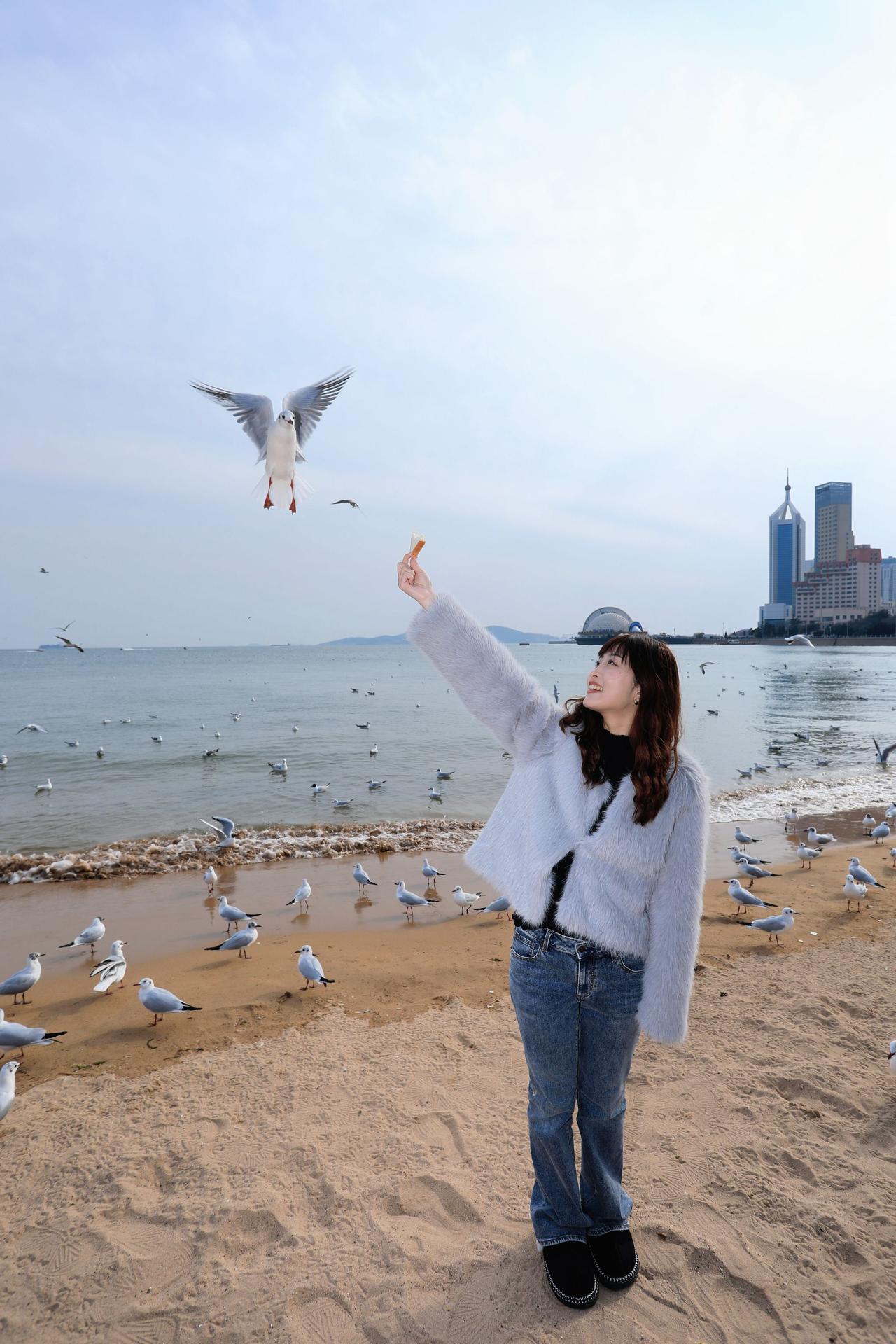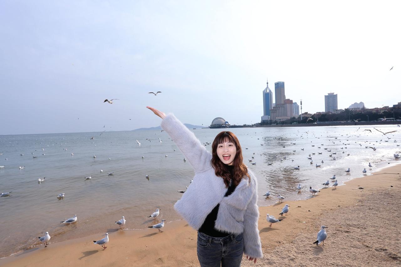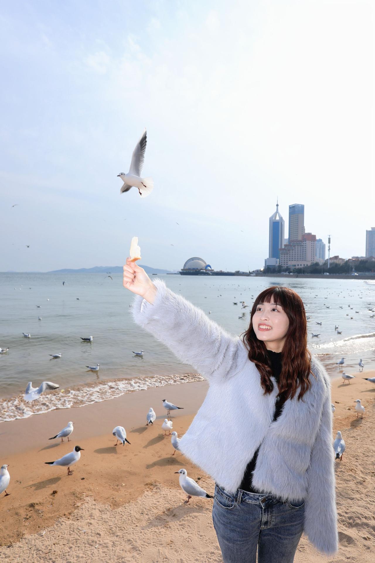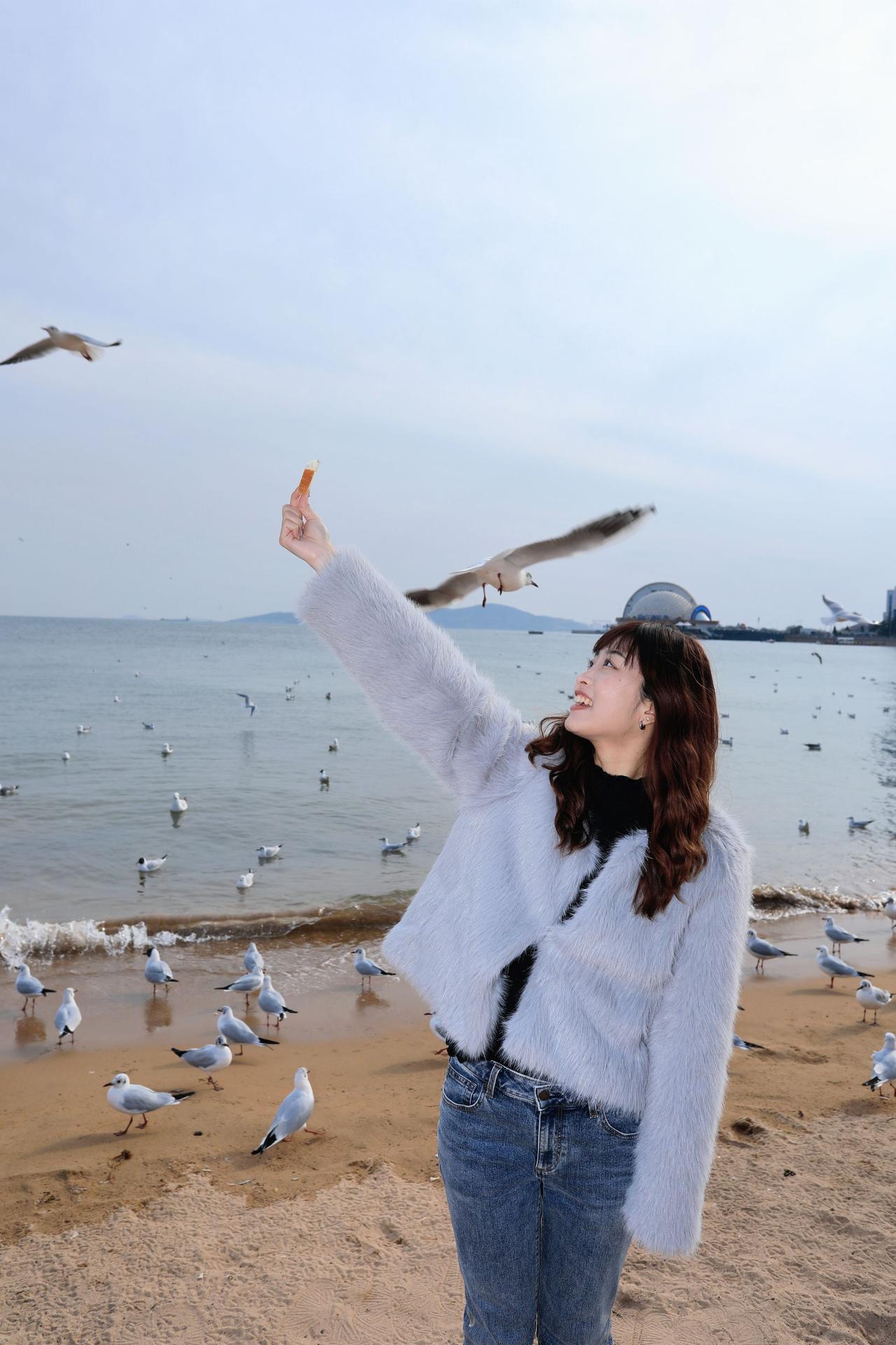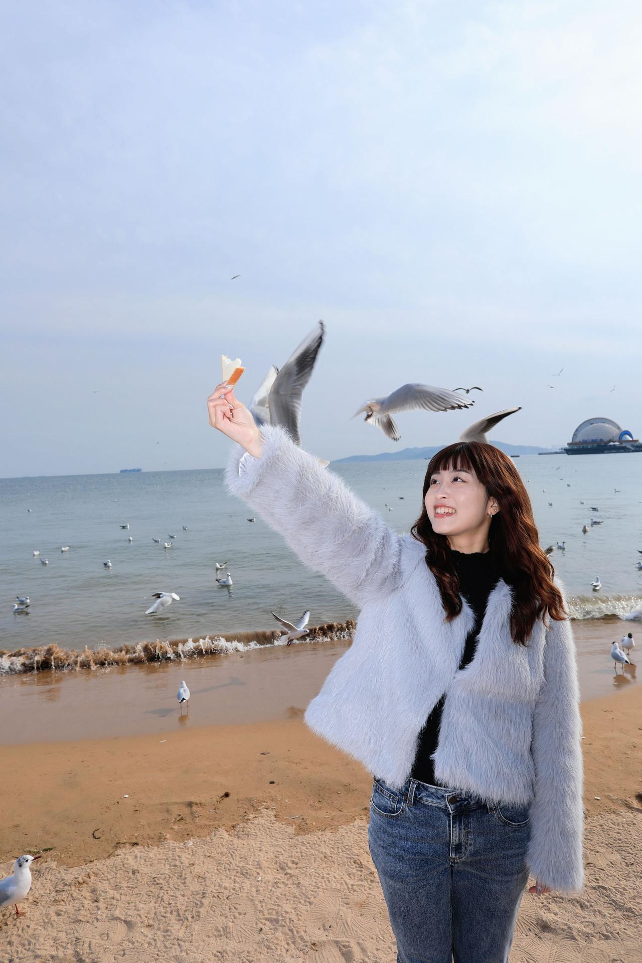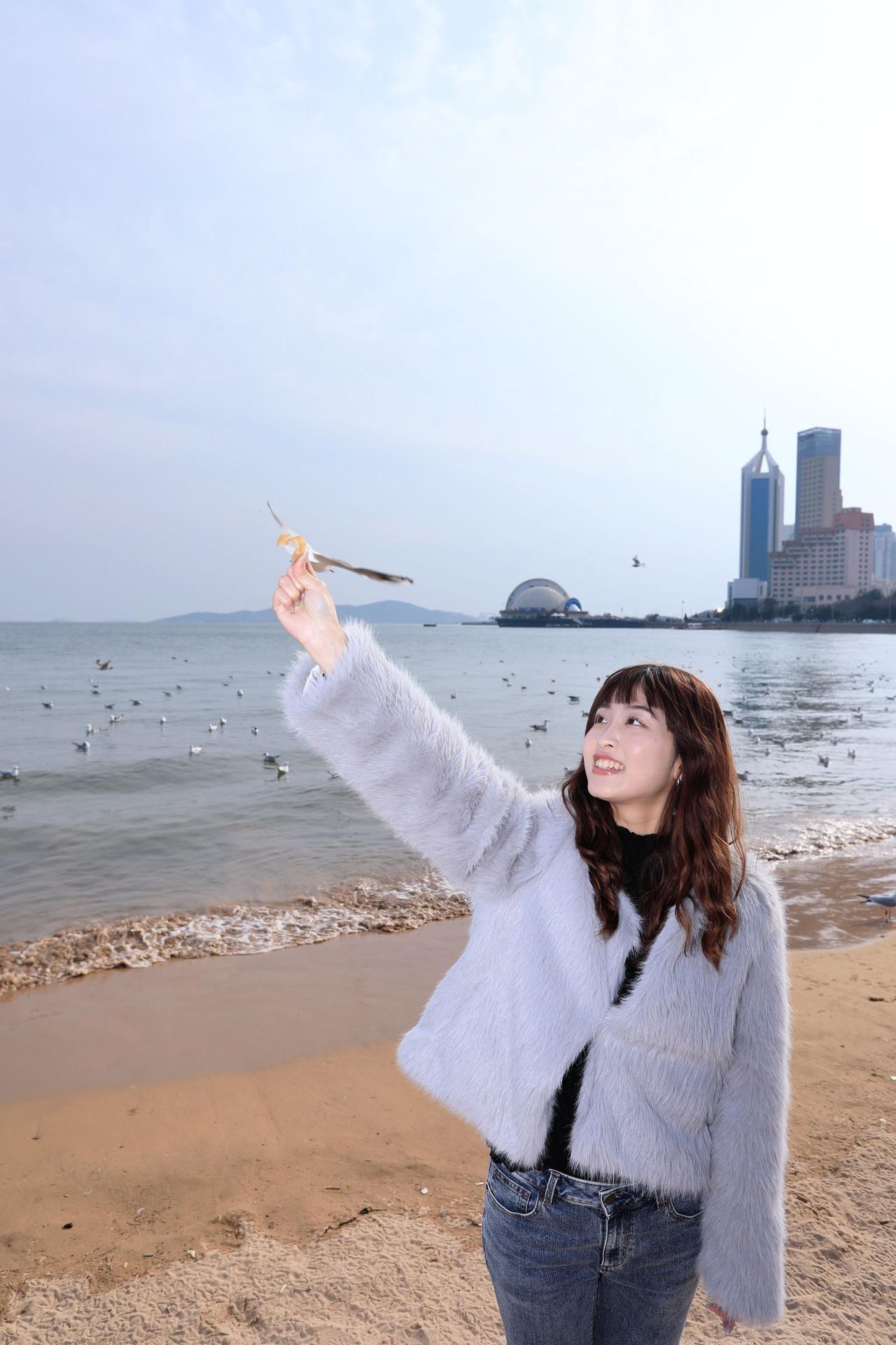 人像摄影约拍跟拍青岛海边 栈桥海鸥 台湾女孩在大陆 台湾女孩在青岛喂海鸥原创原图直出照片