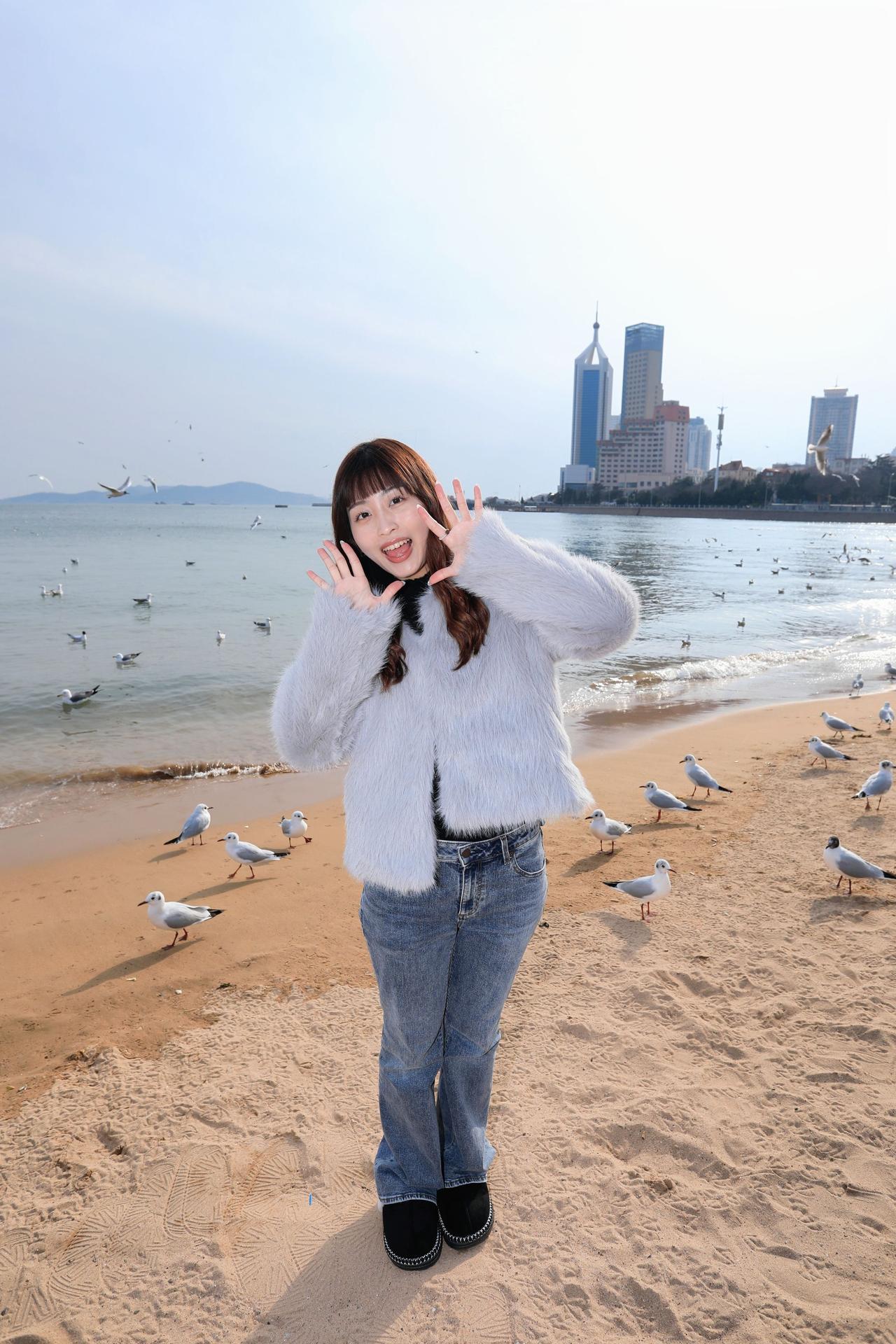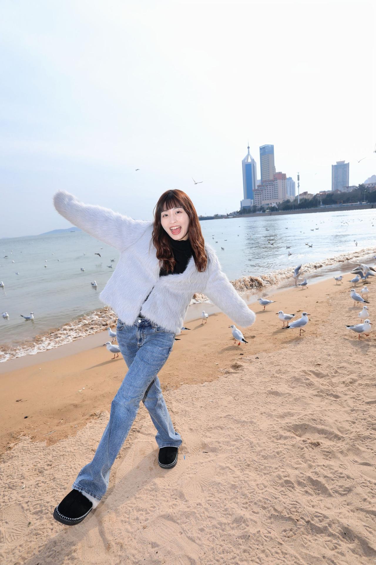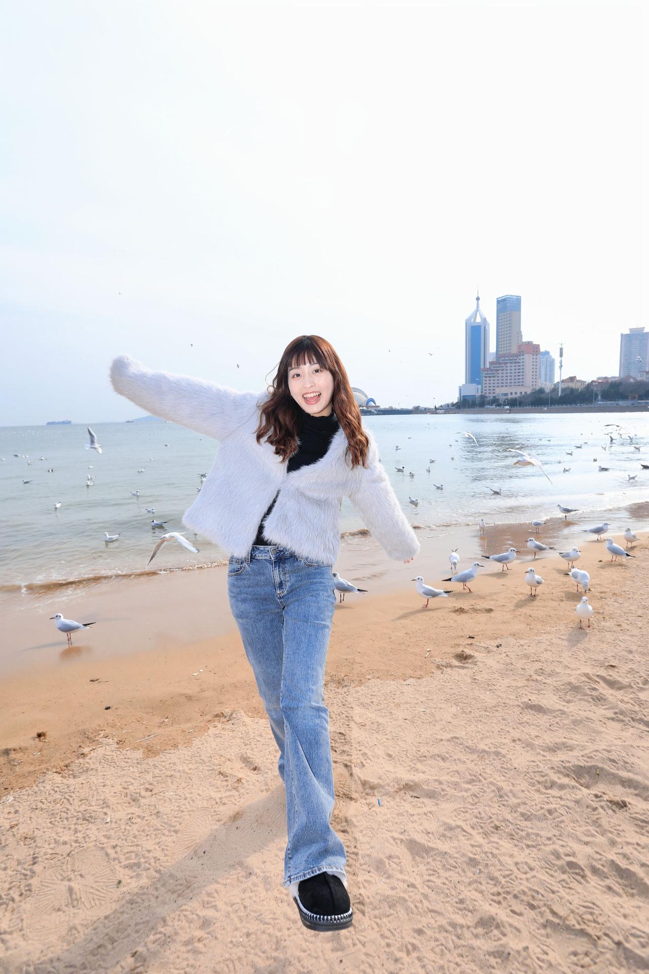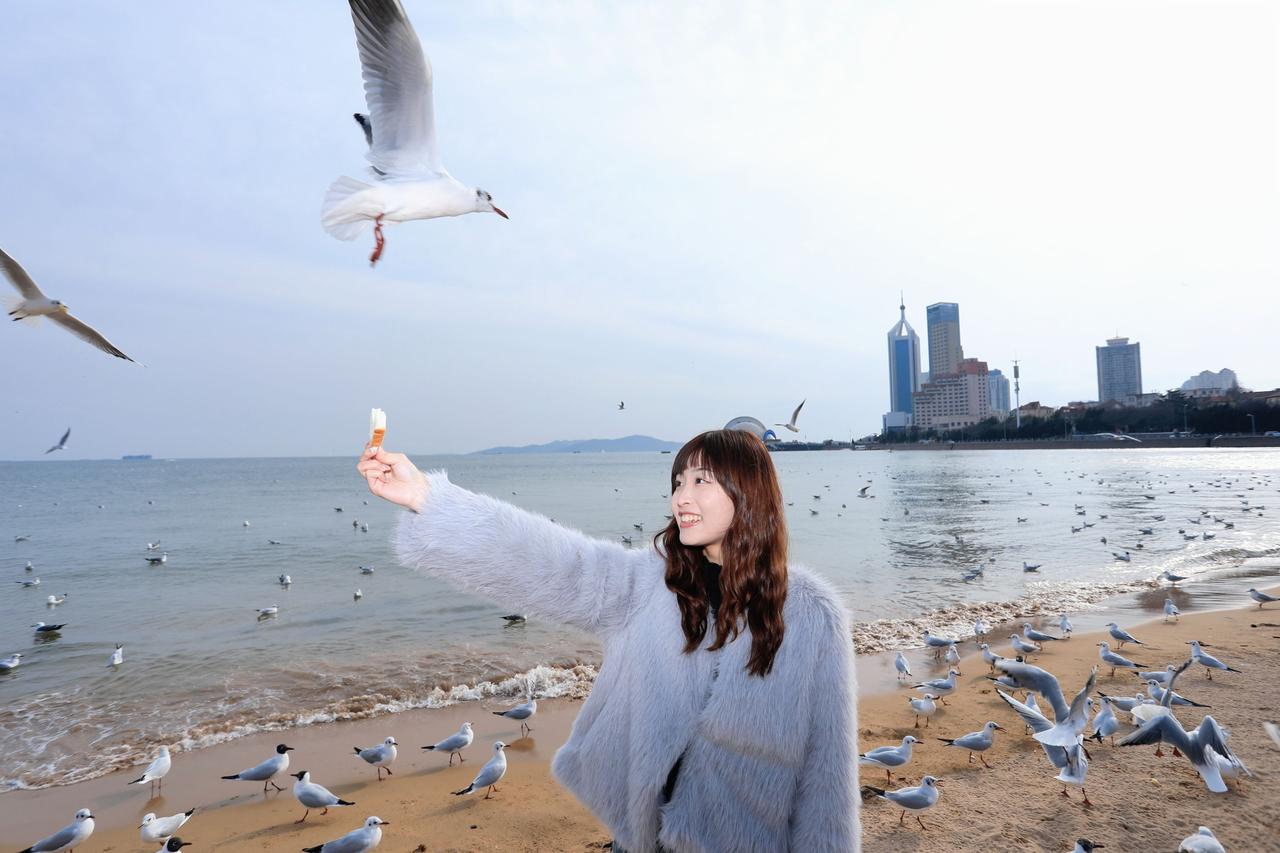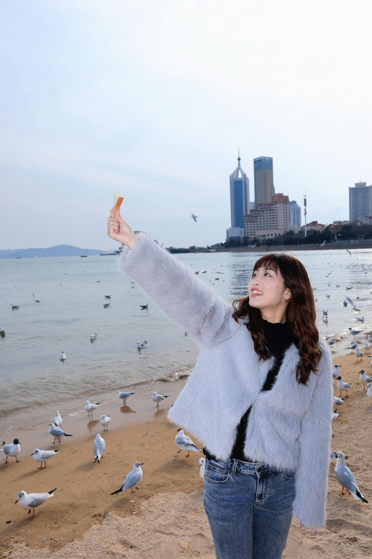 人像摄影约拍跟拍青岛海边 栈桥海鸥 台湾女孩在大陆 台湾女孩在青岛喂海鸥原创原图直出照片