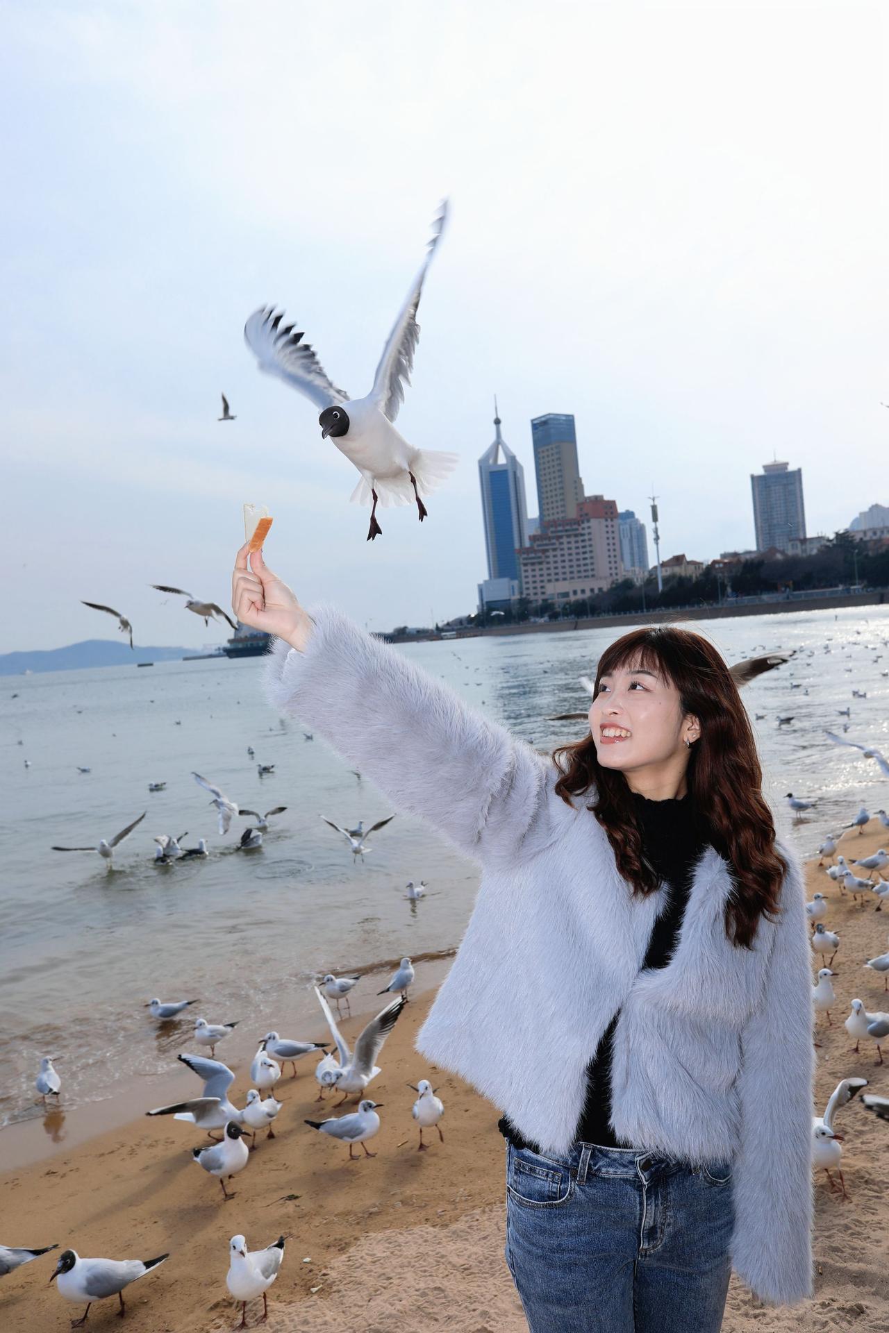 人像摄影约拍跟拍青岛海边 栈桥海鸥 台湾女孩在大陆 台湾女孩在青岛喂海鸥原创原图