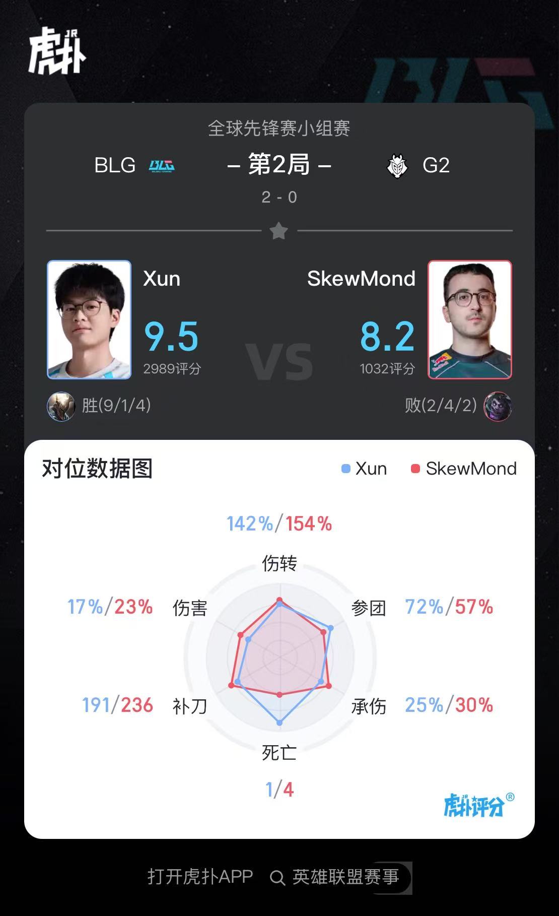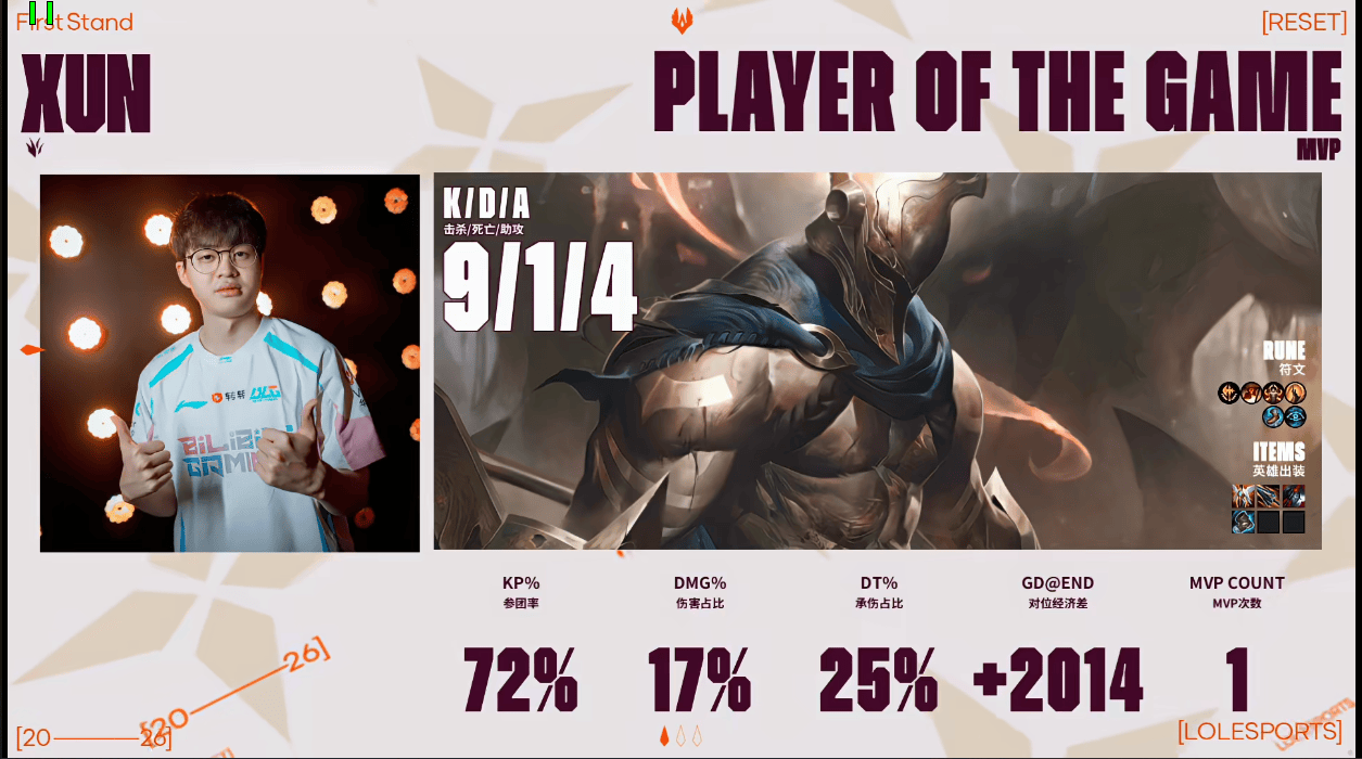 Xun潘森打出9/1/4战绩,斩获BLG对阵G2第二局MVP