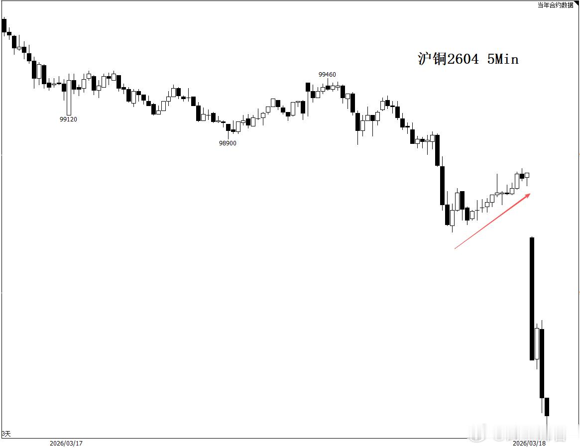 沪铜 最近原油是真狠,把几个板块都搅得翻天覆地,有色也跟着贵金属走通胀升高、降息概率下降预期。沪铜在前面提到的支撑位98000附近小幅回升后,晚上直接来了一波跳空低开闷杀。今天大摩的报告中提到:当前最清晰的配置方向不是追周期的全面复苏,而是避开铜、偏多铝和黄金。期货