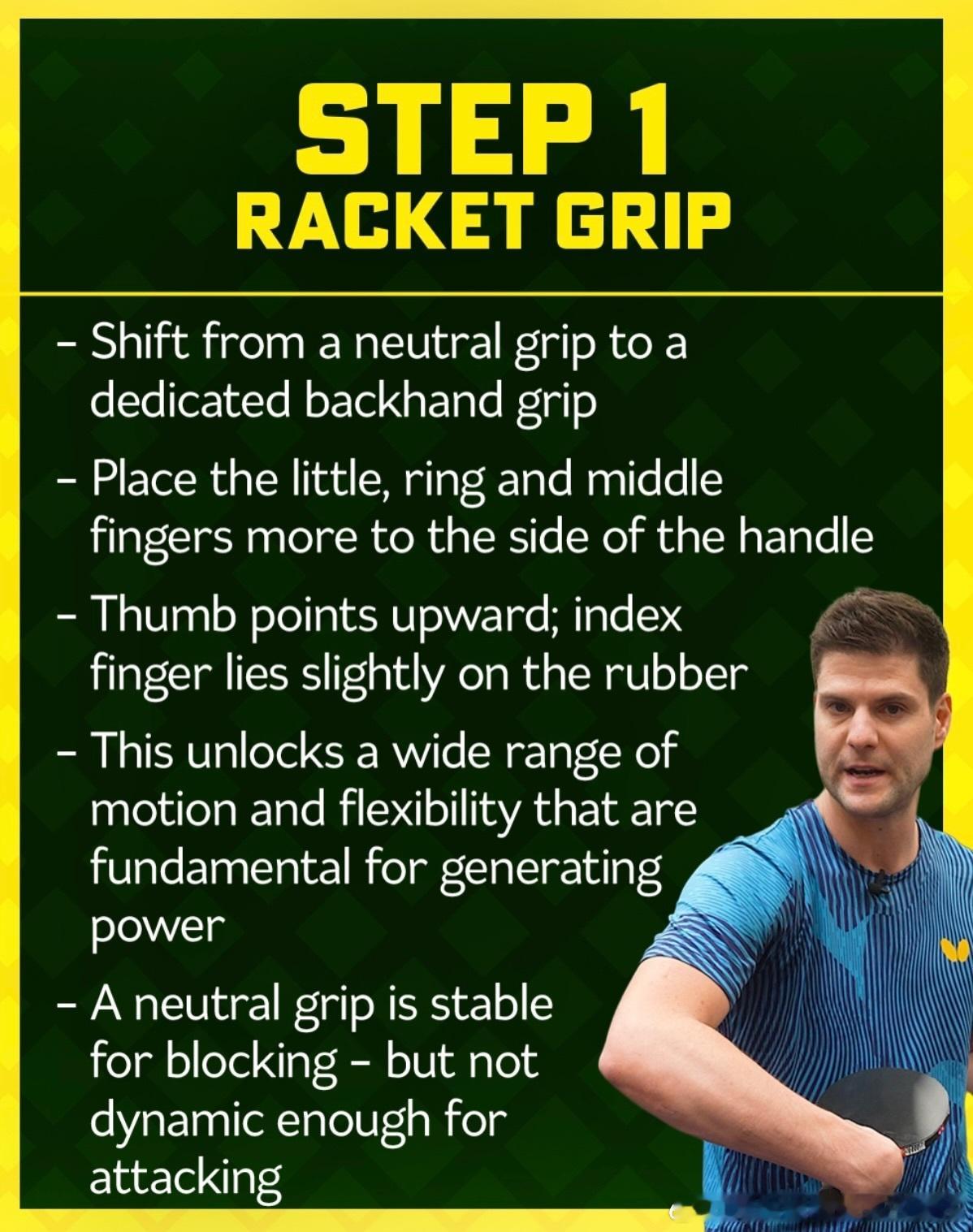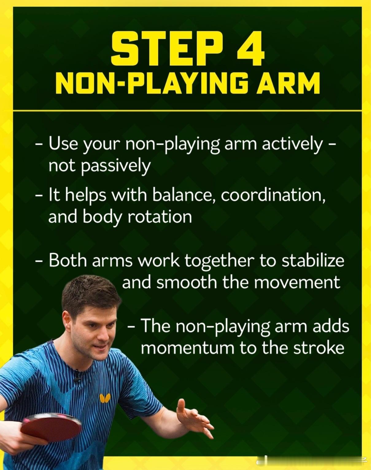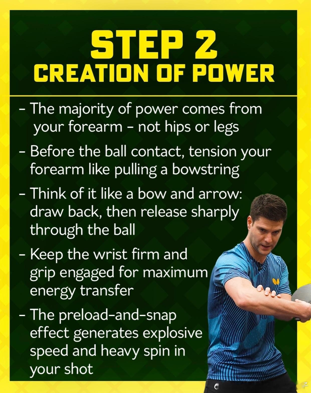 ttsmashcity:与奥恰洛夫一起学习这4个步骤,打出更快、更具威胁的反手球🏓强力反手的秘诀(四步法)第一步:握拍调整- 从常规握拍切换为反手专用握拍- 小指、无名指、中指更多贴在拍柄侧面- 拇指竖直上顶,食指轻贴胶皮- 解锁大范围挥拍与灵活性,是发力核心- 常规握拍适合防守,进攻爆发力不足第二步:力量生成- 力量主要源于前臂,非腰胯与腿部- 触球前,前臂绷紧如拉弓蓄力- 如弓箭般:后引蓄力,触球瞬间迅猛爆发- 手腕固定、握拍收紧,实现能量最大化传递- 预压-爆发效果,打出极速强旋回球第三步:击球时机- 让球自然落位,不主动抢点- 充分后摆蓄力,把控最佳节奏- 完整挥拍穿透球体,追求极致撞击- 节奏为王,过早触球破坏发力韵律- 合理挥拍轨迹,兼顾控制与速度第四步:非持拍手臂- 非持拍手臂主动配合,而非被动下垂- 辅助平衡、协调发力、带动身体转体- 双臂协同,稳定动作、流畅发力- 为挥拍补充动能,提升发力效率