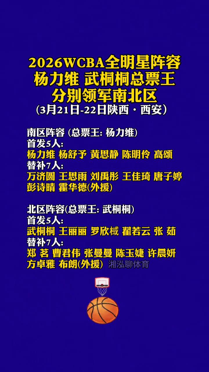 2026WCBA全明星阵容,杨力维、武桐桐总票王分别领军南北区(3月21日-22日陕西·西安)。 ·南区阵容(总票王:杨力维),首发5人:杨力维、杨舒予、黄思静、陈明伶、高颂,替补7人:万济圆、王思雨、刘禹彤、王佳琦、唐子婷、彭诗晴、霍华德(外援)。 ·北区阵容(总票王:武桐桐),武桐桐、王丽丽、罗欣棫、翟若云、张茹、郑茗、曹君伟、张曼曼、陈玉婕、许晨妍、方卓雅、布朗(外援)。 湘泓聊体育。