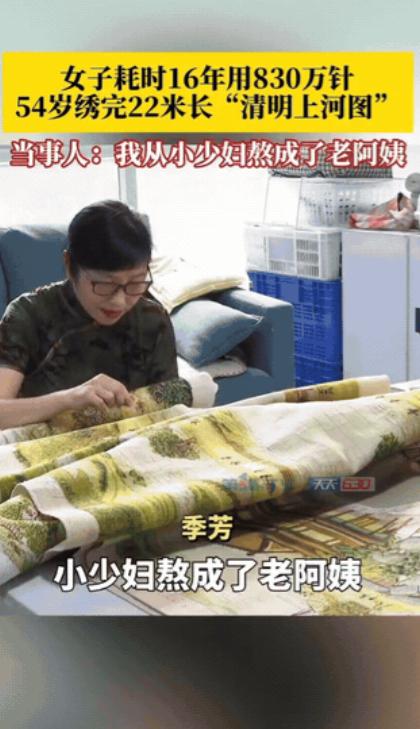 重庆,一女子下班闲得慌,为了打发时间,她不刷手机,不看电视,竟然干了一件轰动全网的大事,她耗时16年用830万针,绣了一幅22米长的“清明上河图”!她从小少妇熬成了老阿姨,就这幅刺绣应该老值钱了吧,卖掉就可以实现财富自由了! 季芳原籍安徽阜阳,2009年9月,彼时还是三十多岁的她,正值人生的青壮年时期,下班之后总觉得闲暇时间难以打发。 不同于身边人刷手机、看电视的消遣方式,她总想找一件有意义、能坚持的事,填补空闲的时光,也给自己的生活增添一份寄托,于是便萌生了绣制巨幅《清明上河图》的念头。 这个念头一经产生,季芳便立刻付诸行动,购置了绣图、针线和布料等材料,从此开启了长达16年的“针线修行”。 2011年为了寻求更好的发展机会,季芳和丈夫、儿子举家迁居重庆,行囊中始终带着这幅尚未完成的刺绣作品,异乡的奔波与忙碌,从未让她停下手中的针线。 这16年里她从三十多岁的少妇,慢慢熬成了五十多岁的“老阿姨”,重庆的烟火气滋养着她,也见证着她的坚持。 每天下班之后,她便放下所有琐事,坐在绣架前,一针一线地勾勒、填充,除去日常的家庭琐事,几乎所有的空闲时间都倾注在了这幅刺绣上。 这幅22米长的《清明上河图》,共耗费830万针,包含814个人物,还有错落的街道、穿梭的船只、繁茂的树木,每一处细节都需要极致的耐心和精准的把控。 绣制过程中,没有捷径可走,每一针都不能出错,稍有不慎便要拆毁数小时的成果,常年低头刺绣,也让她承受着颈椎不适的困扰,但她从未有过放弃的念头。 2025年9月,历经16年的坚守,这幅凝聚了她全部心血的巨幅刺绣终于完工,展开时需要六人合力,绣布上的每一处细节都栩栩如生,完美还原了北宋汴京的市井繁华与烟火气息。 作品完工后,季芳的事迹迅速在网络上传播,轰动全网,网友们纷纷惊叹于她的毅力和匠心,也有人好奇这幅耗时16年、耗费830万针的刺绣究竟价值几何,猜测卖掉就能实现财富自由。 据了解高端手工绣品价值不菲,尤其是这类巨幅名家名画刺绣,收藏价值极高,但季芳却表示,刺绣于她而言只是一份兴趣爱好。 当初绣制这幅作品,只是为了挑战自己,填补闲暇时光,并无靠它赚钱的想法,如今的季芳已经退休,有着稳定的退休金,儿女健康成长,家庭幸福美满,她甚至凭借刺绣培养出的韧劲,开启了直播助农的新赛道。 这幅耗时16年的刺绣,于她而言,不是换取财富的工具,而是16年时光的沉淀,是自己坚守与热爱的最好见证。