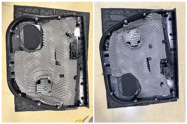 施工伊始,技术团队首先对车辆进行了细致保护,随后展开核心的隔音工程。车门是音响发声的重要载体,也是噪音传入的主要路径,GT四门隔音的施工尤为关键。团队先将门板内层进行止振处理,有效抑制门板共振,再在外层铺设隔音材料,强化密封性能,最后在门板饰盖内加装吸音棉,进一步吸收多余杂音,为喇叭创造了稳定静谧的工作环境。
