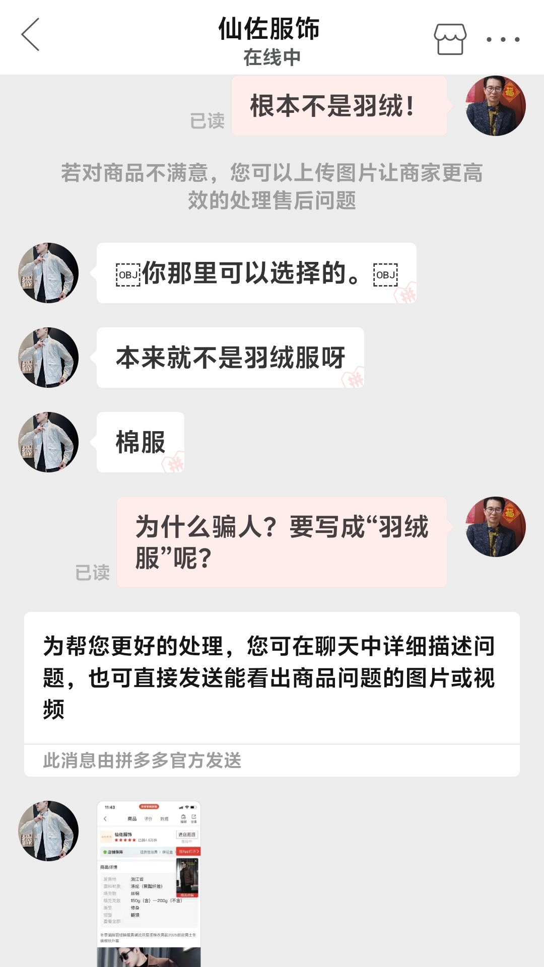 "仙佐服饰"客服却也豪不掩饰,承认不是羽绒服!而消费者却是付了羽绒服的价格,不然怎么要付出棉服一倍甚至二倍以上的价格?