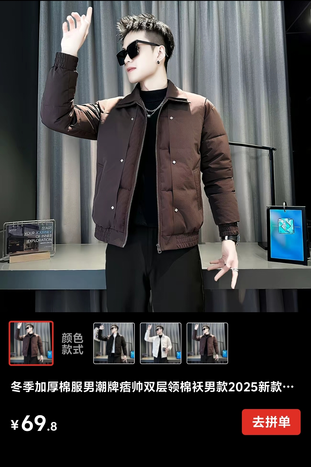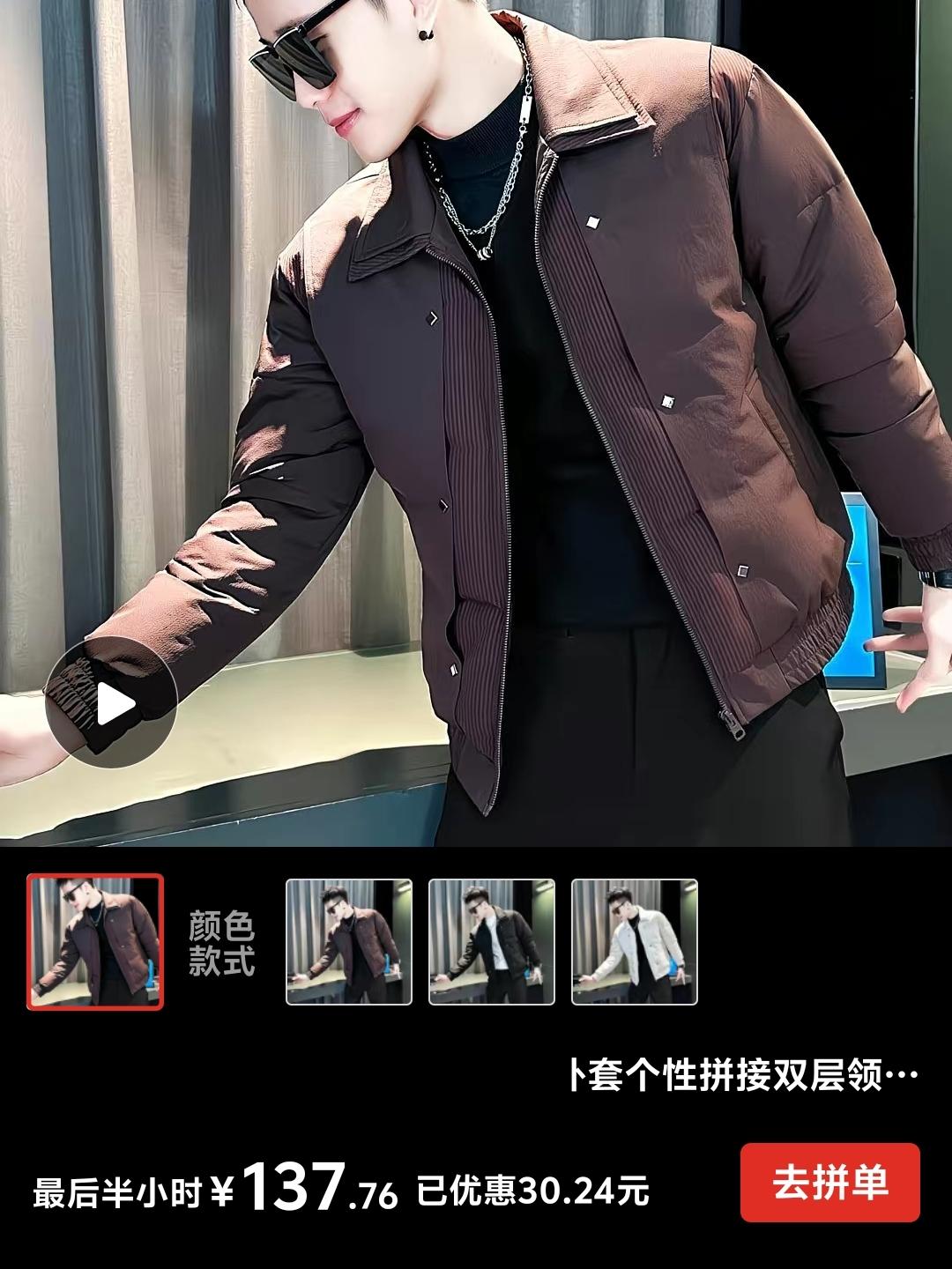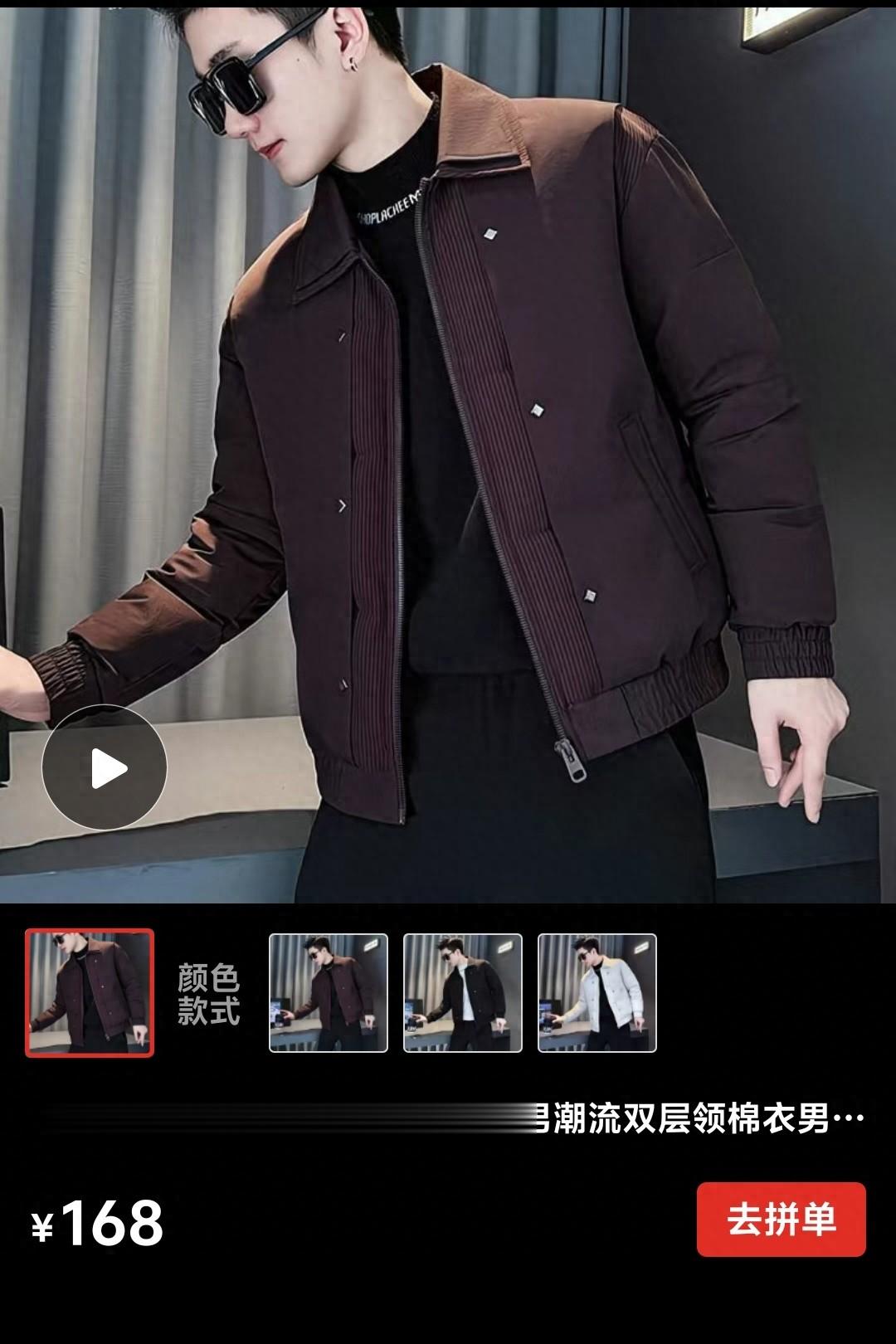 家人们,这就是"仙佐服饰"在拼多多上的广告主图,它的广告词是:"冬季潮牌羽绒服男潮流双层领棉衣男…"概括了他们整个厂家生产的冬季服饰!