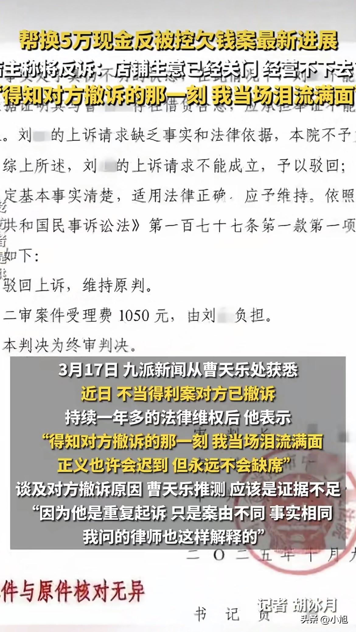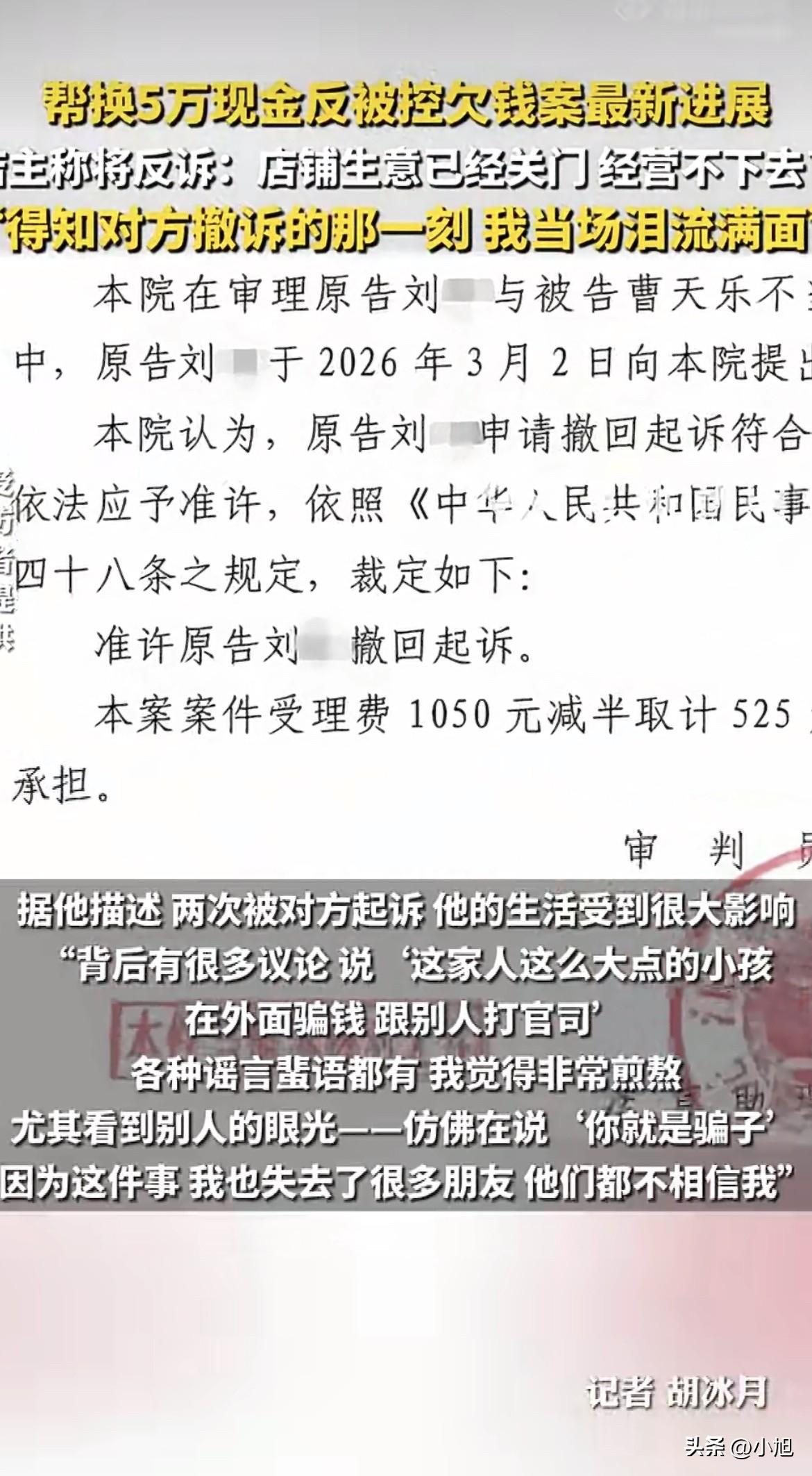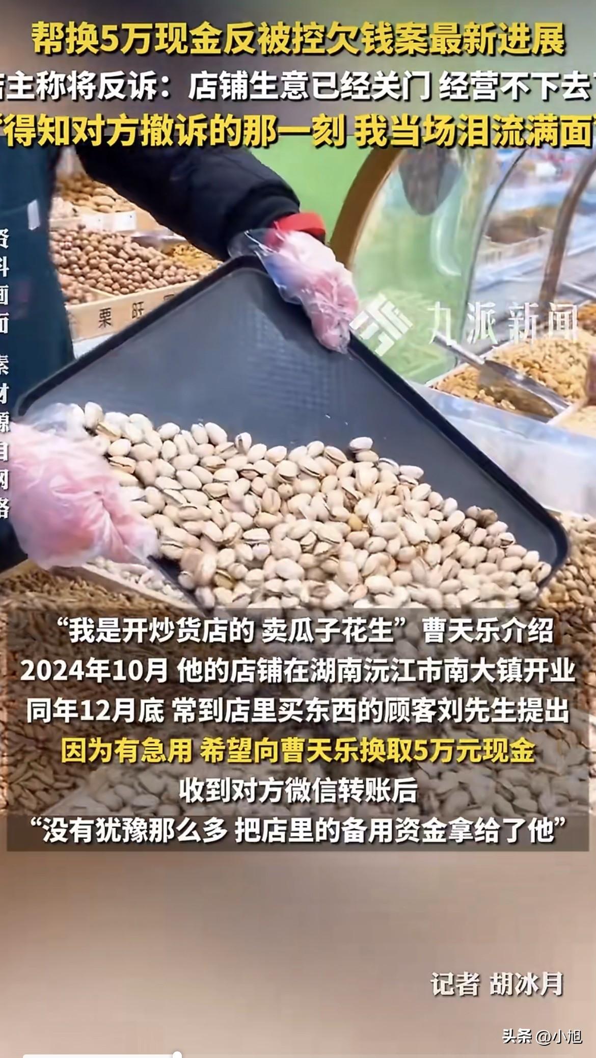 湖南沅江,18岁的炒货店老板曹天乐,到现在都想不明白,自己当初好心帮人换个现金,咋就把日子过成了这样。 事情要从2024年12月底说起。一个常来店里买炒货的熟客刘先生,说家里有急事要用现金,想找曹天乐换5万块。曹天乐没多想,收了对方微信转来的5万块,就把店里当天备用的现金全给了刘先生。没过几天,刘先生又来店里,说家里还缺点,又借走了5000现金。两次都没写借条,微信转账也没备注是干啥的。 一个多月后,刘先生突然拿着转账记录找上门,说曹天乐欠他5万块没还。曹天乐当场就蒙了,明明当时一手交钱一手交货,咋就成了借钱?更让他没想到的是,对方直接把他告了,案由是“民间借贷纠纷”。 法庭上,曹天乐拿不出监控,店里的监控只能存一个月,早就被覆盖了。他手里只有银行的取款凭证,证明自己那天确实从银行取了5万现金备在店里。可刘先生咬死了说那5万是借给他的,微信转账就是证据。 2025年6月,沅江市法院一审判决,驳回了刘先生的诉讼请求。法官在判决书里写得很明白:俩人认识不到半年,平时也没啥深交,刘先生连个借条都没有,就转过去5万块,这不符合日常民间借贷的习惯。刘先生不服,又上诉到益阳市中院。2025年10月9日,二审维持原判。 曹天乐以为这事终于翻篇了。哪知道没过多久,法院传票又来了。这次刘先生换了招数,不告借贷了,改告“不当得利”。 2026年1月20日,不当得利案开庭。法官问刘先生有啥依据,刘先生说:“我给他钱的时候,以为他是进货缺钱借的,后来法院说不算借贷,那他收我这钱就是不当得利。”曹天乐的律师当场反驳:事实是人家帮你换现金,现金当场就给你了。 法官想调解,曹天乐死活不同意:“我没欠他钱,凭啥调解?”案子本来要择期宣判,结果3月2日,刘先生突然撤诉了。 收到撤诉通知那天,曹天乐在朋友家,当场就哭了。一年多,官司终于算是有个了结。可他的生活,早就回不去了。 镇上就那么点大,风言风语传得比啥都快。有人说他是骗子,有人说他年纪轻轻不学好,跟人打官司。曹天乐走到哪儿都觉得别人在用异样的眼光看他,连以前要好的朋友都不信他了,慢慢也不来往了。 他爷爷奶奶天天睡不着觉,隔三差五打电话问他事情咋样了。他妈倒是支持他,可家里出了这么档子事,谁心里能好受。 为了证明自己清白,2025年10月,曹天乐自掏腰包三四万块,在店门口搞了一场文艺演出。请了28个花鼓戏演员,搭台唱戏,现场来了六七百人。他上台讲自己的遭遇,下台后好多人给他竖大拇指,几个陌生的爷爷奶奶拉着他的手说:“小伙子加油,前途无量。”他当时眼泪就下来了。 可演出过后重新开门,生意还是不行。顾客看他的眼神还是怪怪的,有人说:“你没骗钱,人家为啥三番五次告你?法院为啥一回回受理?”这话噎得他没法接。店开了不到一个月,实在撑不下去,又关门了。那一堆卖不出去的瓜子花生,最后只能倒掉。 现在,曹天乐决定不再忍了。他请了刑事律师,要告刘先生虚假诉讼。他还说,等刑事立案了,准备花30万,请全村人免费吃一顿饭。到时候拿着立案通知书,当着大伙的面再说一遍,看谁还能嚼舌根。 一个18岁刚出社会的小老板,好心帮人换个现金,结果店黄了,名声臭了,一年多不得安生。那个刘先生,手里就攥着个没备注的转账记录,硬是把人告了两回,最后拍拍屁股撤诉了。可给人造成的伤害,能撤得回去吗? 现在曹天乐反过来要告他,这事你咋看? (来源:综合九派新闻、沅江市法院判决书等)