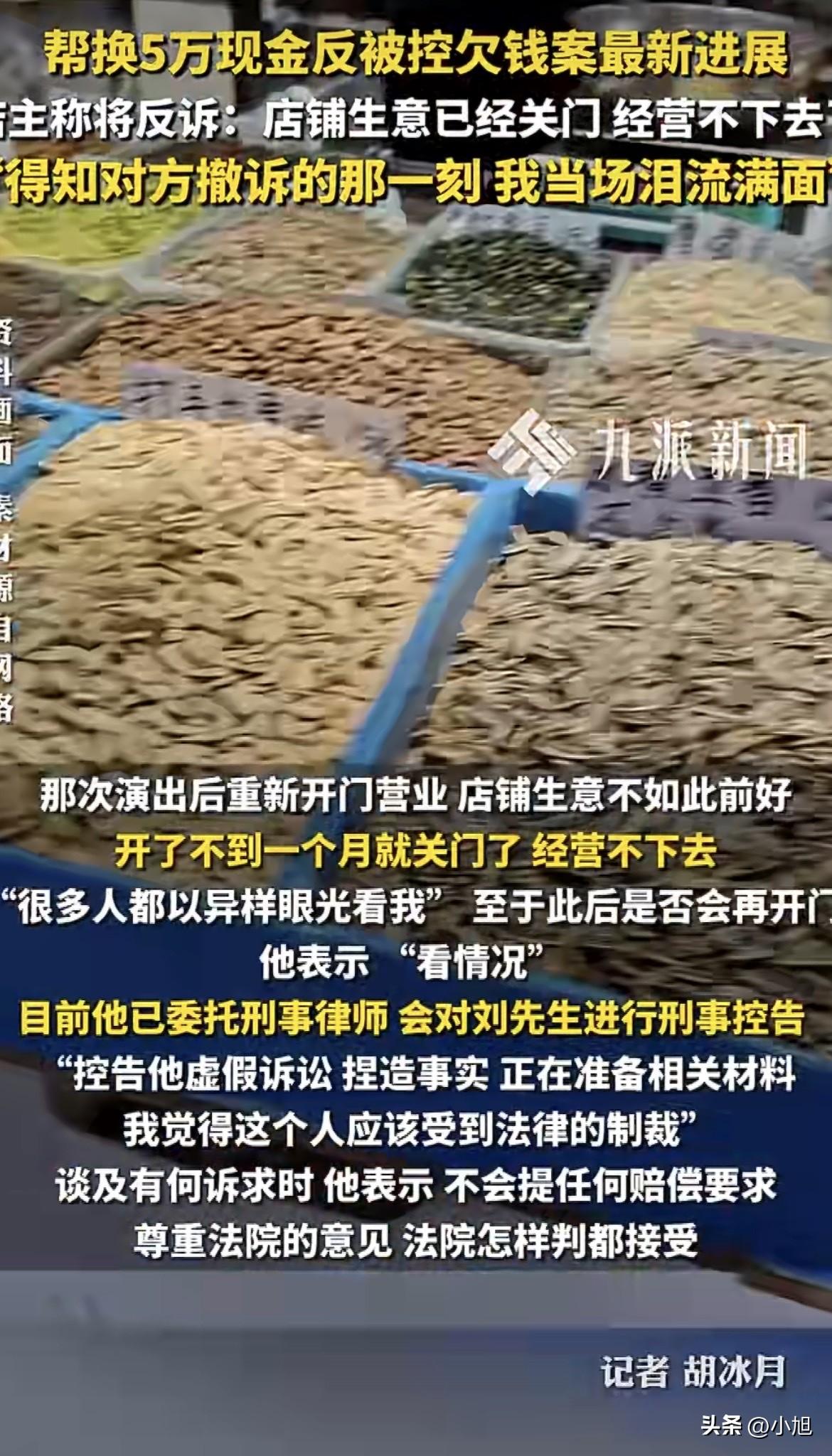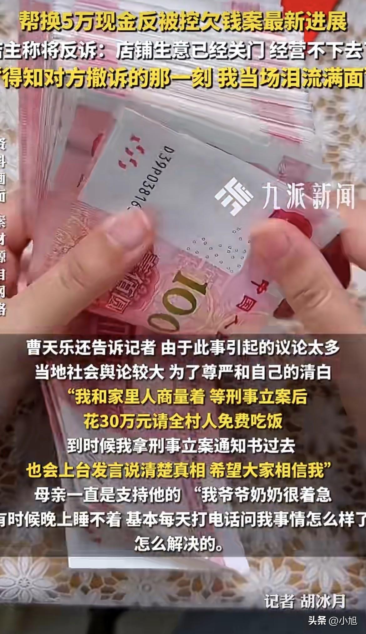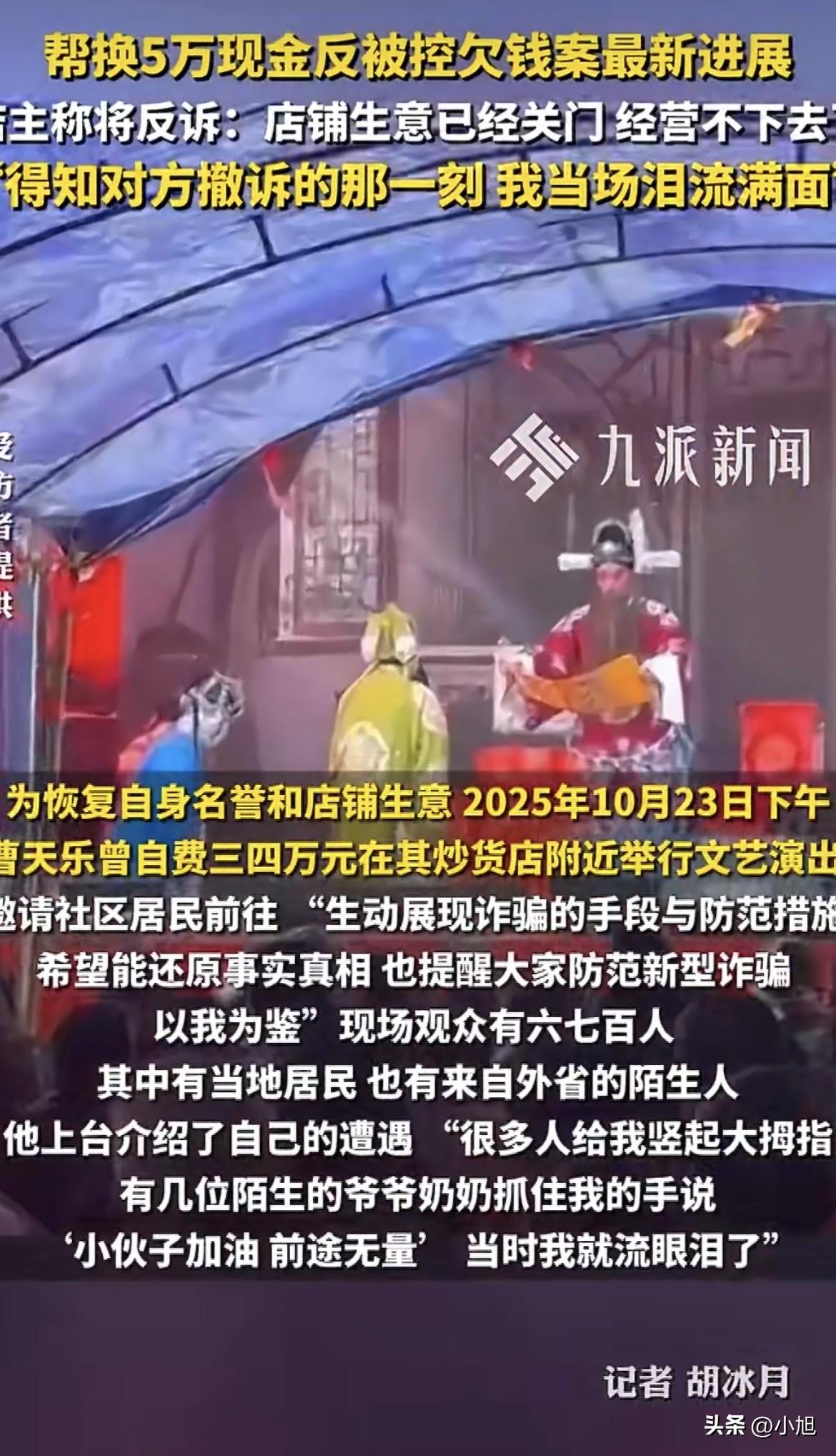 湖南沅江,18岁的炒货店老板曹天乐,到现在都想不明白,自己当初好心帮人换个现金,咋就把日子过成了这样。 事情要从2024年12月底说起。一个常来店里买炒货的熟客刘先生,说家里有急事要用现金,想找曹天乐换5万块。曹天乐没多想,收了对方微信转来的5万块,就把店里当天备用的现金全给了刘先生。没过几天,刘先生又来店里,说家里还缺点,又借走了5000现金。两次都没写借条,微信转账也没备注是干啥的。 一个多月后,刘先生突然拿着转账记录找上门,说曹天乐欠他5万块没还。曹天乐当场就蒙了,明明当时一手交钱一手交货,咋就成了借钱?更让他没想到的是,对方直接把他告了,案由是“民间借贷纠纷”。 法庭上,曹天乐拿不出监控,店里的监控只能存一个月,早就被覆盖了。他手里只有银行的取款凭证,证明自己那天确实从银行取了5万现金备在店里。可刘先生咬死了说那5万是借给他的,微信转账就是证据。 2025年6月,沅江市法院一审判决,驳回了刘先生的诉讼请求。法官在判决书里写得很明白:俩人认识不到半年,平时也没啥深交,刘先生连个借条都没有,就转过去5万块,这不符合日常民间借贷的习惯。刘先生不服,又上诉到益阳市中院。2025年10月9日,二审维持原判。 曹天乐以为这事终于翻篇了。哪知道没过多久,法院传票又来了。这次刘先生换了招数,不告借贷了,改告“不当得利”。 2026年1月20日,不当得利案开庭。法官问刘先生有啥依据,刘先生说:“我给他钱的时候,以为他是进货缺钱借的,后来法院说不算借贷,那他收我这钱就是不当得利。”曹天乐的律师当场反驳:事实是人家帮你换现金,现金当场就给你了。 法官想调解,曹天乐死活不同意:“我没欠他钱,凭啥调解?”案子本来要择期宣判,结果3月2日,刘先生突然撤诉了。 收到撤诉通知那天,曹天乐在朋友家,当场就哭了。一年多,官司终于算是有个了结。可他的生活,早就回不去了。 镇上就那么点大,风言风语传得比啥都快。有人说他是骗子,有人说他年纪轻轻不学好,跟人打官司。曹天乐走到哪儿都觉得别人在用异样的眼光看他,连以前要好的朋友都不信他了,慢慢也不来往了。 他爷爷奶奶天天睡不着觉,隔三差五打电话问他事情咋样了。他妈倒是支持他,可家里出了这么档子事,谁心里能好受。 为了证明自己清白,2025年10月,曹天乐自掏腰包三四万块,在店门口搞了一场文艺演出。请了28个花鼓戏演员,搭台唱戏,现场来了六七百人。他上台讲自己的遭遇,下台后好多人给他竖大拇指,几个陌生的爷爷奶奶拉着他的手说:“小伙子加油,前途无量。”他当时眼泪就下来了。 可演出过后重新开门,生意还是不行。顾客看他的眼神还是怪怪的,有人说:“你没骗钱,人家为啥三番五次告你?法院为啥一回回受理?”这话噎得他没法接。店开了不到一个月,实在撑不下去,又关门了。那一堆卖不出去的瓜子花生,最后只能倒掉。 现在,曹天乐决定不再忍了。他请了刑事律师,要告刘先生虚假诉讼。他还说,等刑事立案了,准备花30万,请全村人免费吃一顿饭。到时候拿着立案通知书,当着大伙的面再说一遍,看谁还能嚼舌根。 一个18岁刚出社会的小老板,好心帮人换个现金,结果店黄了,名声臭了,一年多不得安生。那个刘先生,手里就攥着个没备注的转账记录,硬是把人告了两回,最后拍拍屁股撤诉了。可给人造成的伤害,能撤得回去吗? 现在曹天乐反过来要告他,这事你咋看? (来源:综合九派新闻、沅江市法院判决书等)