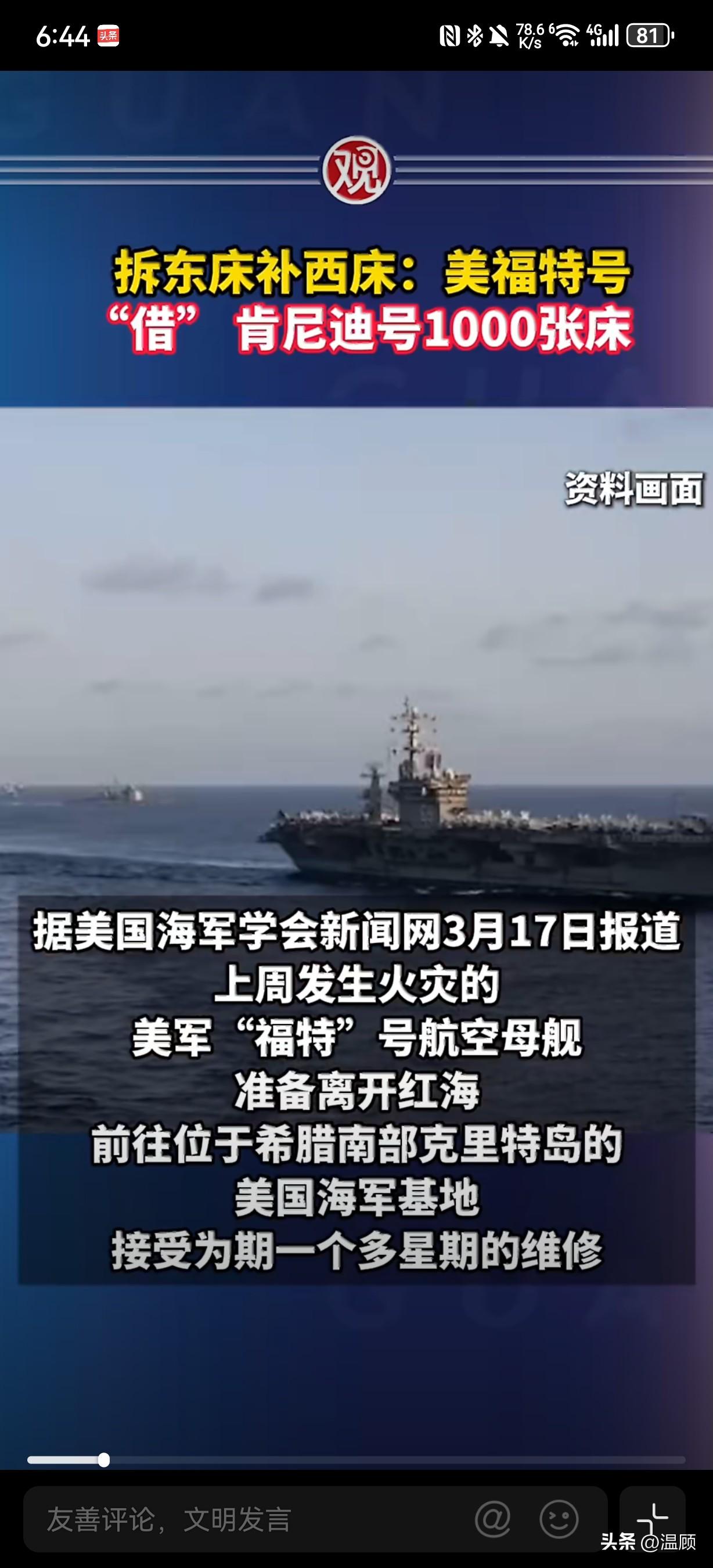 福特号航母火灾惨状:拆肯尼迪号1000张床垫,水兵睡地板 USNI News 3月17日证实:正在红海执行任务的福特号(CVN-78),3月12日主洗衣房火灾,下周将前往希腊苏达湾维修一周多 。 火灾烧毁100+床位、多个舱室,600+水兵无床可睡,被迫在地板/桌案栖身。洗衣房全面瘫痪,水兵无法洗衣。 美军紧急从肯尼迪号(CVN-79)拆下1000张床垫,并收集2000套运动服送往福特号。 伤亡:1人医疗后送、2人割伤、200+人烟雾治疗。 五角大楼发言人还嘴硬:“水兵坚韧精神让福特号继续执行任务”。 美国大兵:看来这次火还不够大。