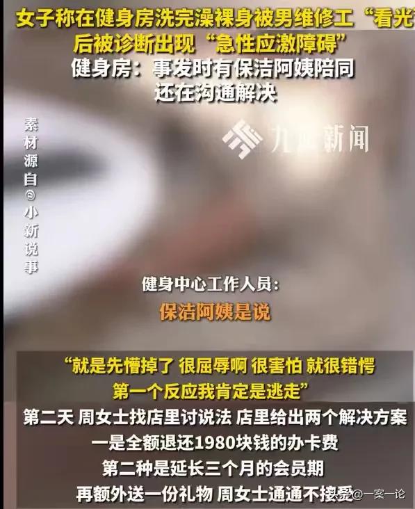 浙江嘉兴,女子在健身房,锻炼完之后,就去洗澡,洗完澡,什么都没穿,就去上厕所,结果被一名男子看光了,她气得吃不下,睡不着,店主说可以退回1980元的办卡费,她不同意,店主就说了, 男子又没有看到她,保洁阿姨在厕所的拐弯处全程看着男子,里面没人才让男子进厕所的。 又到锻炼时间了,周女士在一家健身房办了三个月的卡,她如约而至,坚持来锻炼,她要锻炼好身体,拥有苗条的身材。 健身房里,设备齐全,周女士一会儿练练这个,一会儿练练那个,没过多久,就大汗淋漓,出了一身汗,舒展了筋骨,她也感到整个人舒坦了很多。 锻炼完,她自然是要洗个澡的,洗澡的时候,她就感到肚子有些不舒服,她擦了身,来不及穿衣服,就去上厕所。 因为周围都是女子,她连浴巾都没有拿了,反正都是女的,她也不在意。 她只顾着,赶紧去厕所,结果在厕所那里,她居然碰到了一个男子,四目相视之下,周女士惊愕了,这里怎么会出现男的。 她的第一反应,就是要赶紧逃离这里,她什么都没有穿,就这样被男子给看光了,她害怕地跑了,顾不上男子看她的异样眼光。 她不过是去锻炼身体,不过是去上个厕所,可她的隐私都没有得到保障,无缘无故就被男子给看光了。 这件事把她气得吃不下,睡不着,她一想起这件事,整个人都无精打采,仿佛整个人被抽了魂一般。 这件事对她的精神造成了非常大的打击,甚至要去看医生,医生跟她说她得是应激性障碍。 发生这样的事情,店主说可以退她三个月的办卡费1980元,或者延长她三个月的会员期,但周女士都不同意。 这时店主说出了事情的另一个真相。 原来当天健身房厕所的管道坏了,店里安排维修工去维修,但是维修工进厕所之前,他们有安排保洁阿姨在厕所的拐弯处看着。 他们是确保厕所里面没有人,才让维修工进去的,维修工维修完之后,阿姨也是看着维修工离开的,全程周女士和维修工都没有碰着面。 周女士听到店主这样的说法,就不乐意了,如果店主坚决认为他们两人没有碰到面,如果她没有被男子看光,店主怎么可能愿意退1980元的办卡费,还愿意延长三个月的会员期。 双方说法不一,周女士说自己被看光了,店主说阿姨全程看着,俩人没有碰着面。 那周女士到底有没有被维修工看光,这件事就得拿出证据了。 《民事诉讼法》第67条规定:当事人对自己提出的主张,有责任提供证据。 周女士如果真的被维修工看光了,她也得拿出证据证明这件事情。 发生这样的事情,因为当天确实有维修工进厕所,虽然全程保洁阿姨有看着维修工,但也难避免维修工,在阿姨不在场的时候,一个不留神就看到了周女士。 如果真是有这样的事情发生,周女士的精神受到损害了,她是可以要求该店进行精神赔偿。 《民法典》第1183条规定: 侵害自然人人身权益造成严重精神损害的,被侵权人有权请求精神损害赔偿。 现在周女士要求的就是要这个男子当面道歉,并且要求精神损害赔偿。 那么你认为真相是什么呢?