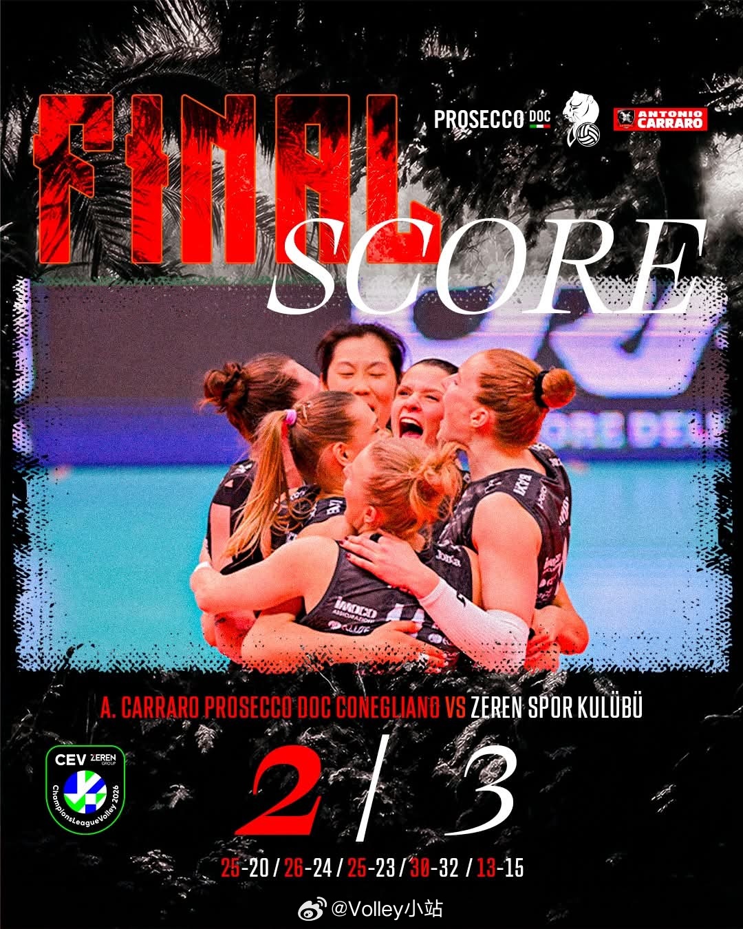 2025-2026赛季女排欧冠1/4决赛第二回合,意大利科内利亚诺2-3土耳其泽仁体育(25-21 25-17 19-25 30-32 13-15),科内利亚诺凭借首回合3-0战胜对手的积分优势,晋级四强
