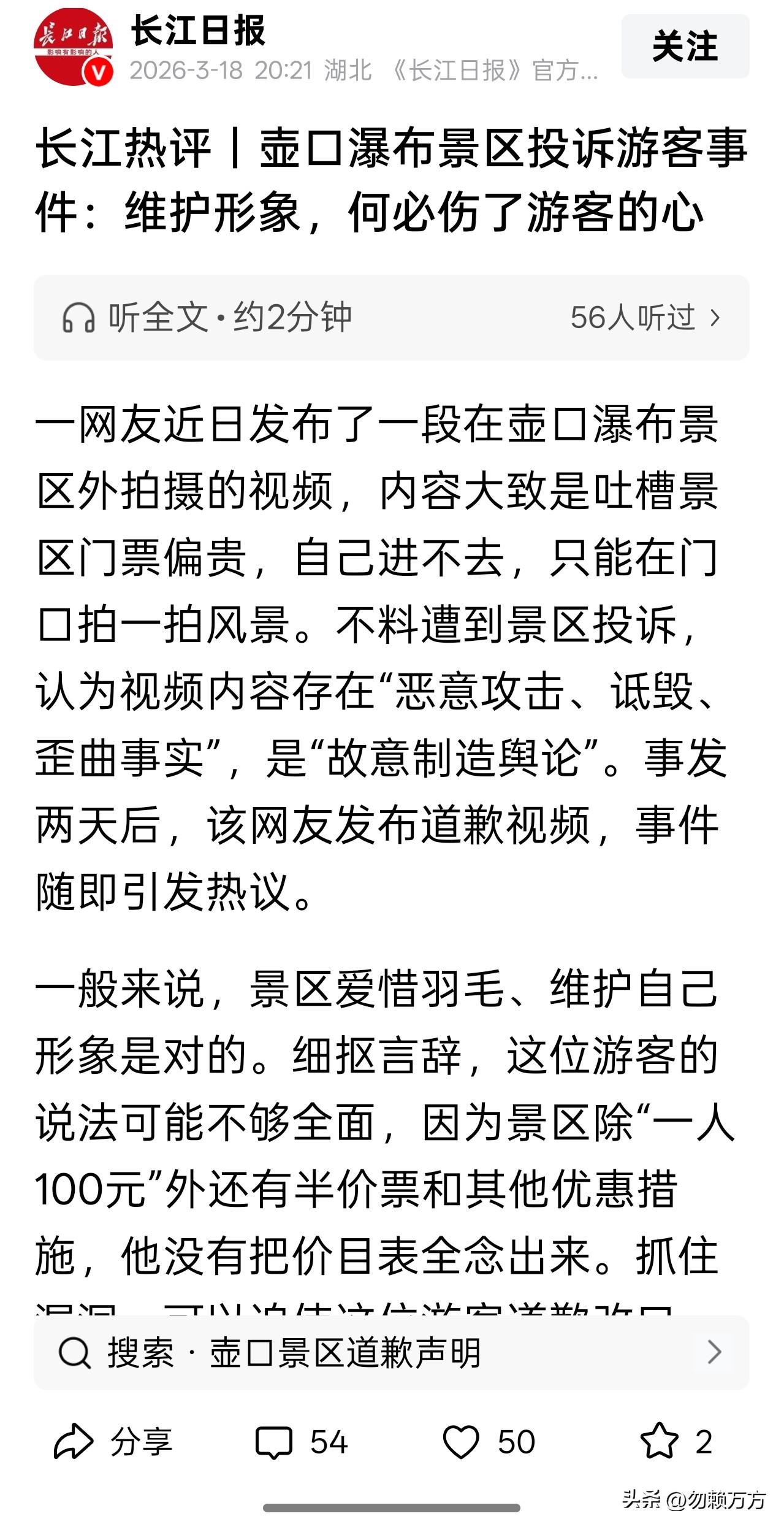 一网友发视频吐槽壶口瀑布景区门票太贵,结果被景区投诉,认为该视频“恶意攻击,诋毁,歪曲事实”,该网友又发视频道歉。 景区认为他们有半价票,并非网友所说的“一人 100”,所以就是歪曲。如果这种说法成立,那么我们日常所说的话都要加上足够多的限定词,但依然很难保证全面。比如我们常说“一日三餐”,但是有人说我就吃两餐,你是歪曲;比如我们说“人人平等”,但事实上有人就不那么平等。[大笑]我们应该看他说的内容是不是广泛存在,而不是苛求别人全面介绍。 景区为什么会如此高傲?我的看法是旱涝保收造就的衙门作派,游客的体验他们不太在意,反正是独此一家別无分店,爱来不来。但是你要敢说我们的不是,那就要让你长长见识,让你知道“此树是我栽”。[捂脸]