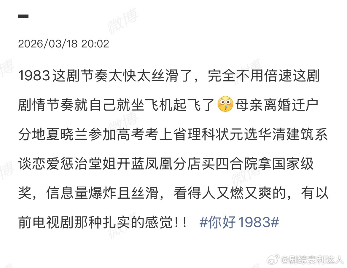 你好1983两集讲完的剧情你好1983有种老剧的扎实感 被《你好1983》狠狠圈粉,节奏快到惊人,漏看一秒都得重刷,两集就讲完了夏晓兰的逆袭全程。从高考成省理科状元、进入华清建筑系,到帮妈妈离婚、开分店获国奖,节奏快且保留老剧的扎实质感。