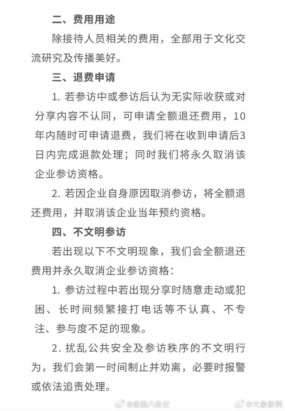 胖东来参访费2万不满意可全额退款收费标准为20000元/人,开放对象为企业级学习参访。同时,胖东来表示,若参访中或参访后认为无实际收获或对分享内容不认同,可申请全额退还费用,10年内随时可申请退费