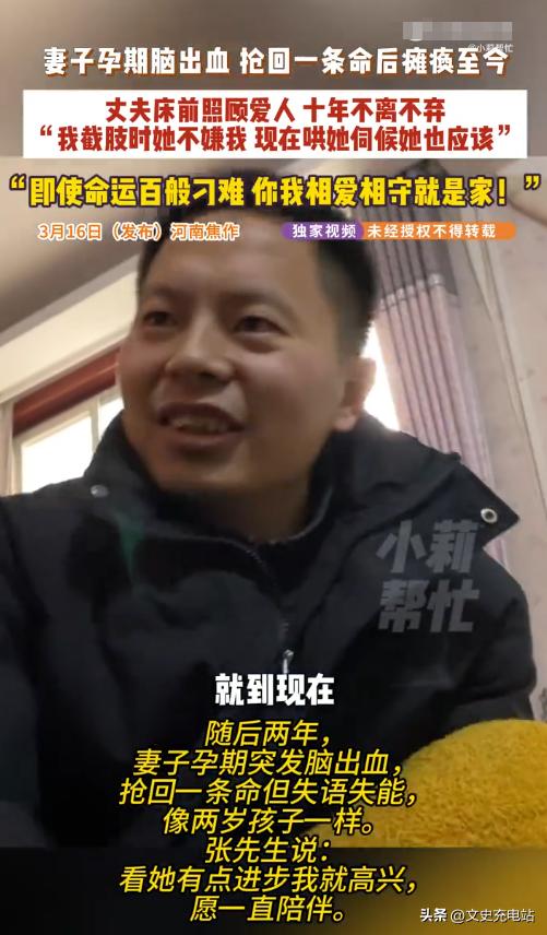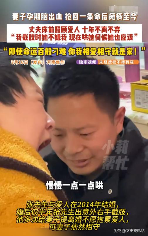 “泪目了!”河南一对新婚夫妻结婚刚半年,结果丈夫就意外失去右臂,本想让妻子离开自己,可妻子却死活不肯。一年后妻子怀孕,本是一件好事,没曾想又突发意外,抢救后智力仅剩3岁,生活完全无法自理。如今9年过去,丈夫用仅剩的左臂撑起这个家,他说出一句话,让全网泪崩……[太阳] 2014,相识不过一年的张凯和王芳芳结婚了,两人都是本村人,不出意外的话他们的未来将会接着平淡幸福地走下去。 谁料婚后约一年,张凯在工厂作业时右臂被机器压伤,致右手五指完全缺失。 于是,出院后他几次开口让王芳芳另嫁他人。 可王芳芳没有答应,一直留下来照料他,帮他练习用左手吃饭、穿衣、洗漱。一年多后,张凯慢慢重新站了起来。 2017年,王芳芳怀孕,这是这个家两年来第一个真正意义上的好消息。 可不久后,王芳芳突发头痛、抽搐并晕倒,送医后确诊为妊娠相关性脑出血,出血量大,情况危急。 医生告知张凯需要在大人和孩子之间做出选择,他选择保妻子。 手术历时五个小时,王芳芳活下来了,但脑部神经受损严重,其认知能力受影响,右侧身体知觉大幅减退,需长期康复。 从那之后,张凯一个人带着一条左臂照顾她,每天帮她做康复训练、擦身喂饭,再打理家里开的快递驿站。 驿站是他维持生计的方式,也是他不能离开家太久的原因。 村里人常看到他在驿站忙活的时候,时不时回头朝屋里望一眼,他的左手因长期负重,关节逐渐变得僵硬。 九年里,妻子有了一些进展,能听懂部分简单指令,能在扶持下维持坐姿一段时间,右手可以做轻微抓握。 这些变化,对于脑出血后遗症患者而言可并非理所当然。 1 月,张凯入选中国好人榜,接受采访时他说的话没什么修辞:"她是我媳妇,我答应过要照顾她一辈子。" 张凯今年不过30出头,王芳芳的状态依然需要全天候照看,快递驿站还在开,康复训练还在做,日子还在一天一天地过。 从新婚燕尔到突遭横祸,从断臂之殇到妻子重病失语,张凯用一条左臂,扛起了一个家的重量,也扛起了最朴素也最沉重的诺言。 九年风雨,他没有豪言壮语,只以日复一日的照料、不离不弃的坚守,把一辈子写成了行动。 这不是传奇,而是最真实的人间深情 ,真正的爱,从不是顺境里的甜言蜜语,而是绝境中攥紧彼此的手,是哪怕只剩一臂之力,也要为爱人撑起一片天。 平凡身躯里藏着的坚守与善良,足以照亮漫长岁月,温暖无数人心。