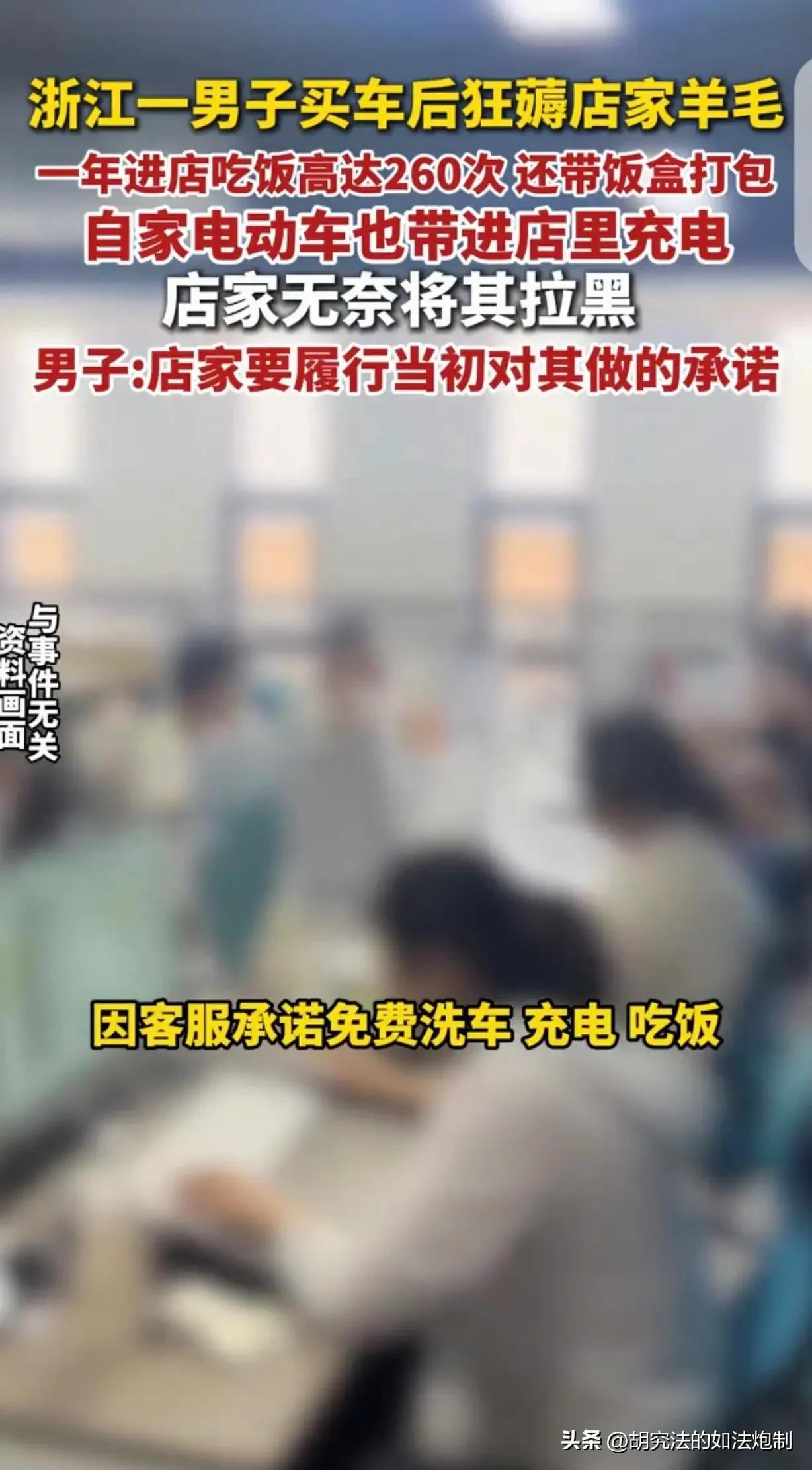 活不起?浙江,一男子在4S店买车时,工作人员说买车有福利,来店里可以免费洗车、充电、吃员工餐。谁曾想,男子把这句话记在心里,没事就往店里跑,1年的时间在店里吃了260顿饭,还带着饭盒打包带走。店家受不了了,一气之下把男子拉黑。男子不干了,要求店家要么履行承诺,要么给他退1592元的保养费。谁知店家刚同意,男子接下来的举动,让店家绷不住了! 现如今家用车行业内卷非常严重,为了能把车卖出去,很多4s店几乎想尽了一切办法,把最大的利益让给车主。 什么免费洗车、免费吃饭等等,这本来是一种常规操作,没有想到,真的有人把这种福利运用到了极致。 事情的大致是这样的,一男子在买车之前,4s店工作人员告诉男子,只要现在下单购车就有福利,平时车主可以来店里免费洗车、免费充电,如果赶上饭点了,还有免费的工作餐。 男子听完这项福利,眼睛都亮了。虽然他买的是新能源汽车,一个月的电费也就几十块钱,可要是在4s店充电的话,几十块钱省下来买排骨吃不香吗? 在外面洗车动辄就要几十块,哪里有免费的香? 还有更关键的一点,在这里还能免费吃饭,生活费可就节省下来了。 自从买了车之后,男子果真是说到做到。充电就到4s店,充完电后便开着车去免费洗,等做完这些也就差不多到饭点了,男子便又跑到员工餐厅去吃饭。 他自己吃饱还不行,还要多打几份打包带回家给家里人吃。 刚开始的时候,4s店的工作人员也不好说什么,毕竟男子做的也不犯什么毛病。再加上店里本来就有这样一个政策,要是不让男子去吃饭的话,这事要是传出去,对4s店的名声也不好。 做生意不就是讲究个诚信嘛! 店主本以为男子时间长了就嫌麻烦不来了,没曾想男子却乐此不疲,一年365天,男子能从店里吃200多顿饭,吃的次数比店里的员工还要多。 对上店主无法接受的是,男子每次来,为了图方便赶饭点,直接把自己的车停在新车交付区,锁上车之后便跑去吃饭。 新车交付区本来就是为新车主做准备的,男子把车停在那里,交付车辆的时候都没有场地了。 工作人员好声好气的过去找男子挪车,男子不仅不挪,车还对着工作人员破口大骂,好像4s店就是他家里开的一样,他想怎么做就怎么做,完全不把工作人员放在眼里。 眼看男子越做越过分,4s店店长把这件事向上汇报,领导们开会一研究,决定也不惯着男子了,把男子的车主福利取消,不允许男子继续这样肆无忌惮的薅羊毛。 得知自己被拉黑后,男子当场就不乐意了,开始在4s店里撒泼耍横,当着来买车的顾客的面大声嚷嚷,说4s店不讲诚信出尔反尔,谁买车谁上当。 工作人员见状,只能把男子请到办公室协商解决。男子提出,自己还有4次免费保养没有做。按每次保养398元的价格计算,给他1592元赔偿,以后他就不来了。 4s店一合计,不就是花点钱吗,总比让男子一直薅羊毛强吧?就当是破财免灾了,于是便同意了。 不过考虑到男子的品行,店里专门起草了一份合约,只要男子从上面签了字,店里就给钱。 谁知男子突然想到了什么,竟然不愿意签字了,任凭工作人员如何劝说,男子就是不同意。 有人调侃,男子肯定不会签字的,只要是签了字,就意味着长期饭票、长期充电票、汽车票作废了。 《消费者权益保护法》第十六条规定,经营者与消费者有约定的,应按约定履行,但约定不得违背法律、法规;不得设定不公平、不合理的交易条件。 店家推出的车主福利活动,其本意是提升车主的售后体验,绝对不是让车主随意薅羊毛的。 男子没事就往店里跑,不是充电就是洗车,还打包饭菜回家,这对于店家来说已经不公平了,在这种情况下,店家有权暂停或者取消车主福利。 对此你怎么认为?我要上精选-全民写作大赛