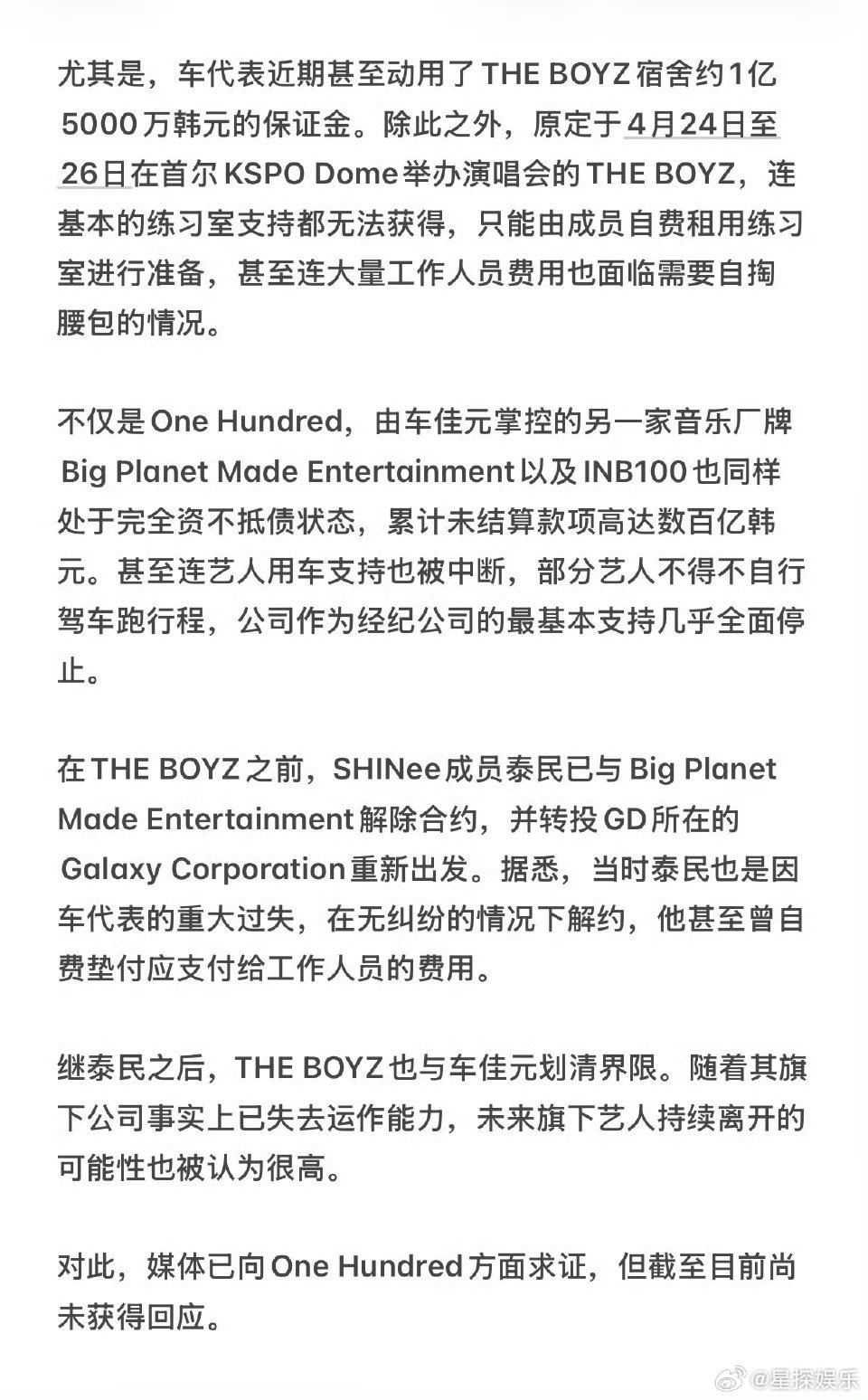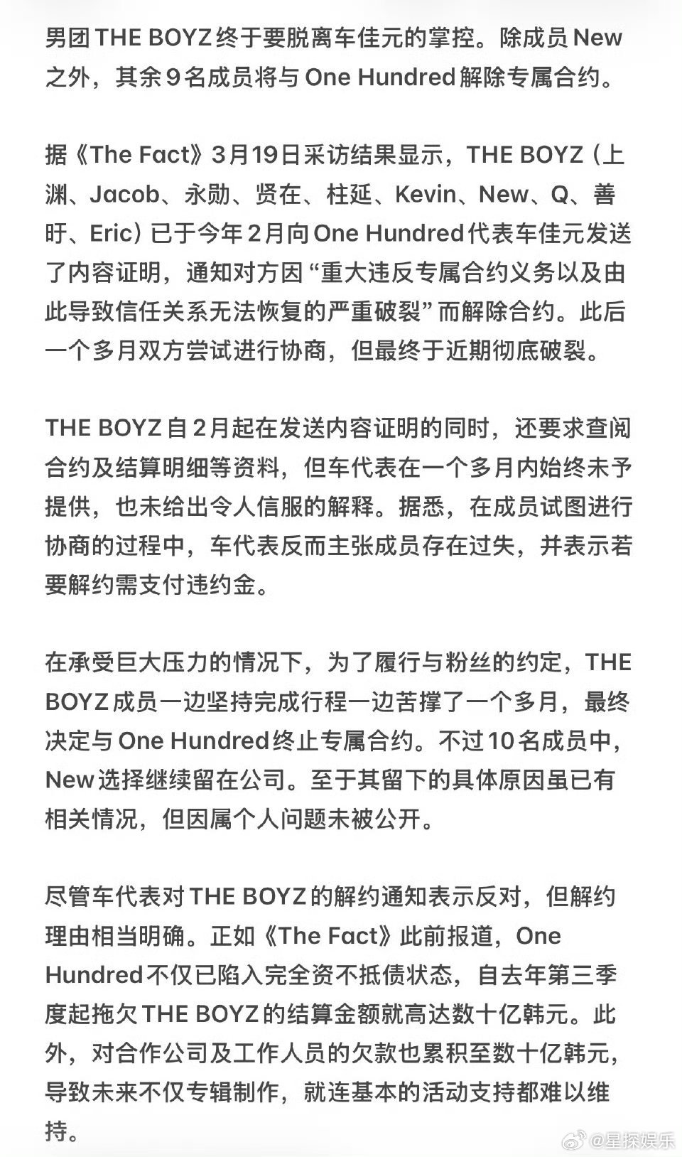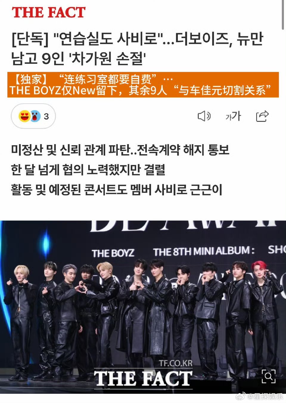THEBOYZ解约 看得太窒息了…拖欠数十亿结算款、挪用宿舍保证金,连练习室都要成员自费租,公司彻底摆烂到连车都不派了。9个人选择解约真的是被逼到绝路了,支持他们拿起法律武器维权,这种吸血公司早该倒闭了。