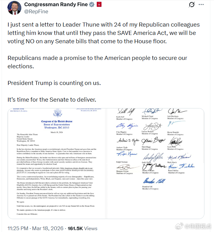 我刚刚和我的24位共和党同僚一起,给参议院领导约翰·图恩写了一封信,告诉他,在参议院通过《拯救美国法案》之前,我们将在众议院对任何送上来的参议院法案投反对票。