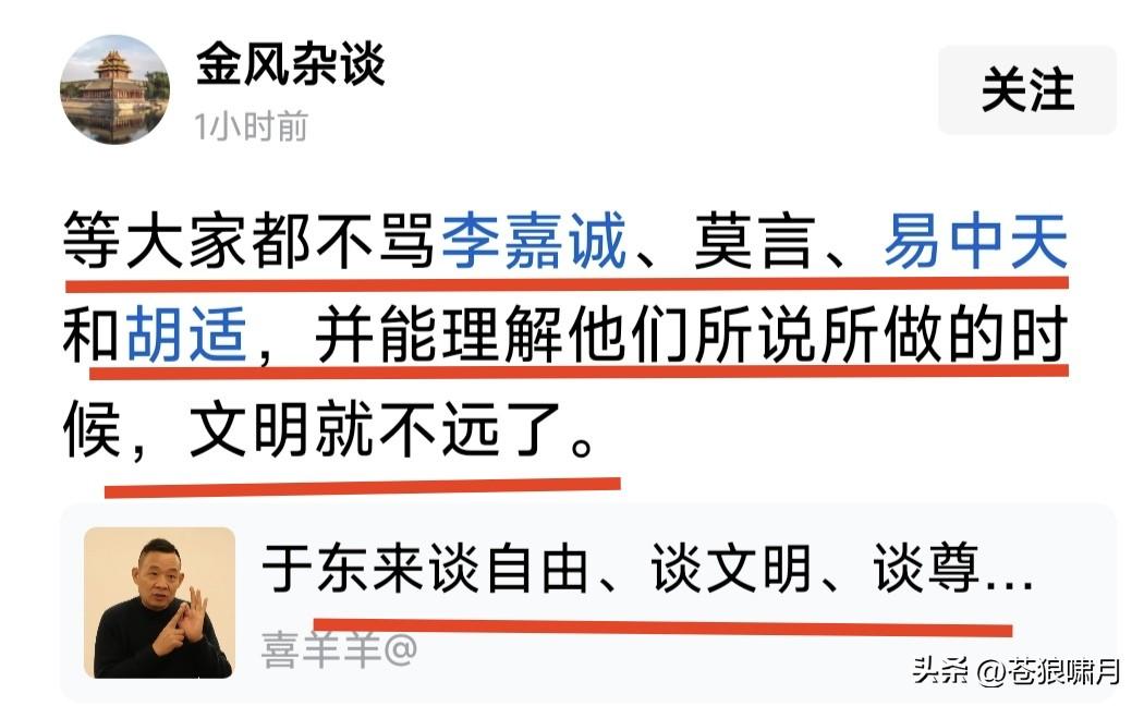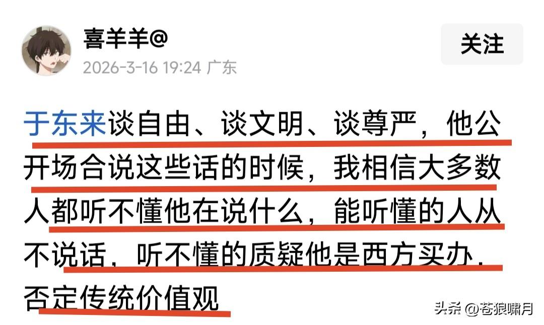 于东来谈文明,谈自由,谈尊严!若他在公开场合讲,多少人能听得懂? 网友评曰:相信听懂的不多!但听懂的人会沉默不语,听不懂的人可能会质疑他是西方买办,否定传统价值观? 苍狼看完网友评论,心中充满伤感,想反驳这位网友,却找不到论据充分的理由!因为他说的现象,很有可能。 但我仍然不认可老于,关于“中国走向文明,需要1000年”的说法!但到底需要多少年呢?网友有说200年,有说30年。苍狼觉得很快就会到来! 什么是文明的标志?我想实现“核心价值观”的那些内容就是了吧!当然要实现这些,需要我们努力践行! 也有网友说:等到大家不骂李嘉诚和莫言,易中天和胡适,理解他们所说所做的时候,我们离文明就不远了! 苍狼觉得说的也对!大家觉得呢? …………