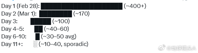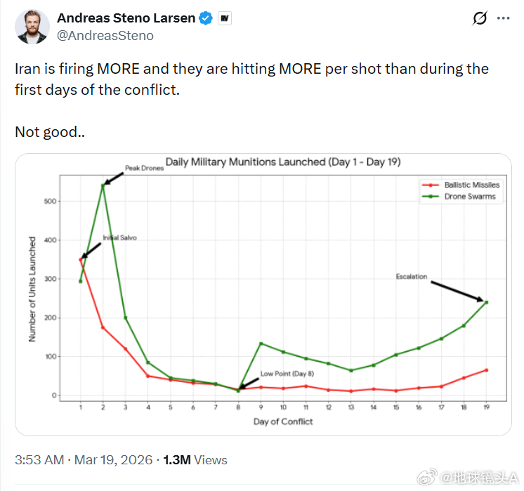 美以伊冲突 发射车没几辆了。。导弹可能见底了。。导弹库快被炸没了。。发射数量每天就个位数了。。发射数量一天比一天少了。。真相:简中键砖又被打脸了。。。老外的统计,“伊朗正在发射更多的(导弹和无人机),而且他们每次射击的命中率比冲突初期更高。情况不妙……”