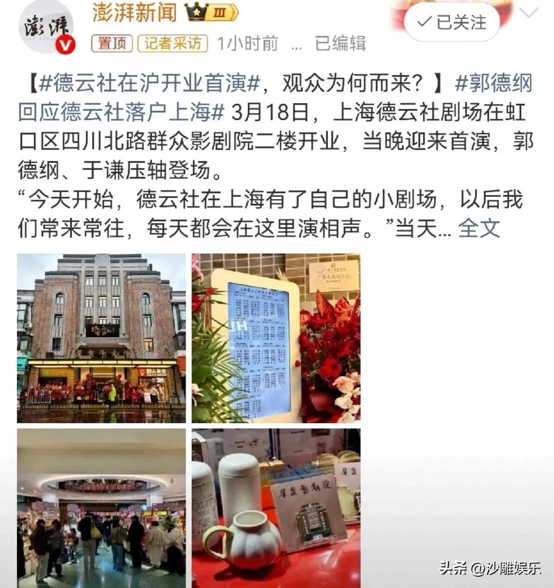 郭德纲,一出手就是王炸! 3月18日深夜,郭德纲又冲上了热搜。这一次,不是因为段子,也不是因为绯闻,而是因为他心心念念了快20年的“上海梦”,终于在四川北路的老巷子里落了地。 那天上海下着雨,但如果你在现场,可能会怀疑是不是误入了某个顶流演唱会的现场。天还没亮透,就有粉丝从北京、陕西、福建、湖北打飞的赶来,早上9点,群众影剧院门口已经长满了人(不是夸张,是真的人山人海)。雨水顺着伞边滴答,愣是没人肯走。本地的毛阿姨更是从宝山“乘风破浪”而来,就想看看这个让上海宁抢票抢到“手忙脚乱”的地方,到底藏着什么宝。 说起这座群众影剧院,老底子上海人心里可都是白月光。这可是有着98年历史的广东大戏院旧址,当年粤剧名家红线女曾在此包场演出。谁能想到,近一个世纪后,这里没有变成冷冰冰的商场,反而挂上了黑底烫金的“德云社”牌匾 。 下午的剪彩环节还出了个小插曲。当郭德纲、于谦领着大队人马准备揭开红绸时,大家突然发现:哎?秦霄贤、周九良、烧饼人呢?原来这几位爷愣是没赶上场外剪彩。郭德纲也是real耿直,当场锐评:“就不是开业的命。” 一句话把台下粉丝逗得前仰后合,这现挂的功夫,真是刻在DNA里了 。 晚上7点半,重头戏开场。郭德纲、于谦压轴,岳云鹏、孙越接力,这阵容豪华到什么程度?网友神评:“这哪是开业,这是把封箱演出搬上海来了。” 据统计,5天总共9场演出的票,在开票后短短4分钟内就被“洗劫一空” 。抢到票的河南姑娘李响,直接把这一天当成了自己的成人礼。她特意选在18岁生日这天来打卡,从小喜欢秦霄贤的她,终于圆了儿时的梦 。 没抢到票的湖北姑娘星星虽然只能在场外淋雨,但她一句话说得特别好:“相声得有新鲜血液,你看秦霄贤、孟鹤堂他们,让多少年轻人从看脸变成了听活儿。” 如果你以为德云社只是听相声,那就格局小了。一楼搞的那个文创市集,简直是把“南北融合”玩明白了。 有个卖果壳饰品的摊主乔乔,专门设计了扇子、话筒元素的小挂件。但最绝的是一款文创杯——“大蒜咖啡杯”。 工作人员解释得很有意思:“北方人吃蒜,南方人喝咖啡,所以我们有大蒜咖啡杯。” 这不光是杯子,这是郭德纲的生存哲学:不跟你谈水土不服,我就用你的杯子,装我的蒜,最后喝出大家都爱的味道。 站在台上,郭德纲感慨万千:“在上海商演快20年了,今天总算在这儿安了家。” 在他看来,上海观众懂相声、爱相声,未来这里或许会开出第二家、第三家,甚至四五家分社 。 说实话,之前很多人担心,北方的相声到了上海会不会“水土不服”?毕竟这里有绵软的滑稽戏,有精致的海派文化。 但郭德纲这步棋下得妙。他选了一座98岁的老戏院,用最传统的“园子味儿”,去泡最现代的“魔都青年”。这里的笑声没有南北之分,只有开心不开心。 看着毛阿姨那样的本地老人,和那些为了秦霄贤尖叫的小姑娘在同一个屋檐下笑出声,我突然明白:所谓文化传承,不是写在课本里,而是让98岁的老建筑里,依然能传出18岁的笑声。 这大概就是德云社送给上海最好的见面礼。