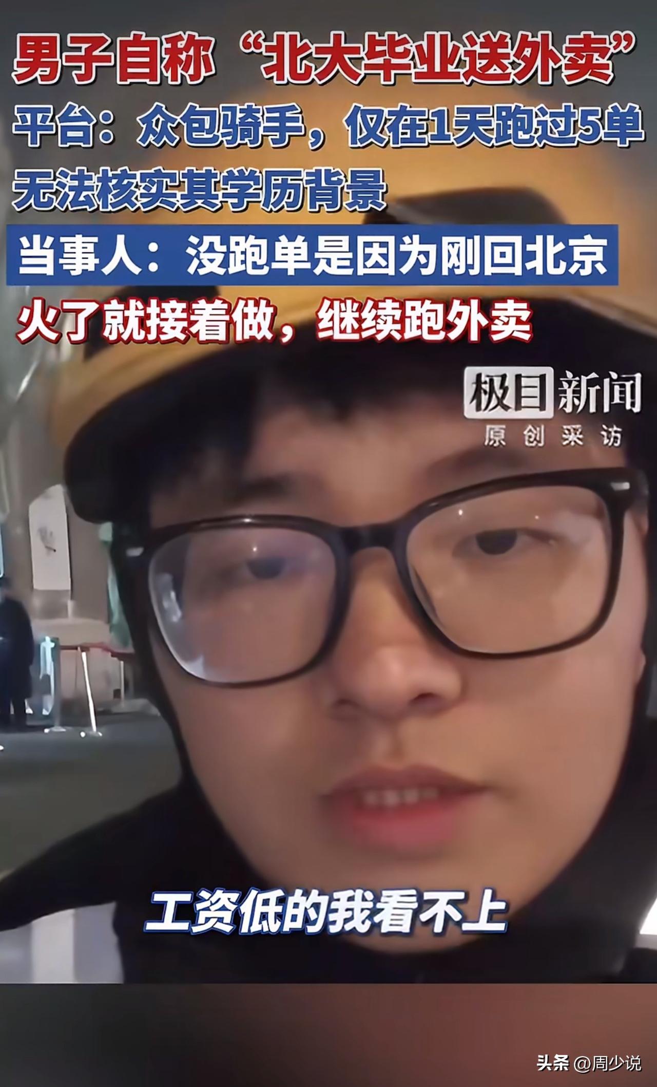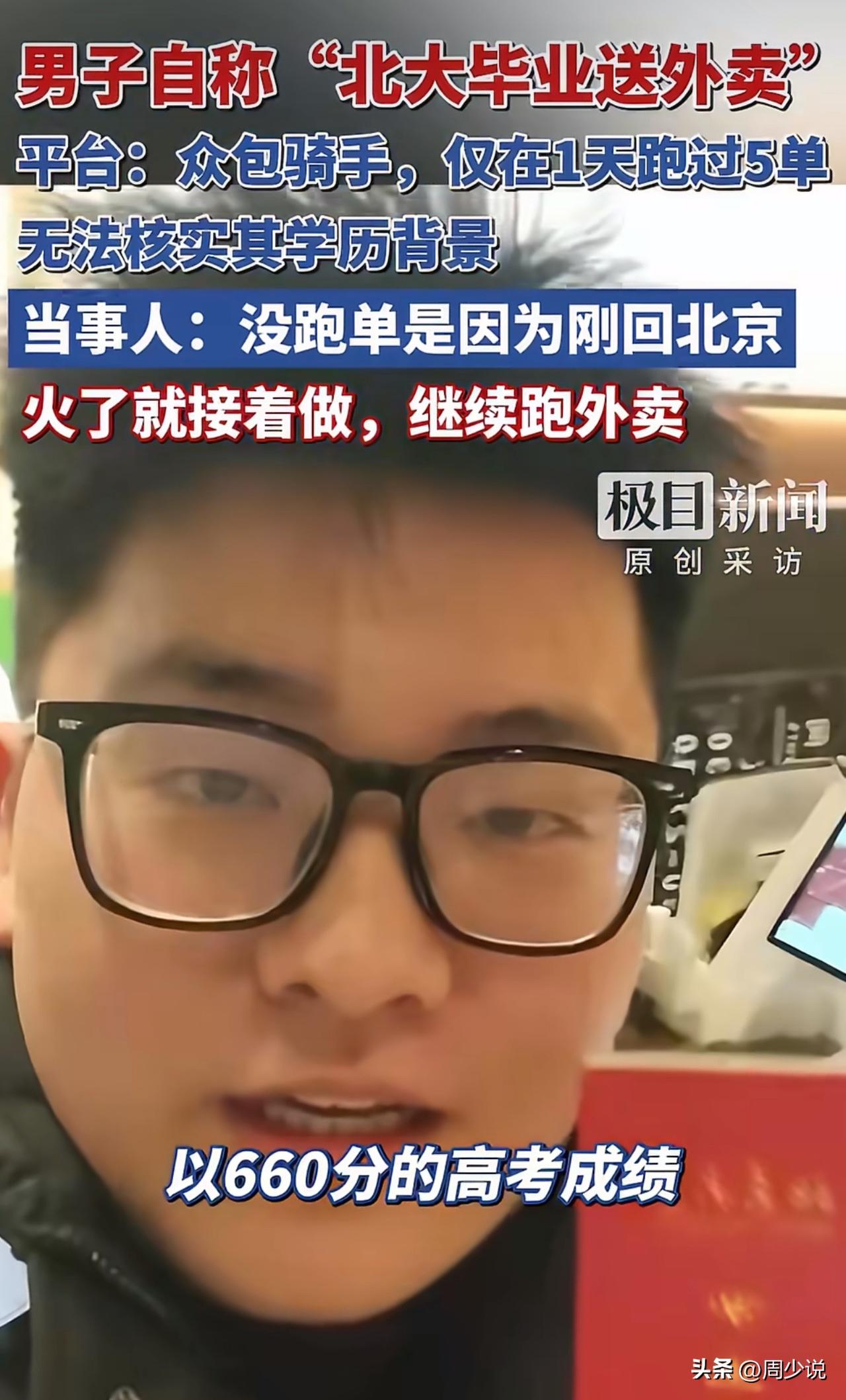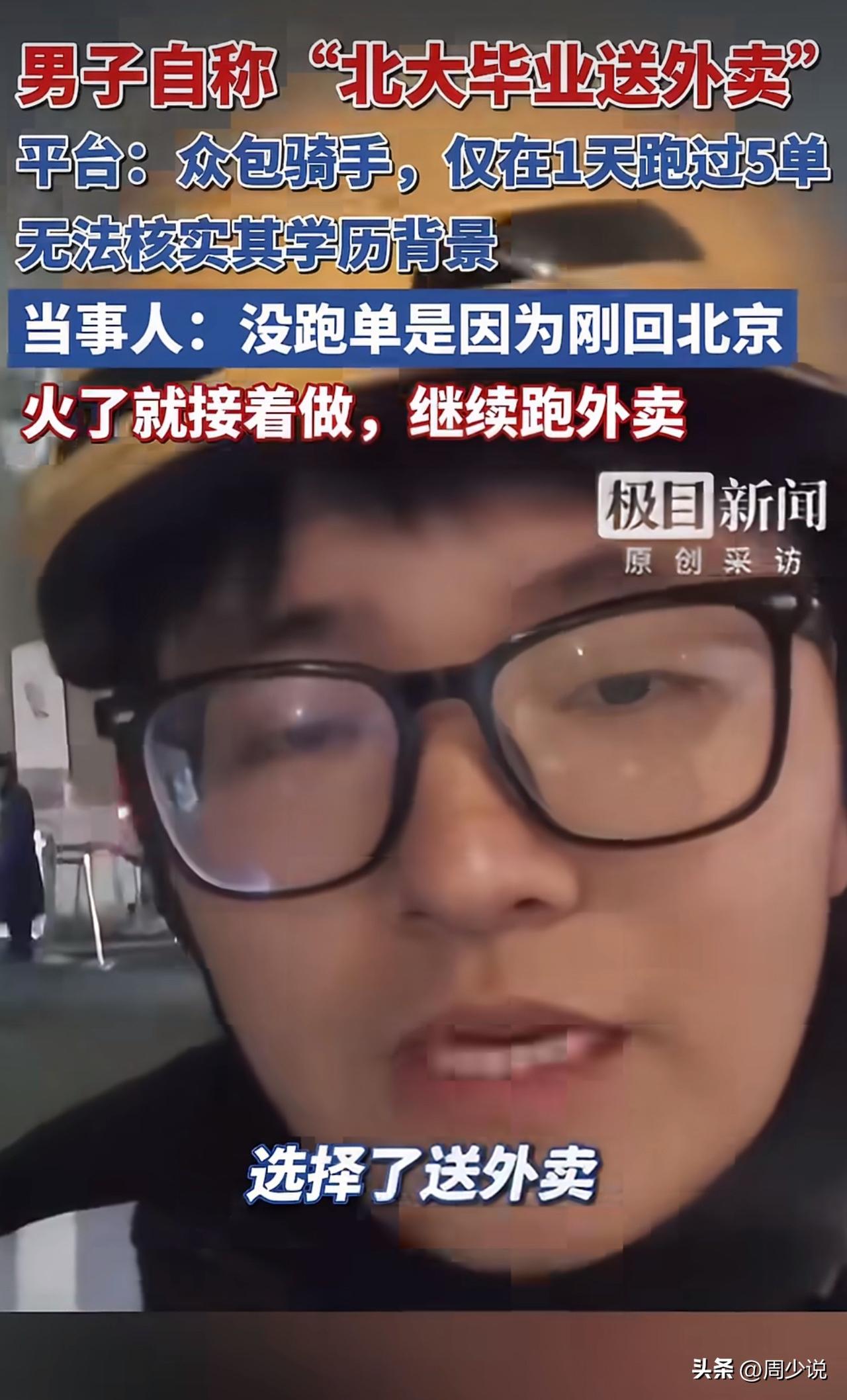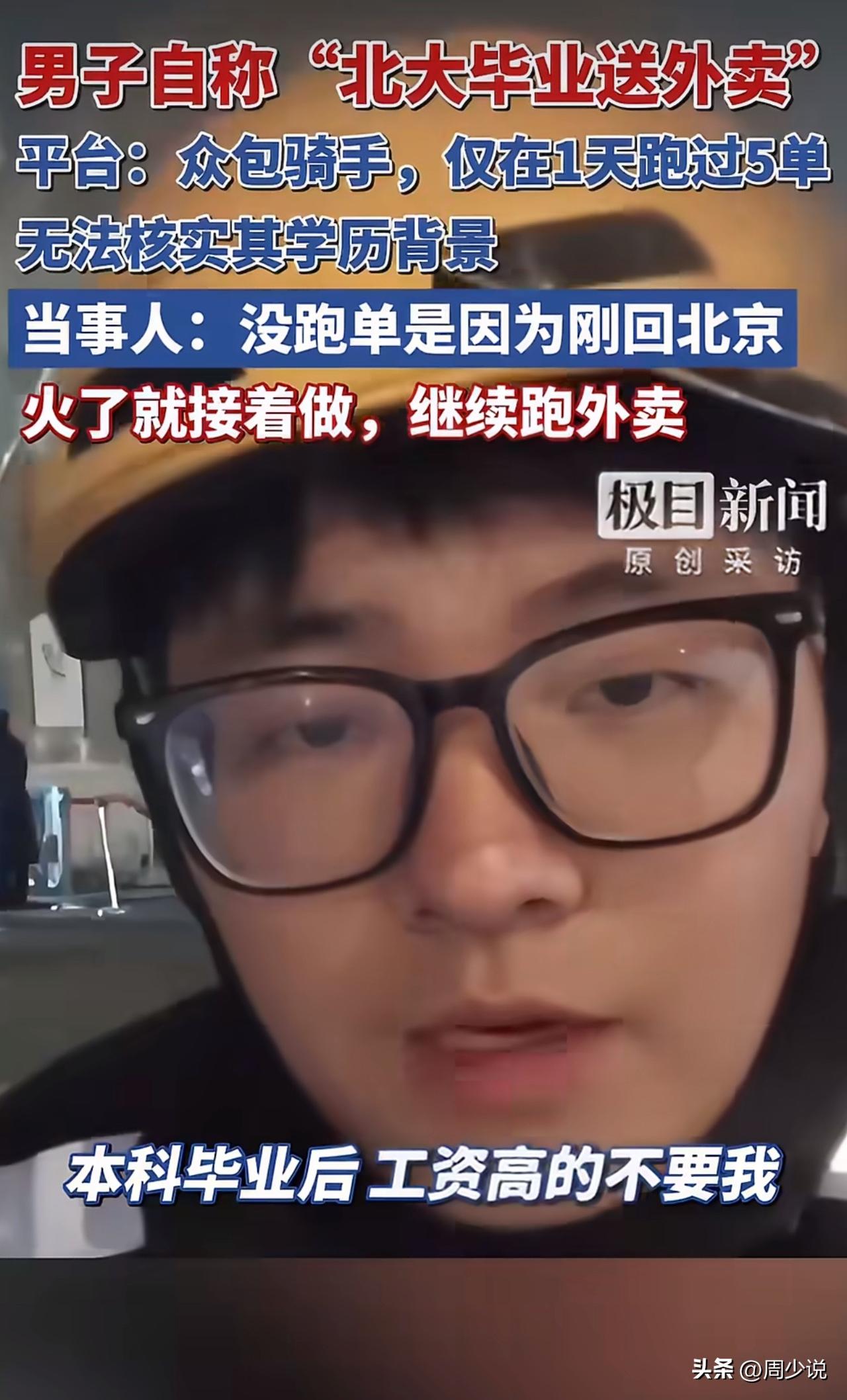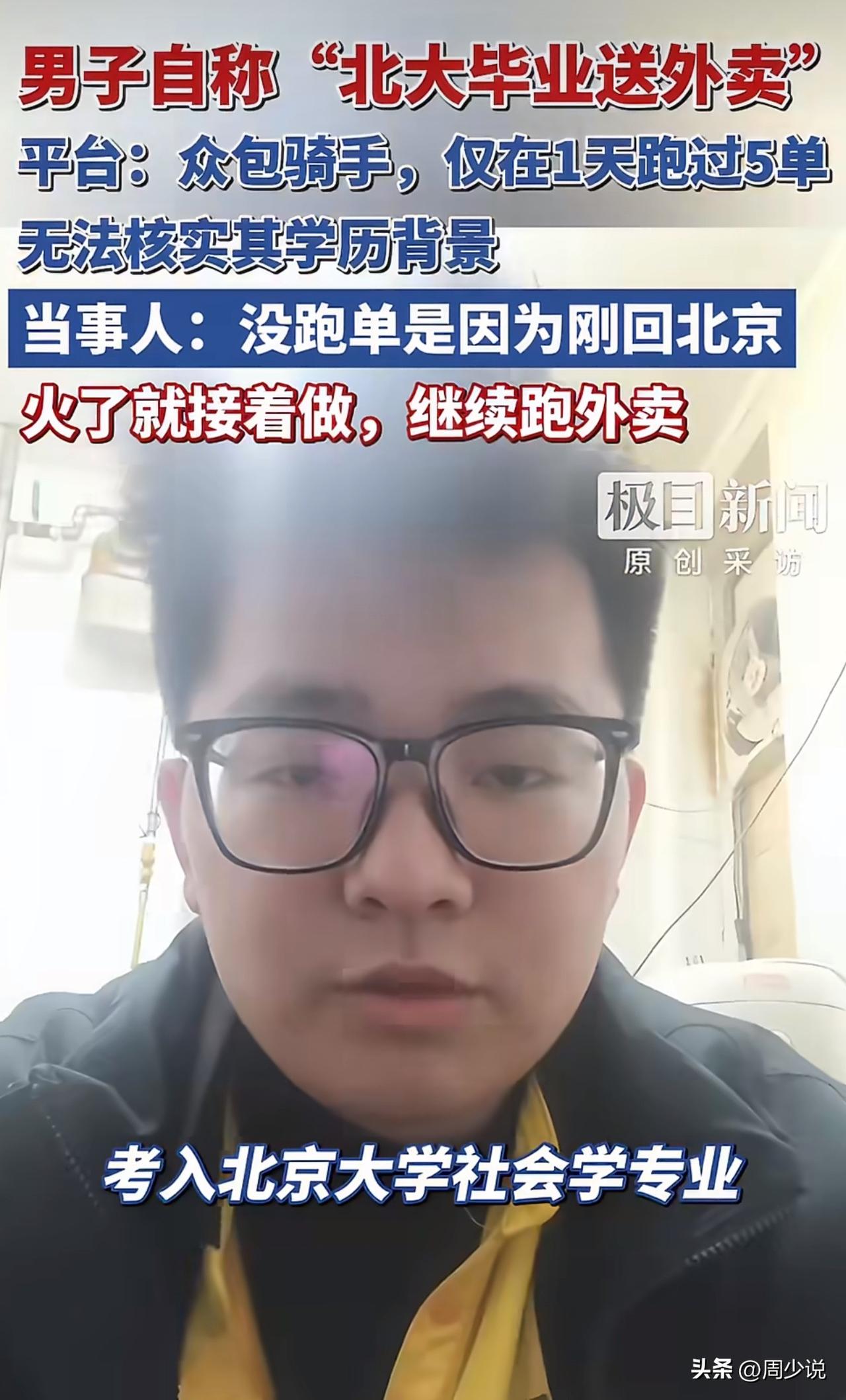 “啪啪打脸!”近日,一位自称北大社会学毕业的男子,拍视频说自己毕业后求职碰壁,在家闲了半年,最后无奈送起外卖,还坦言自己眼高手低、专业没选对、没实习经历,这番话瞬间火上热搜。 可没等大家共情完,官方直接泼了盆冷水。核查显示,这位男子去年12月初注册众包骑手,只在12月9日跑了5单,之后再没接单记录。平台也说,骑手注册不用验学历,没法核实他的北大身份。 更有意思的是,视频火了没多久,他就删掉了原视频,面对质疑只说“刚回北京”,匆匆挂了记者电话。 对于男子北大毕业选择送外卖,网友也是看法不一。有网友直言:“名校标签一贴,流量就来了,真没必要消费大众的同情心。” 也有人感慨:“就算真送外卖也不丢人,但拿学历演戏,就有点过了。” 看完这事,周少想说,这事儿哪是简单的“名校生送外卖”,明明是一堂扎心的成长课。名校光环从来不是铁饭碗,大学里少几分空想、多落地实践,毕业时或许就少些高不成低不就的尴尬。 眼高手低、逃避规划,哪怕拿着好学历,也很难在社会里站稳脚跟。就像这位男子一样,其实说的很真实,薪资高的不要他,薪资低的他看不上,导致不上不下,处境异常尴尬。 我们不歧视任何职业,也尊重每个人的人生选择,但别把学历当流量密码,更别用虚假故事制造焦虑,这就有点过分了。 对年轻人来说,与其靠标签博眼球,不如踏踏实实打磨自己;对围观者而言,遇到高学历反差故事,多留一份理性判断,别轻易被情绪带着走。 毕竟,真正的体面,从来不是学历,而是脚踏实地过日子的底气。#寻美三湘# #周少说教育# #寻美湖南#