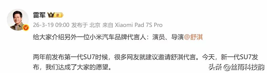 不得不服了,雷军真是会玩!3月19日,小米汽车官宣舒淇成为品牌代言人,当晚7点新一代SU7同步发布,消息刚出来就引来不少讨论。这场玩梗成真的合作,比单纯的官宣更有料。 两年前初代SU7发布时,网友就因“SU7”与“舒淇”读音相近提议合作,如今借新车上市契机“达成大家的愿望”,雷军的文案直接拉满好感。苏炳添主打性能与速度,舒淇则以优雅从容的气质,凸显新车的舒适质感与高端定位,覆盖不同消费群体 。应该说,雷总的玩法很有创意。 今晚要发布的新一代SU7,算是小米汽车上市之后一次重要的更新。不是小修小补的改款,而是在大家最关心的智能驾驶、续航、用车体验等方面做了优化,也是小米在造车这条路上,对产品的一次实际调整。 从一开始入局造车,到首款车交付,再到现在更新换代、签下新代言人,小米汽车一直处在舆论焦点。比起代言人是谁,大家更在意的还是新车好不好开、够不够实用、能不能稳定交付。 舒淇和小米汽车的搭配到底合不合适,新一代SU7能不能接住市场期待,今晚的发布会就能见分晓。看来今晚该好好蹲守一下了。