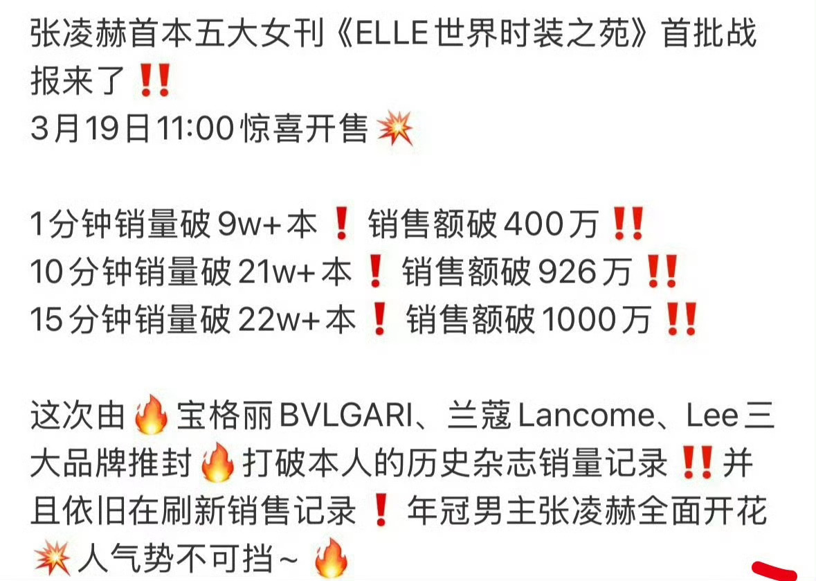 张凌赫首本五大杂志elle四月刊销量出来了,15分钟22万本,目前销售额破千万了