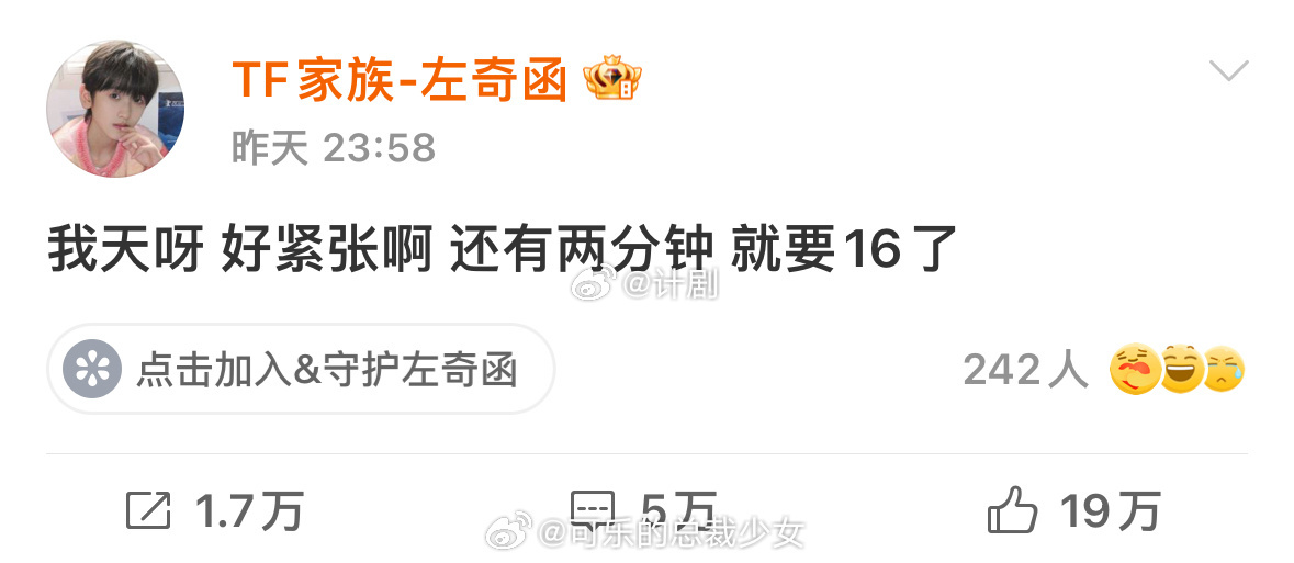 期待左奇函16岁的单人cha 16岁是新的起点也是新的开始,希望你平安快乐健康顺遂,在喜欢的路上越走越远,大家已经搬好小板凳,期待左奇函16岁的单人cha。