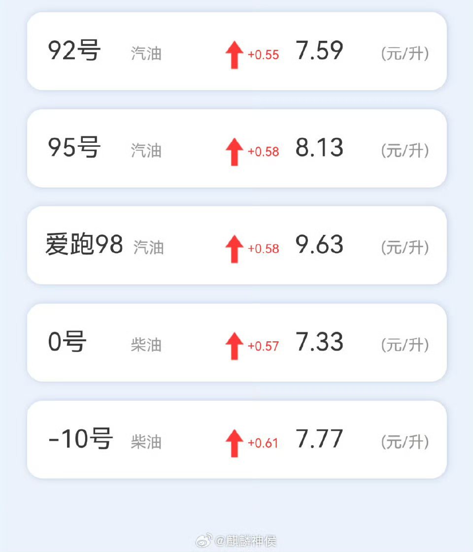92号汽油:现在约 7.61元/升,预计每升上涨 1.60元,折算下来差不多就是9.21/升;
