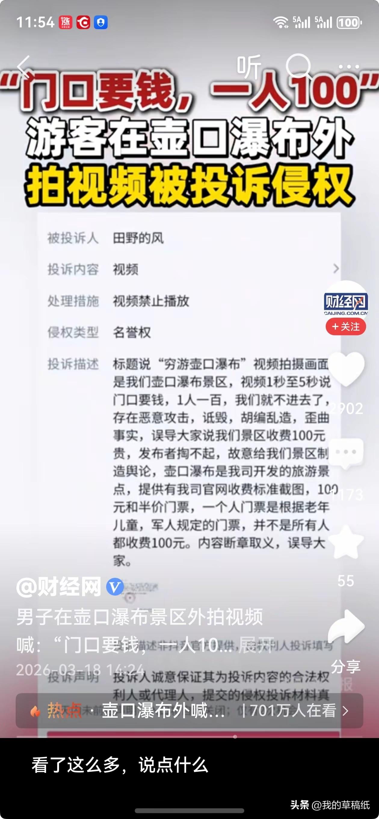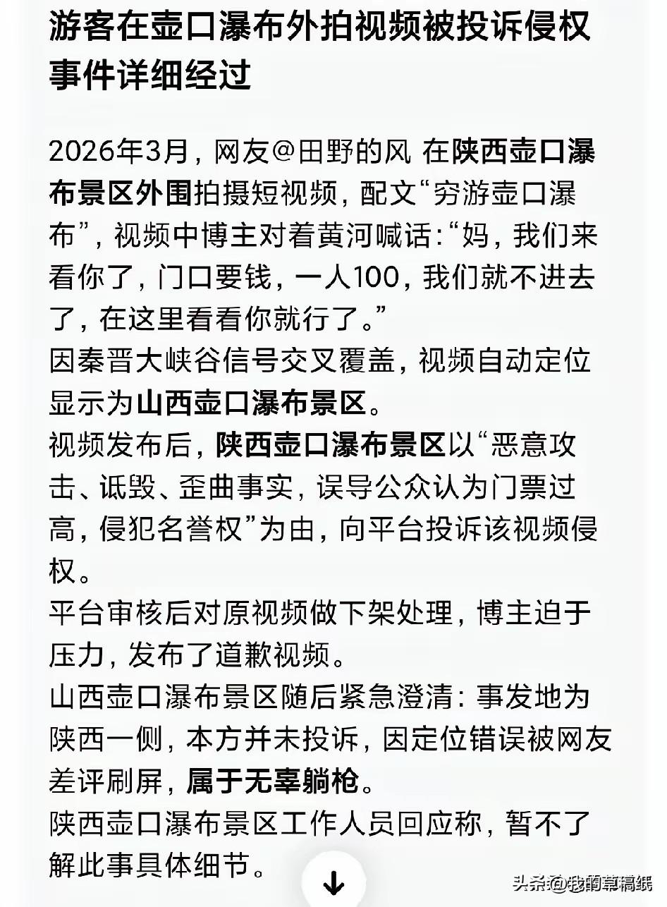 门口收费100元,对着黄河喊声妈,竟被投诉侵权,游客被逼道歉太委屈! 谁能想到,对着黄河喊一句妈,还能惹上事? 最近这段视频真的看破防了。游客在壶口瀑布外,对着黄河喊:“妈,我们来看你了,门口要钱一人100,我们就不进去了,在这看看你就行。” 就这么一句大实话,竟然被景区投诉侵犯名誉权。 更让人无语的是,游客还被逼着发了道歉视频。 景区说人家歪曲事实、恶意攻击,还强调这是“我司开发的景点”,说门票有优惠,不是人人都100。 咱老百姓就想问问,普通人说句门票贵,还得把所有优惠政策背一遍吗? 游客只是说自己的真实感受,没造谣没抹黑,凭啥要道歉? 黄河是母亲河,是大家的,不是某家公司的私产。 出门旅游不容易,赚点钱都要精打细算,吐槽一句票价高,怎么就成侵权了? 这波操作,真的太败好感了。 你觉得游客说门票贵,算侵犯名誉权吗?来评论区说说你的看法!