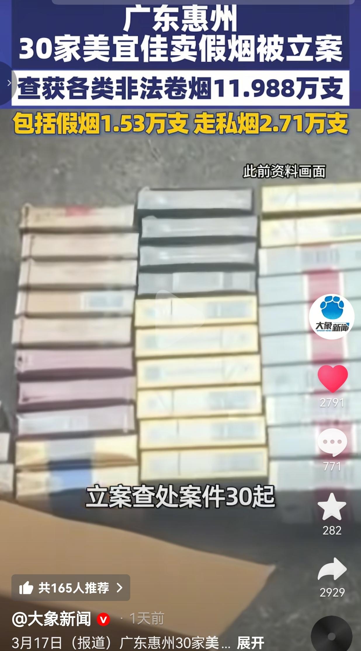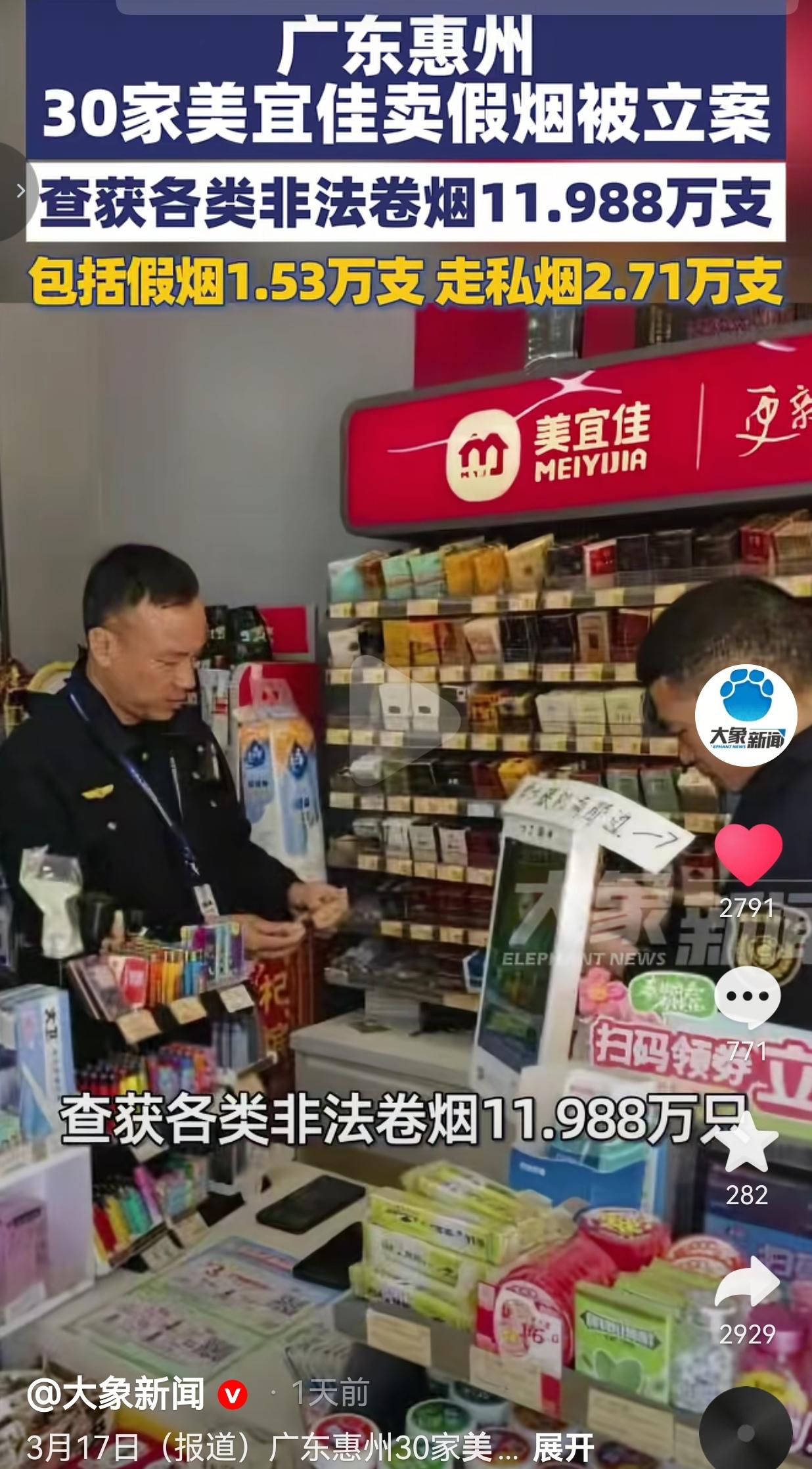 这哪是便利店,这是“坑民店”!3月17日刚爆的料:惠州烟草局拉网式排查了537家美宜佳,光涉案的就有30家! 一共查出来11.988万支非法卷烟,拆开看更吓人:假烟:1.53万支, 走私烟:2.71万支,还有7.74万支“非烟”(说白了就是没正规手续的野路子烟) 更讽刺的是,这537家店里,还有76户是无证经营!连卖烟的资格都没有,就敢把假烟摆上货架,卖给天天来光顾的老熟人! 你早上赶时间买包烟提神,晚上加班买包烟解闷,以为是家门口的放心店,结果人家把你当韭菜割,把假烟当正品卖,赚的全是黑心钱! 网友看到后评论说:“我爸在美宜佳买了好几年烟,最近总说嗓子疼、咳嗽,原来不是他身体差,是烟是假的!这店老板晚上睡得着觉吗?” 也有的网友说:“美宜佳不是连锁大品牌吗?怎么管成这样?是不是只要交钱加盟,卖啥都不管?那我们消费者的安全谁来保?” 也有的网友说:“无证经营还卖假烟,这不是知法犯法吗?必须重罚!必须严查!绝不能轻饶!” 还有的网友说:“最恶心的是‘熟人作案’!天天见面的老板,转头就给你递假烟,这比陌生人骗钱还让人寒心!” 我的心里话:别让“便利店”变成“坑人店” 我真的越看越气!美宜佳打的旗号是“便民、放心”,结果呢?在惠州,这30家店把“便民”变成了“骗民”,把“放心”变成了“寒心”! 你想想,你下班路过,跟老板打个招呼,随手买包烟,以为是生活里的小温暖,结果人家盯着你的钱包,给你塞劣质假烟——这哪是做生意,这是在拿老百姓的健康换钱! 更让人寒心的是,连锁品牌的监管去哪了?537家店,76家无证,30家卖假烟,这不是个别老板的问题,是整个体系的麻木! 是不是只要交了加盟费,就可以睁一只眼闭一只眼?是不是只要能赚钱,消费者的健康就可以被踩在脚下? 最后想说:别让信任,变成被利用的软肋 我们信任连锁品牌,信任家门口的小店,不是为了让他们骗我们的钱、害我们的身体! 今天是惠州的美宜佳,明天会不会是你家楼下的便利店? 别让“方便”变成“风险”,别让“熟人”变成“仇人”,别让我们最后连买一包烟的安全感都没有! 信任是最值钱的东西,一旦被碾碎,再想拼起来,比登天还难! 对此,你怎么看? 信息来源:大象新闻