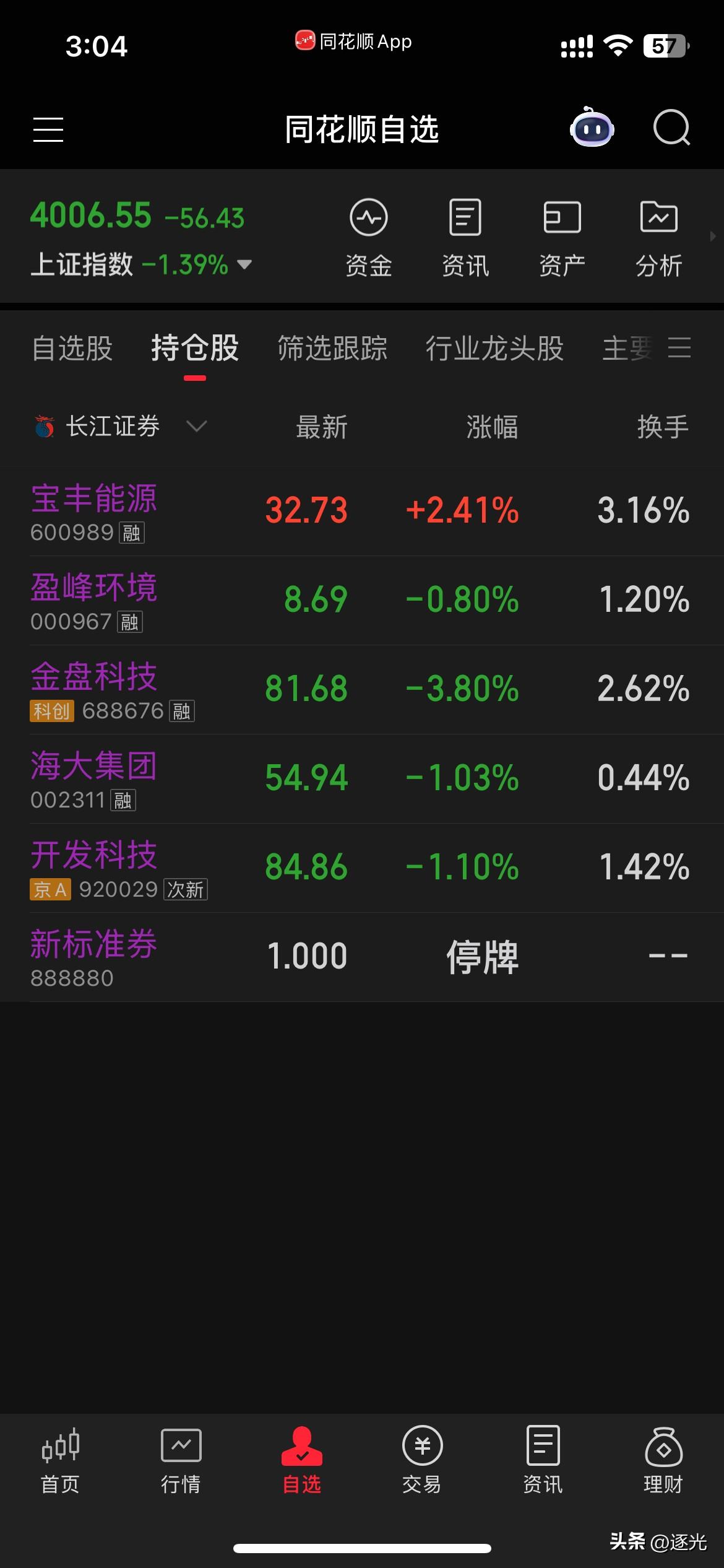 股市已经来到了冰点,今天一路下挫。尾盘逼近4千点,大金融板块奋起上拉护盘,最终也是被汹涌的卖盘吞没了。随着4千被攻破,个股也是跌得面目全非。尾盘护盘资金勉强收复了4千点的失地。大盘k线出现了难看的破位趋势。我今天下午买了盈峰,开盘补了点宝丰,下午补了金盘。收盘跌1千块左右,仓位3成不到。今天多亏宝丰。 明天是股指交割日,不会又是凶多吉少吧[捂脸]
