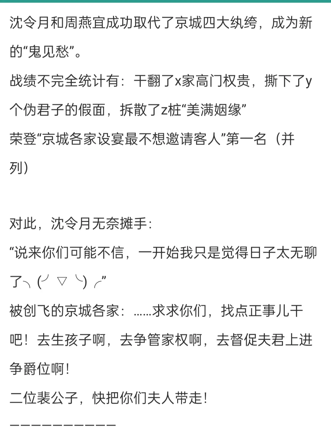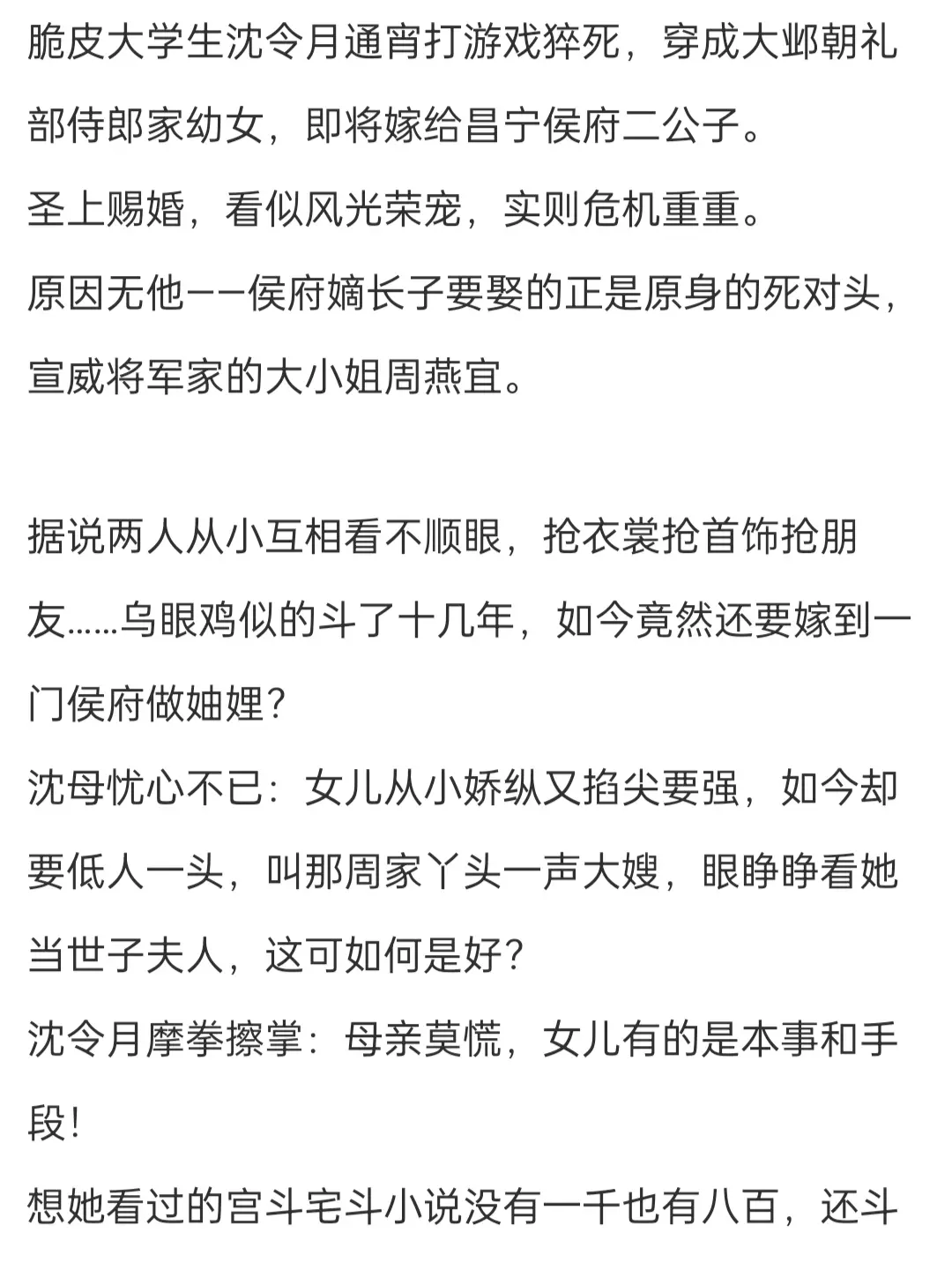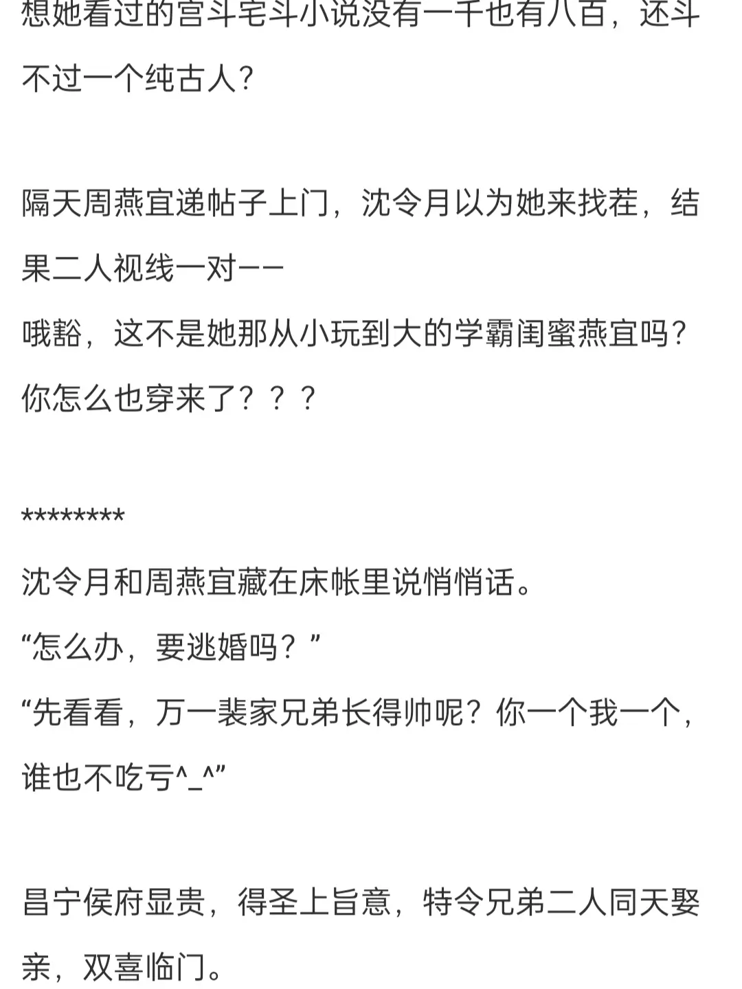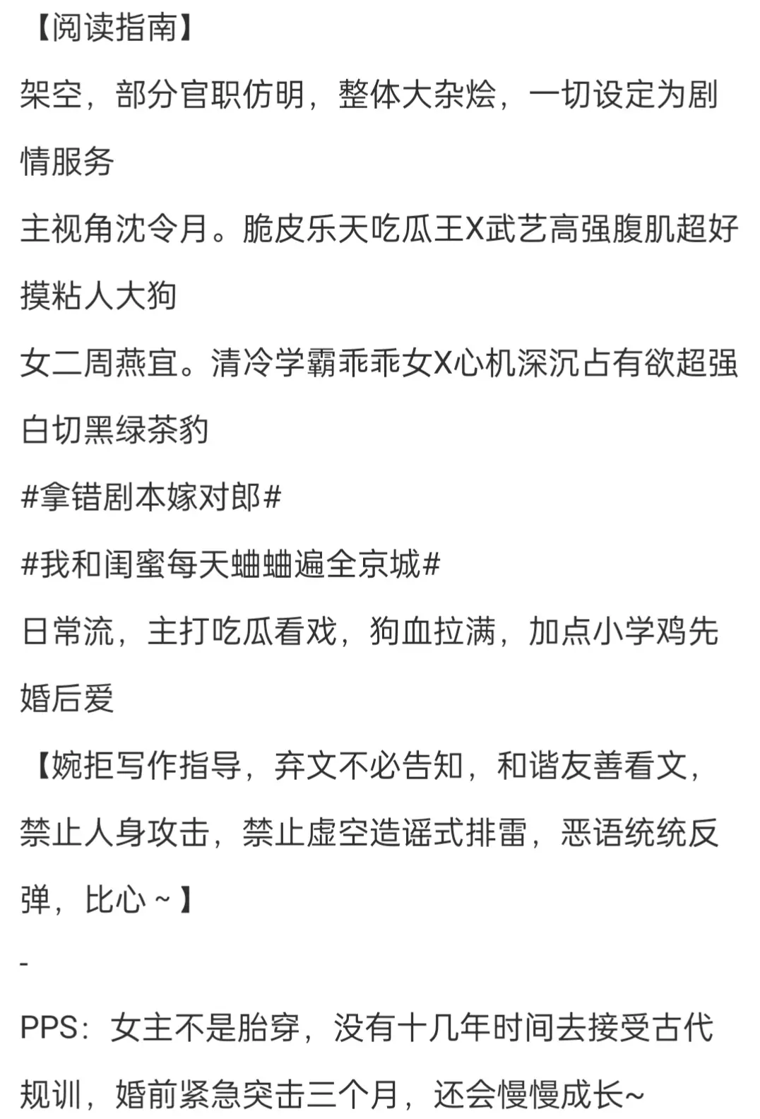 闺蜜如手足,男人如衣服。非常喜欢读心文,正如作者在阅读指南中说的,是成长型女主,所以前期的话会觉得女主有一点点不讨喜,但是如果喜欢复印的设定还是非常建议去看的,特别是这个和闺蜜一起穿越~