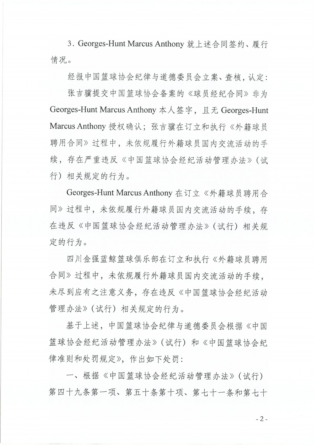 外援马库斯·乔治-亨特在签约过程中未依规完成国内交流手续,存在违规行为。