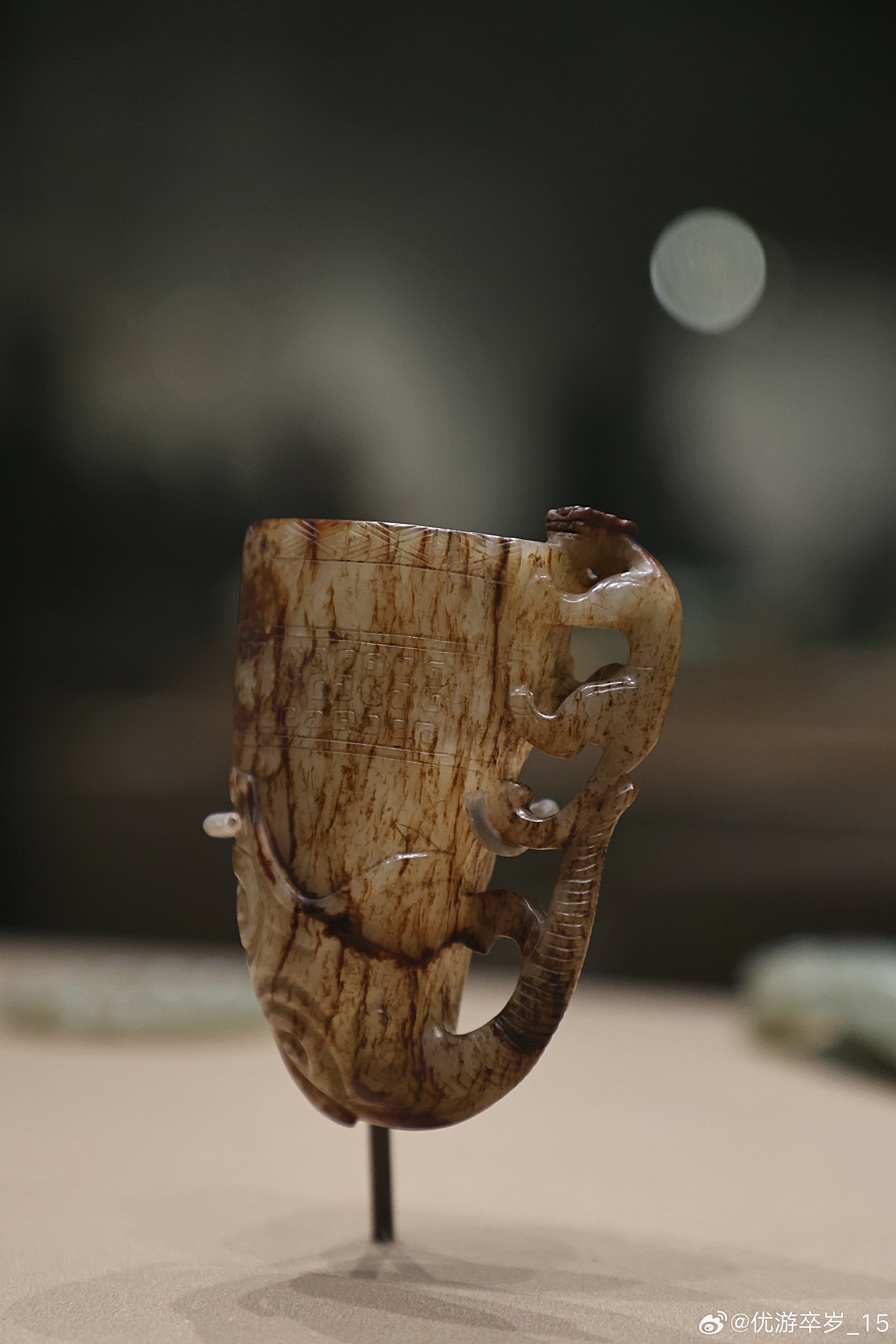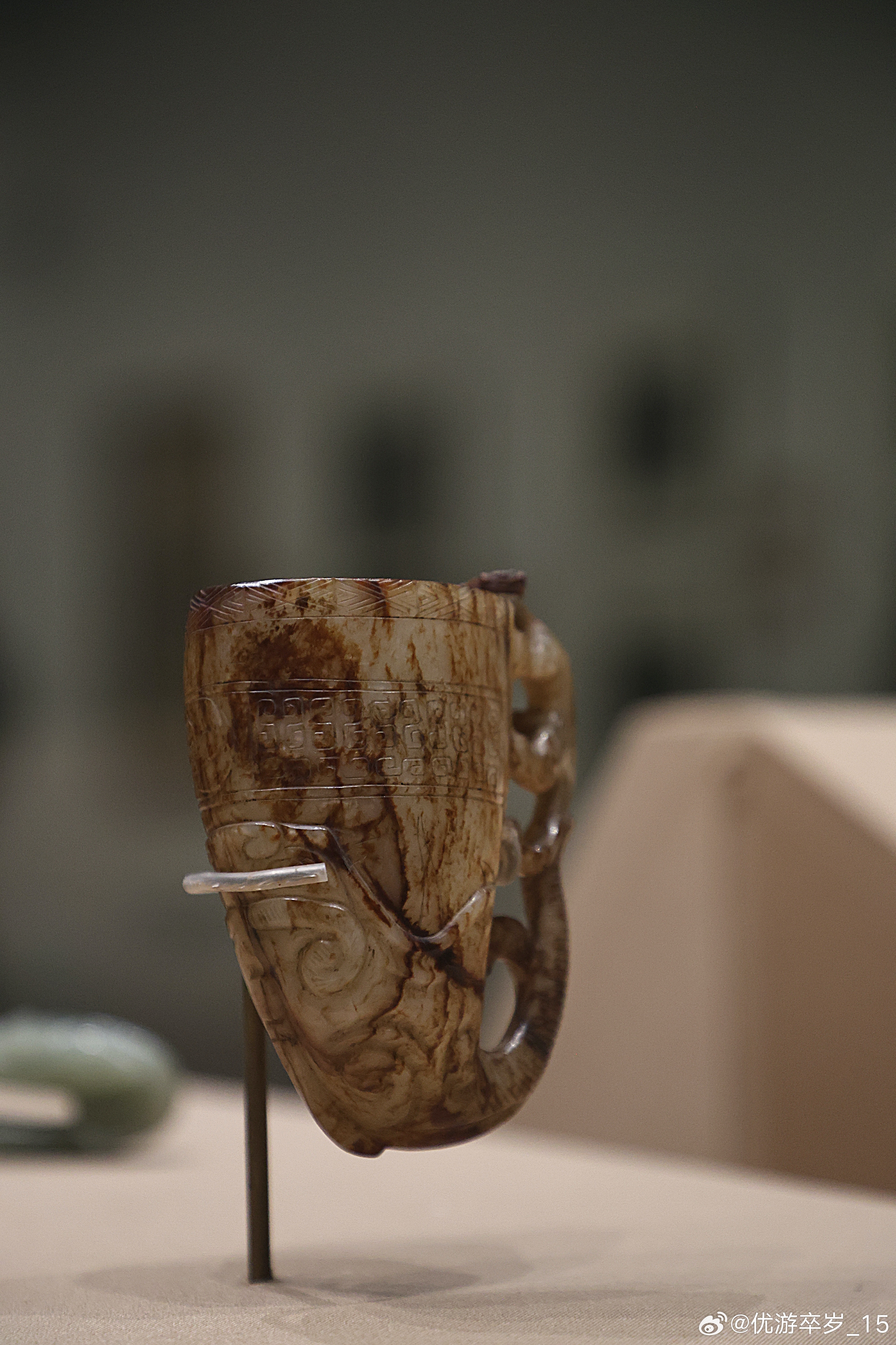我的2026 【中国之中-中原古代文明精粹】 角形玉杯明 (公元1368-1644年)驻马店市博物馆藏新蔡县出土。充分利用犀角的天然弧度,杯侧攀附镂空螭虎形柄,躬身探首,螭虎口衔杯沿,身与杯体间透雕虚空,既威仪又实用。清华大学艺术博物馆展出2026.2.8约会博物馆文物