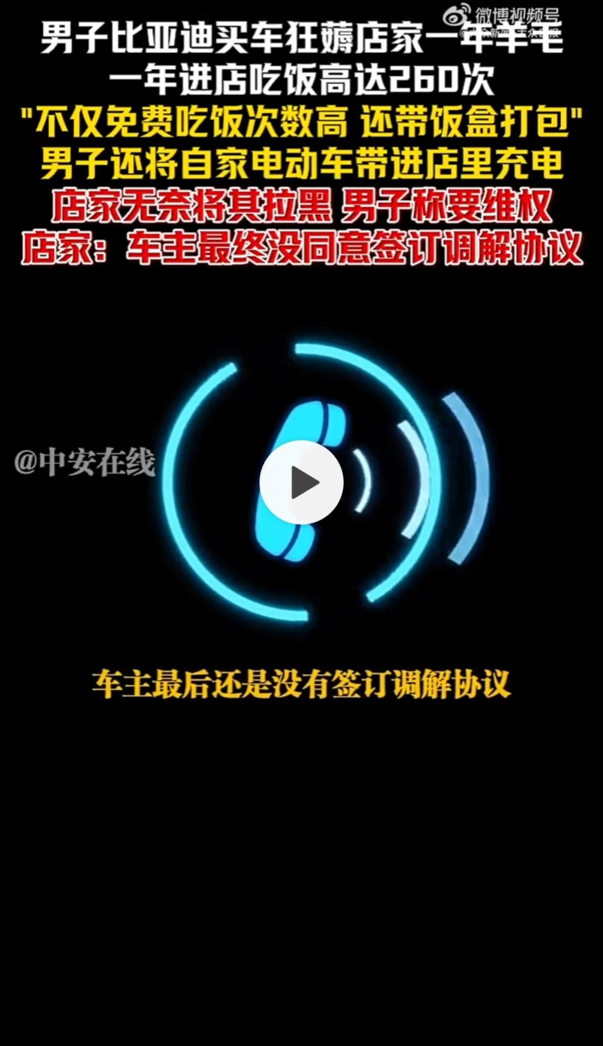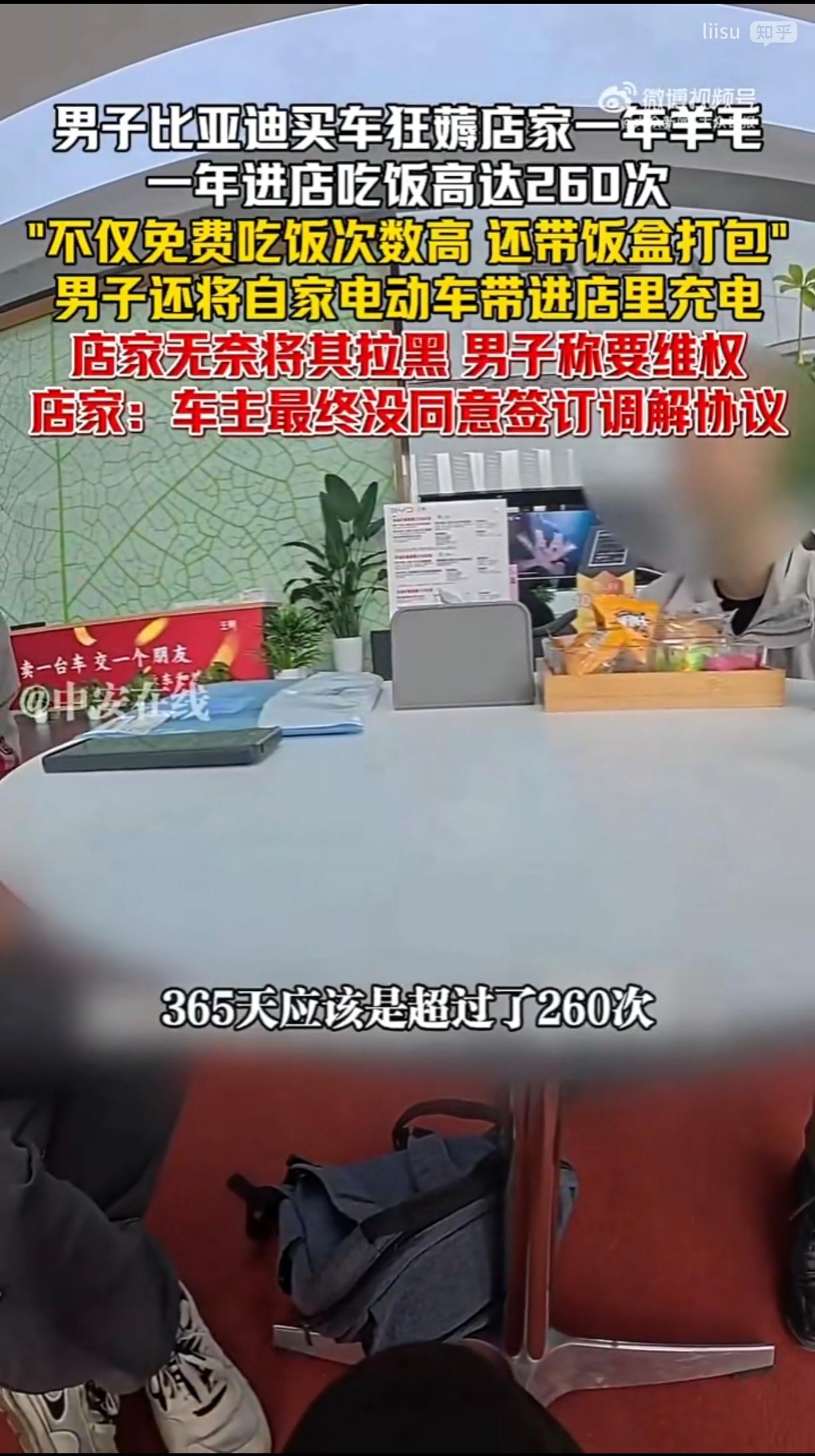 一年蹭饭260次、电动车也来充电!4S店拉黑反被维权:薅羊毛的边界到底在哪? 买车送免费餐食、充电本是4S店的暖心服务,没想到竟被一位车主“薅”到极致:一年到店吃饭超260次,还打包带走;把家用电动车藏后备箱,占用员工充电区;被拉黑后扬言要维权,多次冲突甚至报警。这事最近刷屏,网友吵翻:到底是车主太贪心,还是商家该认栽? 先厘清核心:免费福利≠无限滥用,维权≠无理取闹。 4S店的免费餐、充电,是面向到店办理业务车主的配套增值服务,初衷是提升体验,不是“长期免费食堂+公共充电站”。一年260多次就餐、违规占用资源,早已超出合理使用范畴,违背诚实信用原则,也构成民法典里的不当得利。商家为保障正常经营、保护其他车主权益,拉黑止损,合情合理更合法。 很多人疑惑:薅羊毛的边界到底怎么划? ✅ 合法边界:按规则享受公开优惠、正常使用配套服务,不恶意占用、不扰乱经营。 ❌ 越界红线:高频滥用、打包外带、占用非客户资源、闹事扰序、反复投诉要挟,本质是权利滥用,严重的还可能涉及违法。 商家该如何守住底线、合法应对? 1. 事前明规则:门店醒目公示服务细则,明确免费餐仅限本人堂食、充电限本店车辆、频次合理,不做模糊承诺。 2. 事中留证据:记录使用频次、沟通提醒、冲突过程,必要时书面告知停止滥用。 3. 事后敢止损:对恶意占用者,依法终止服务、纳入合理黑名单,不纵容、不妥协。 消费维权受法律保护,但贪心不能当权利,钻空子不该成常态。商家的善意,不该被无底线消耗;消费者的便利,更要守得住分寸。 你觉得4S店拉黑合理吗?欢迎留言讨论👇 4S店蹭饭260次被拉黑 薅羊毛边界 消费维权 民法典